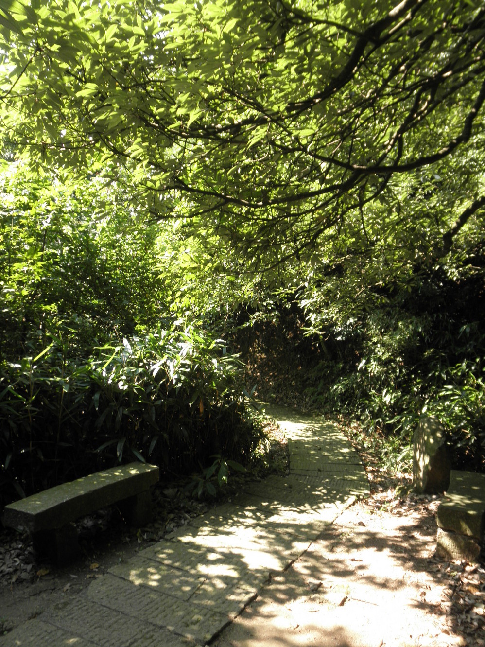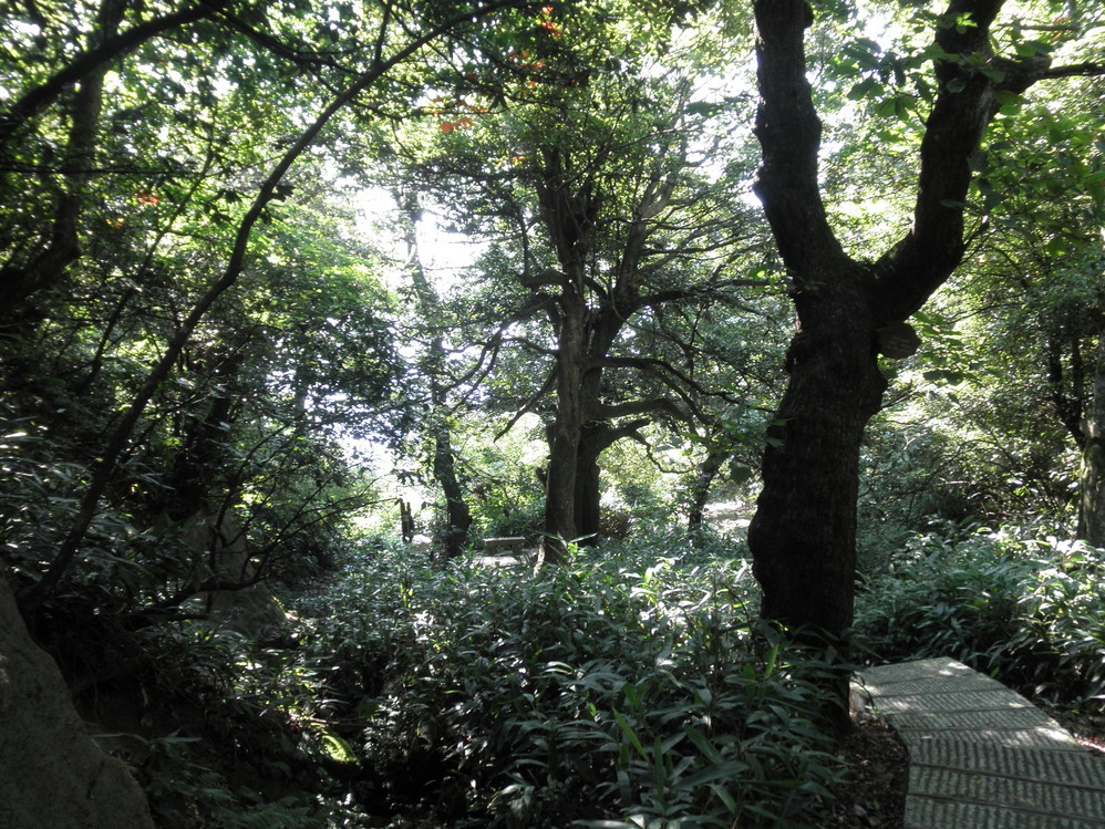 走进树林,惊起一片虫子,石板小路满是青苔,可见这里的潮湿。除我们外没有第三个人,仿佛是不速之客,蚊虫迅速围过来,在我们身旁飞舞叫嚣。赶紧拿出强力清凉油,把脖子胳膊腿全都抹了一遍,效果杠杠的,到我们出了这片树林也没有被叮咬。