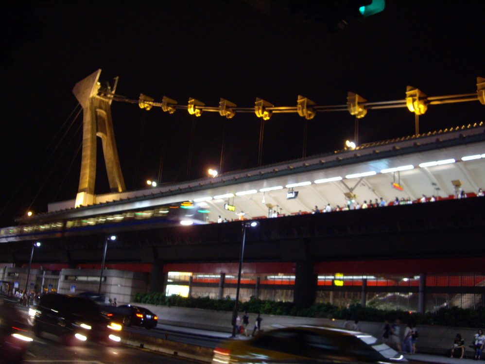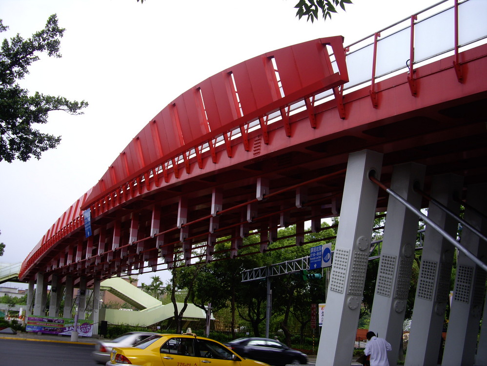 這是綿延十公里的中山 北路有史以來第一座人行天橋??不用懷疑, 中山 北路有史以來都沒建過天橋, 只有行人穿越的地下道, 原因在於當初兩蔣時代的"總統官邸"位於中山 北路七段的士林, 而上班的總統府位於中山 北路一段附近重慶南路上, 為保安起見, 就只有地下道而沒有設置行人天橋了,這次花博時,為方便兩個園區往來, 才建了第一座天橋.