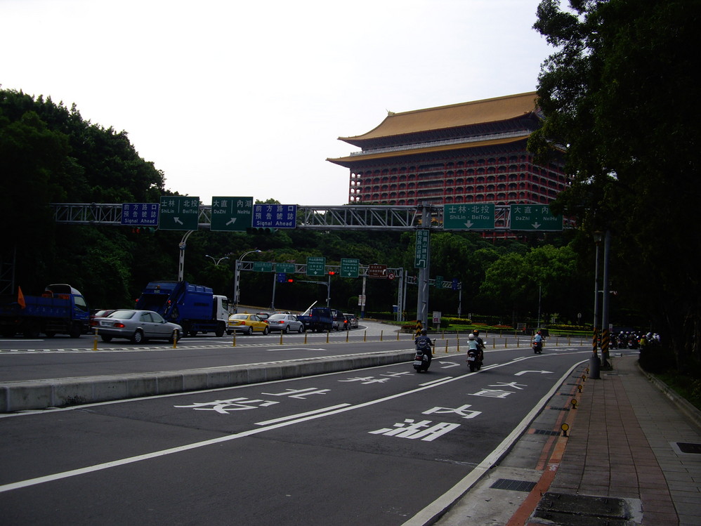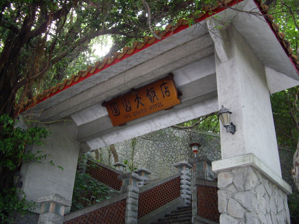 回頭往市區方向看, 還可看到飯店的牌樓, 在台北 , 有如此宏偉招牌的飯店, 僅此一家, 別無分號.近日飯店為吸引遊客, 還接受預約, 主要是住宿遊客(不分本地或外籍), 都可預約參觀當年為蔣介石而建的緊急疏散密道.