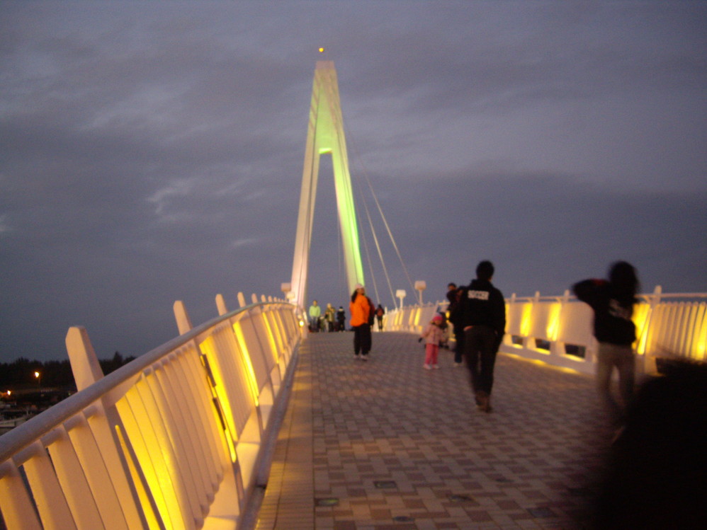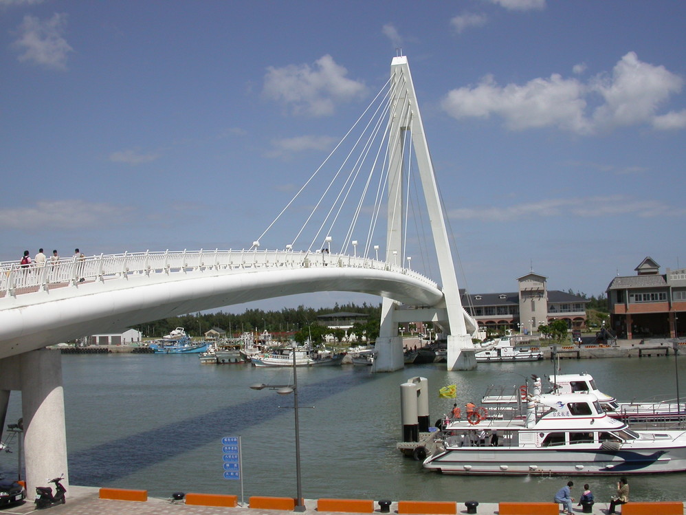 淡水 漁人碼頭位於淡水 河出海口 右岸,舊名淡水 第二漁港,東連大屯山脈、西隔淡水 河與觀音山相望, 行跨海大橋:是一座流線彎曲造型的單面斜張橋,橫跨港區,大橋就像一面白色風帆,傳遞著一帆風順的祝福.