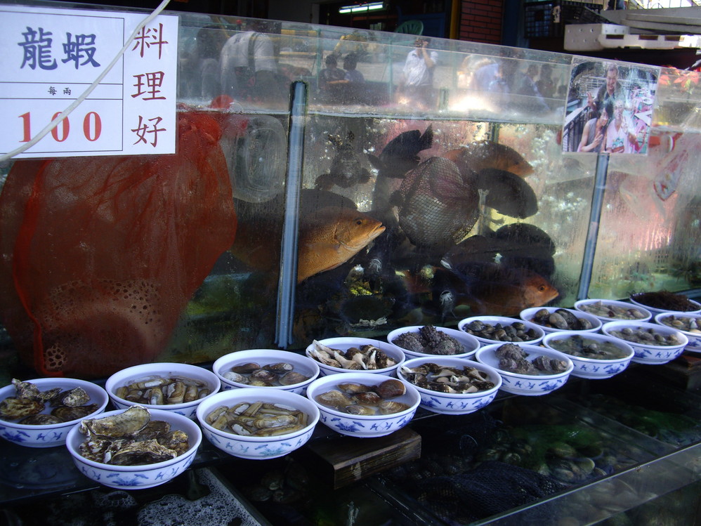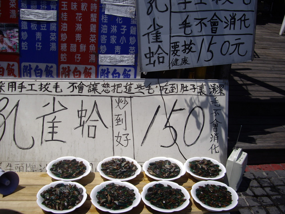 孔雀蛤是淡水 河的名產, 在左岸的八里也可吃得到, 商家擺出來是這麼大盤, 但我覺得實際上份量少很多, 但算算也不貴, 還可稱上物美價廉.