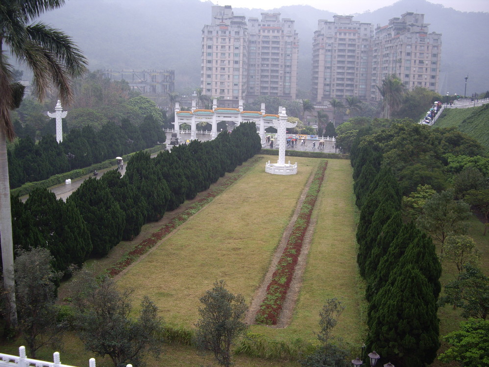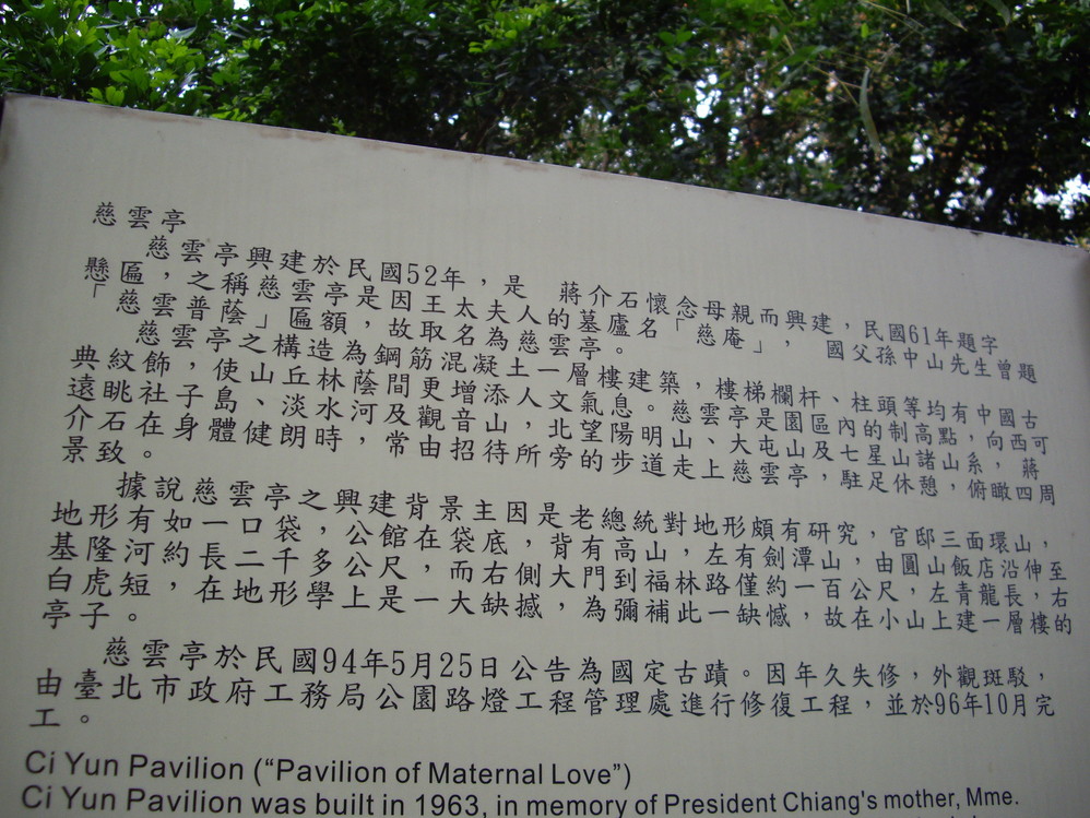 剛過咖排庭旁的左邊, 就有指標拍向官邸的小山丘上, 山上有座慈雲亭, 這也是官邸最高的地點, 爬上去約五分鐘的時間.山間還留著一座外人的墓, 不知當年他的家屬是否能夠進來掃墓.