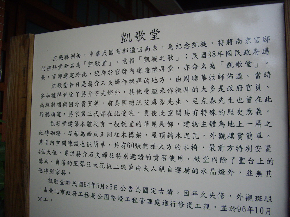 凱歌堂, 昔日蔣介石夫婦在此作禮拜,也是國內外政要都來聆聽佈道的地方, 如尼克森,艾森豪等都來過.