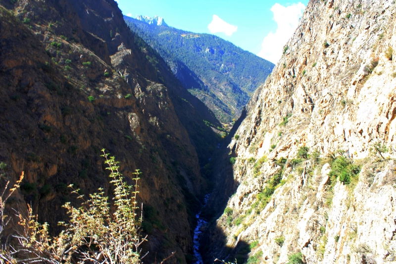 几乎不敢往下看,虽然是旱季,下面仍然传来隆隆水声。这时候发现前方路上方峭壁上居然有山羊!我们走近些,显然惊动他们,开始跑起来,向导马上叫我们快跑过去,还没反应过来,上面很多石块滚下来,落在我们边上,掉入澜沧江 ……太可怕了,向导告诉我们这些山羊害死好几个人了。继续往前,又遇到几拨山羊,都快速跑过。