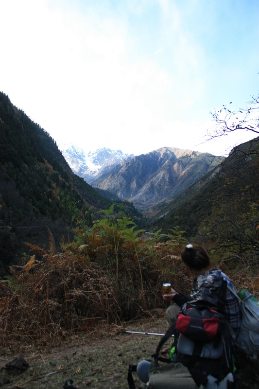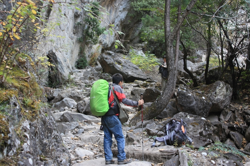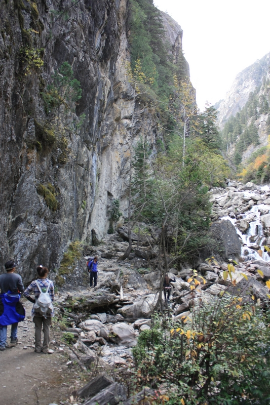 在快到雨崩 河与澜沧江 交汇处时,我们并没看到上面的山羊,但却听到有石块滚落的声音,下意识快跑,但是还是很多石块砸在我们脚边,很不幸的,Luna被砸中,万幸的,砸中脚踝处,更万幸的,穿着高邦登山鞋……,我扶着luna来到一处有遮挡的地方,大家停下来,检查了一下,没有伤口,但是说很痛,可能砸到骨头,向导莫言说做过医生,检查了一下,说应该问题不大,休息一会后,luna说没那么痛了,坚持继续前进,我从她那边转移了部分负重,继续前进。