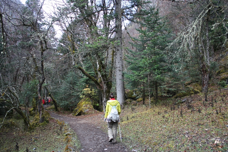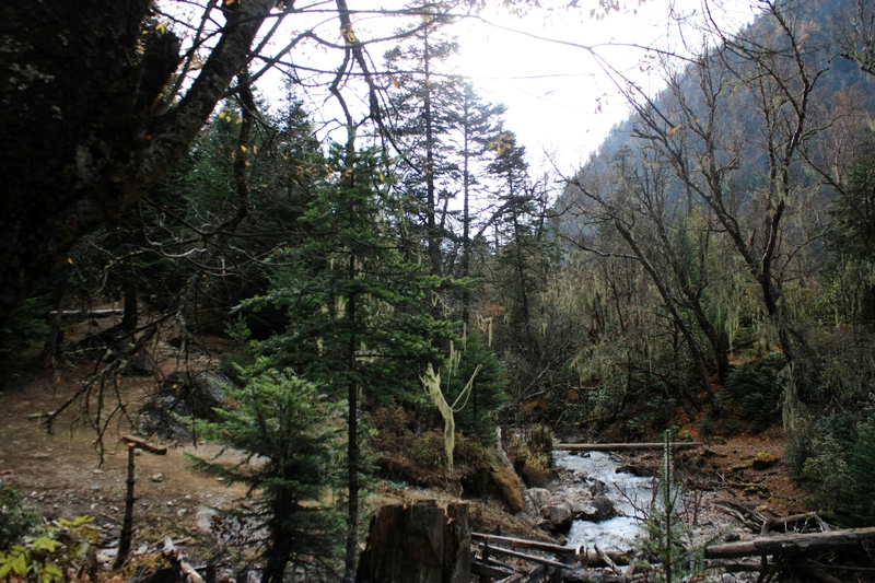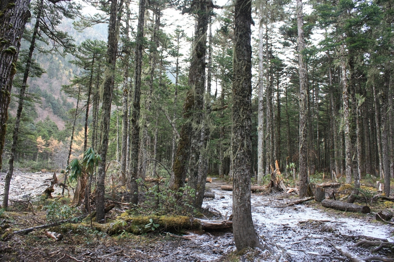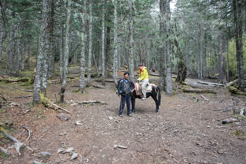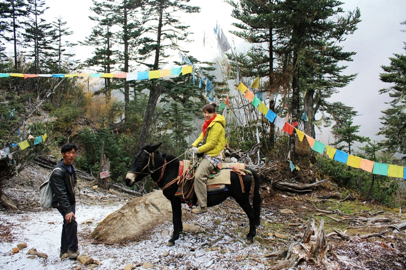 第二天起床,天气有点阴沉,飘着小雪花。我问了Luna伤势,她说骑马的话应该没问题,于是吃完早饭我就先出发了,一般来说骑马的话会比徒步的快很多,所以避免因为等待徒步者而与马夫发生冲突,一般会让徒步者早走。走了很久见后面没动静,不太放心,就原地等,最后干脆往回走,终于碰到。马夫让我赶紧走,一路上都是上坡,原始森林里,有些路已被冲的没有踪影,一路上我全力跟着马,一步不停,中间抄了很多坡度较陡的近路,终于到达第一个休息点
