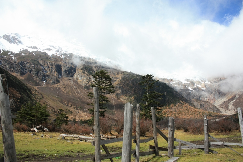 到了这个牧场,会有一座桥可以过河,向导知道我们两个明天要去大本营的,于是让我们过桥,在这里,不过桥一直走是进下雨崩 ,过桥,然后一直往右走是进上雨崩 。进上雨崩 是可以避过门票的,但是去下雨崩 ,进村前是有人检票的。在这里我们和大部队分开,他们由于要赶三天一开的路回丽江 ,所以大本营不去,向导一再叮嘱我们小心。