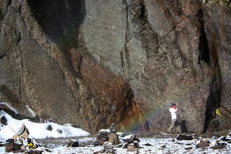 按照藏民的习俗,顺时针转三圈,第二圈时,似乎有所感应,瀑布随风飘动,跟着Luna一起走动,同时彩虹出现,虽然全身淋湿,感觉好幸福。