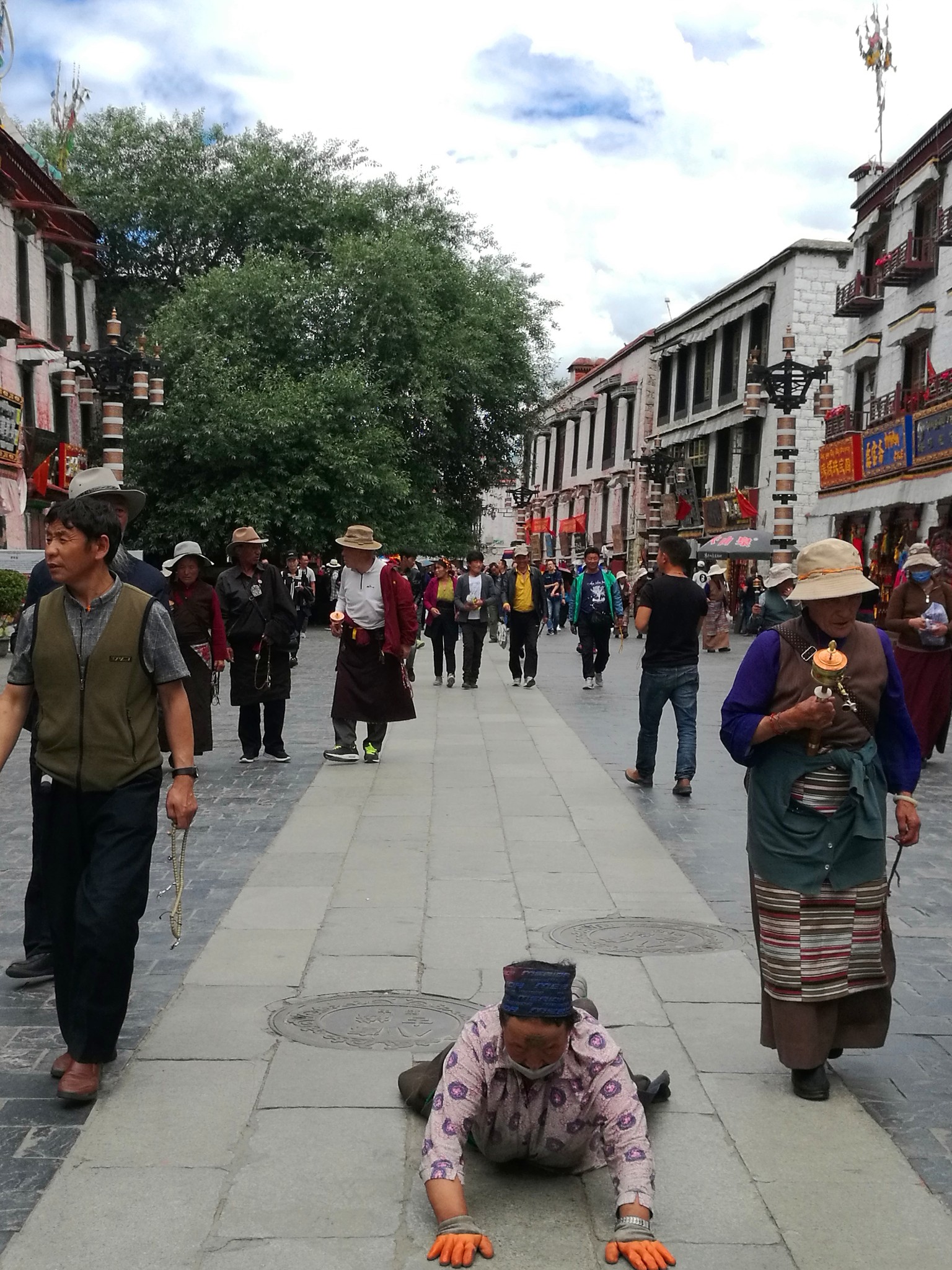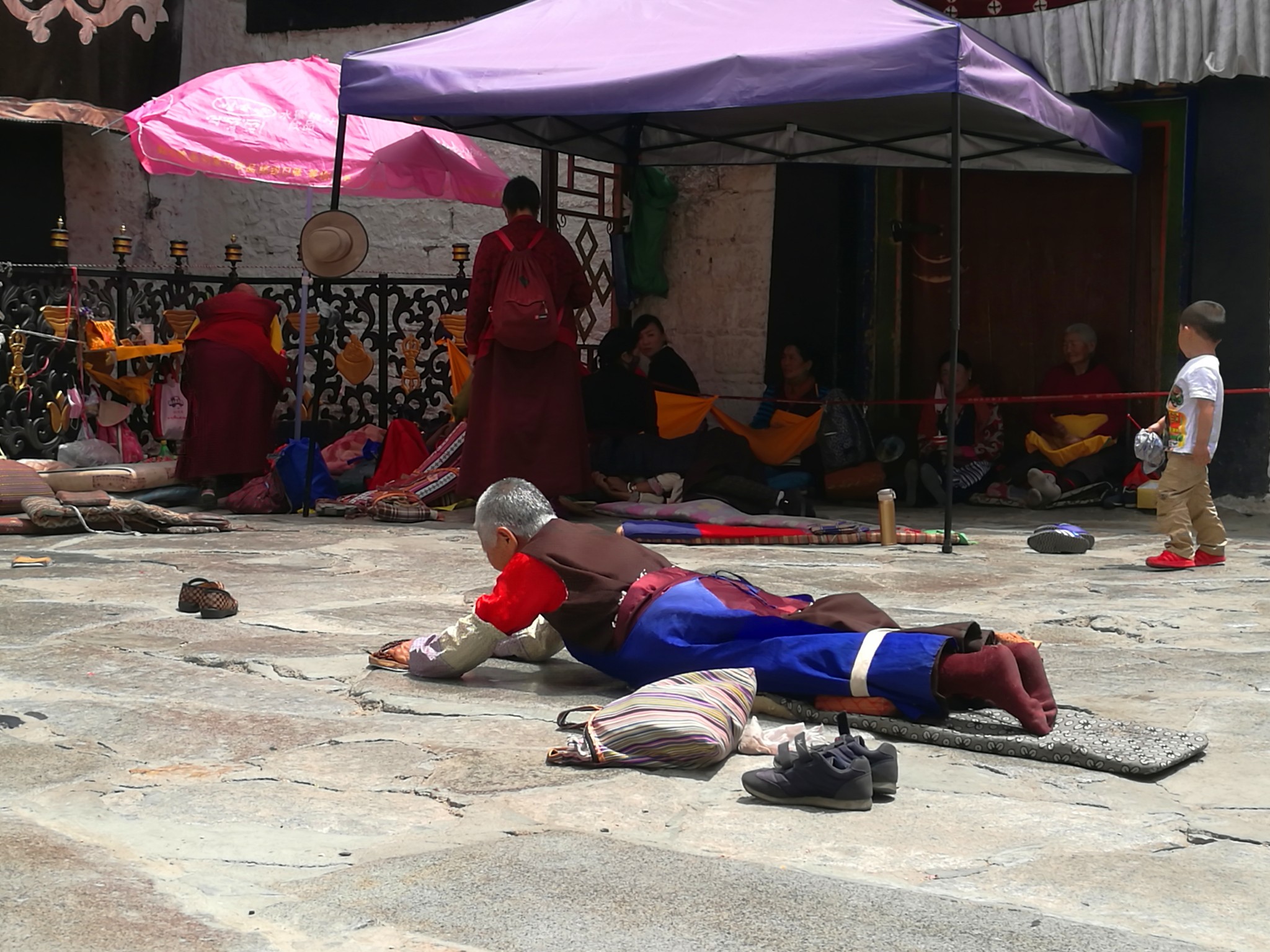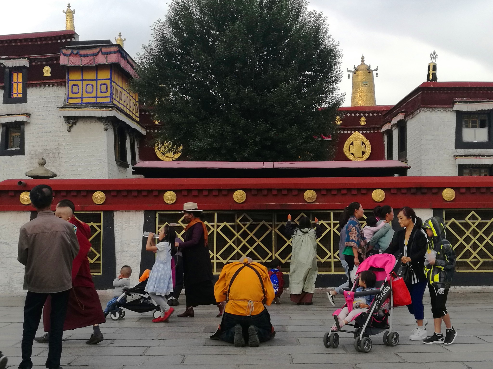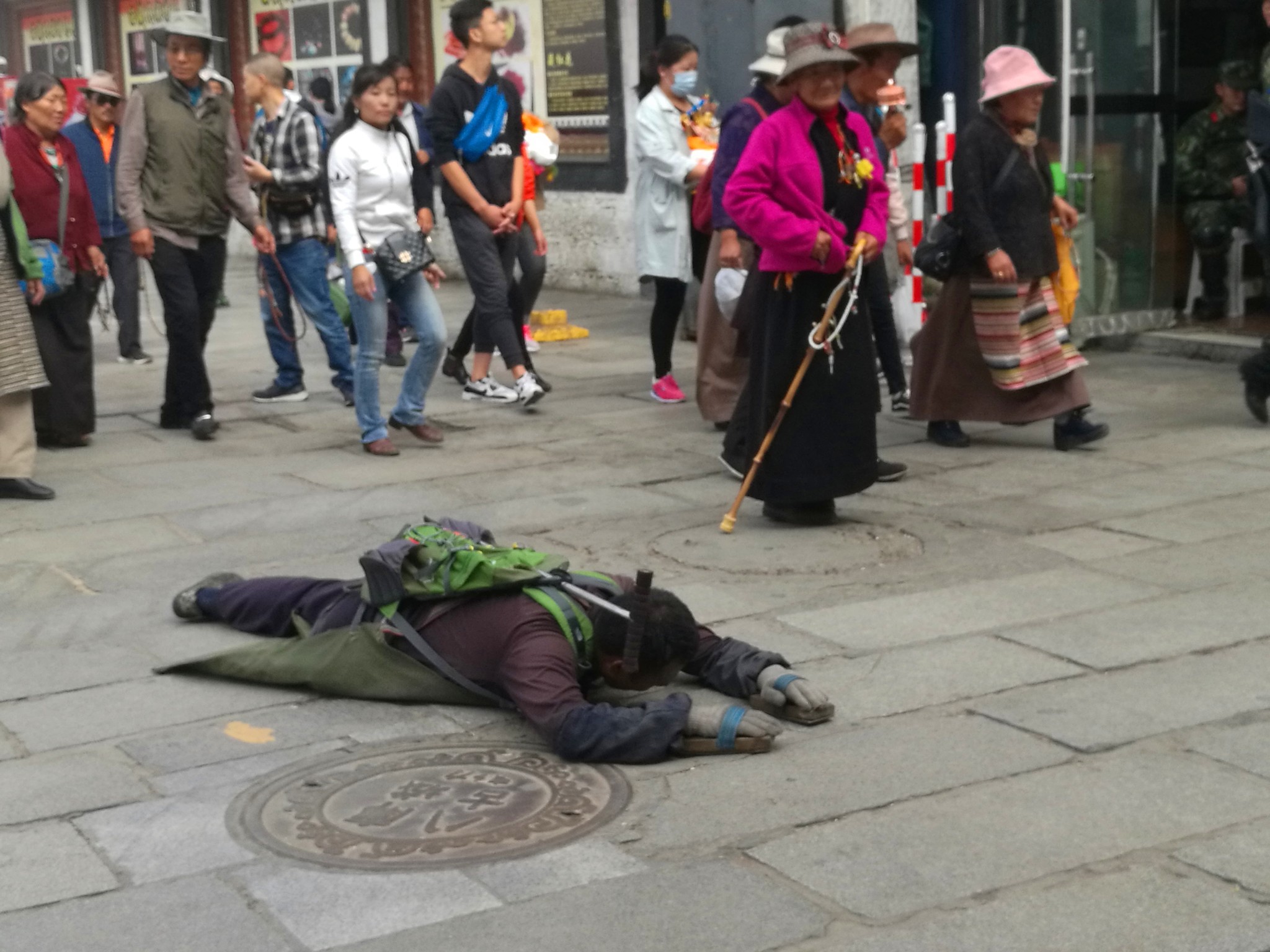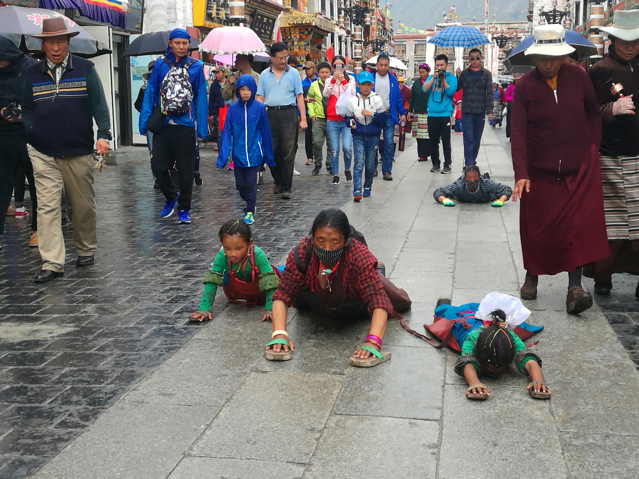据说:一年四季不论雨雪风霜、在大昭寺外都有磕长头的信众,他们来自藏区的名个地方,有青海的、甘肃的、四川的,当然也有很多是拉萨当地的