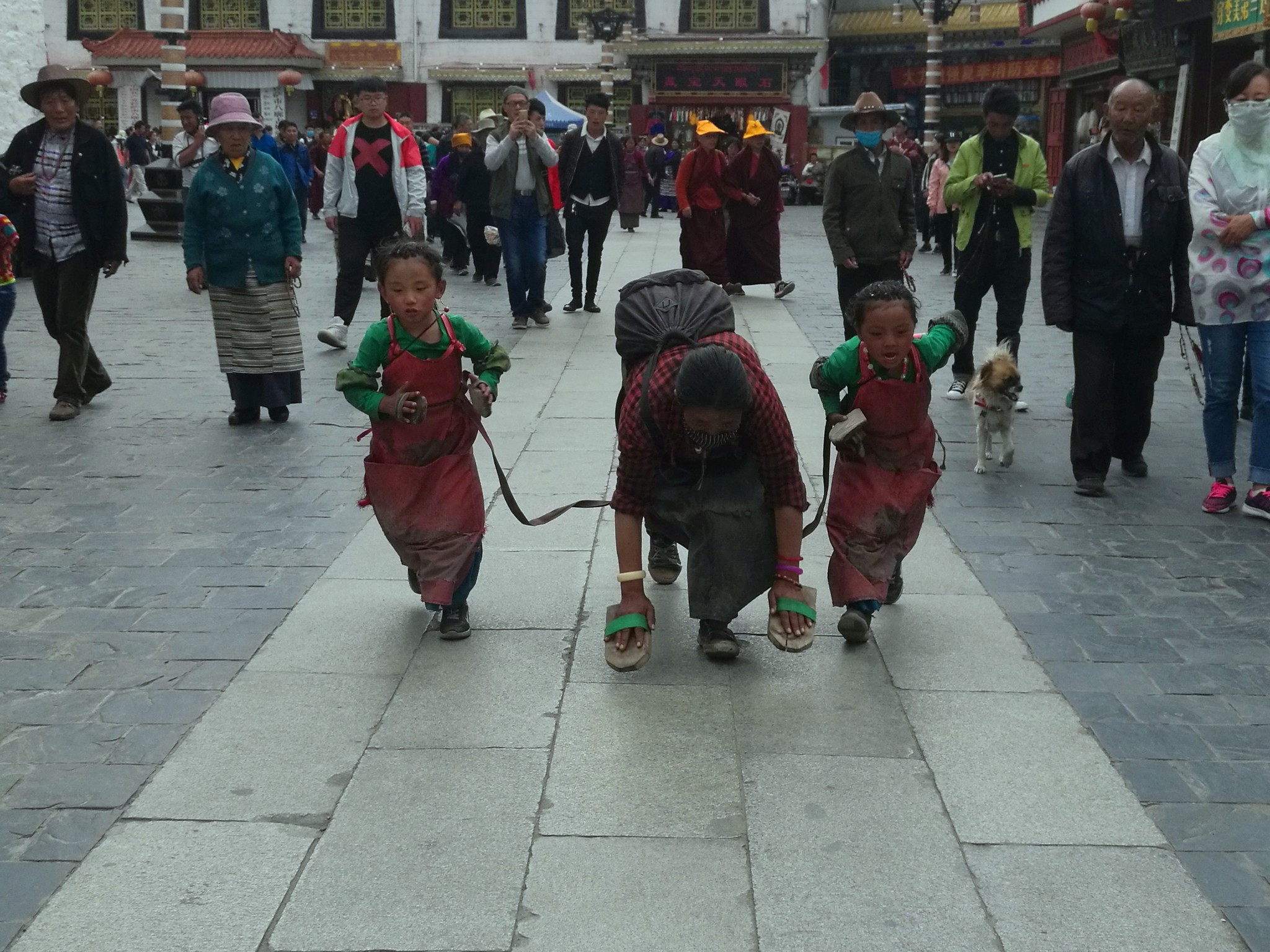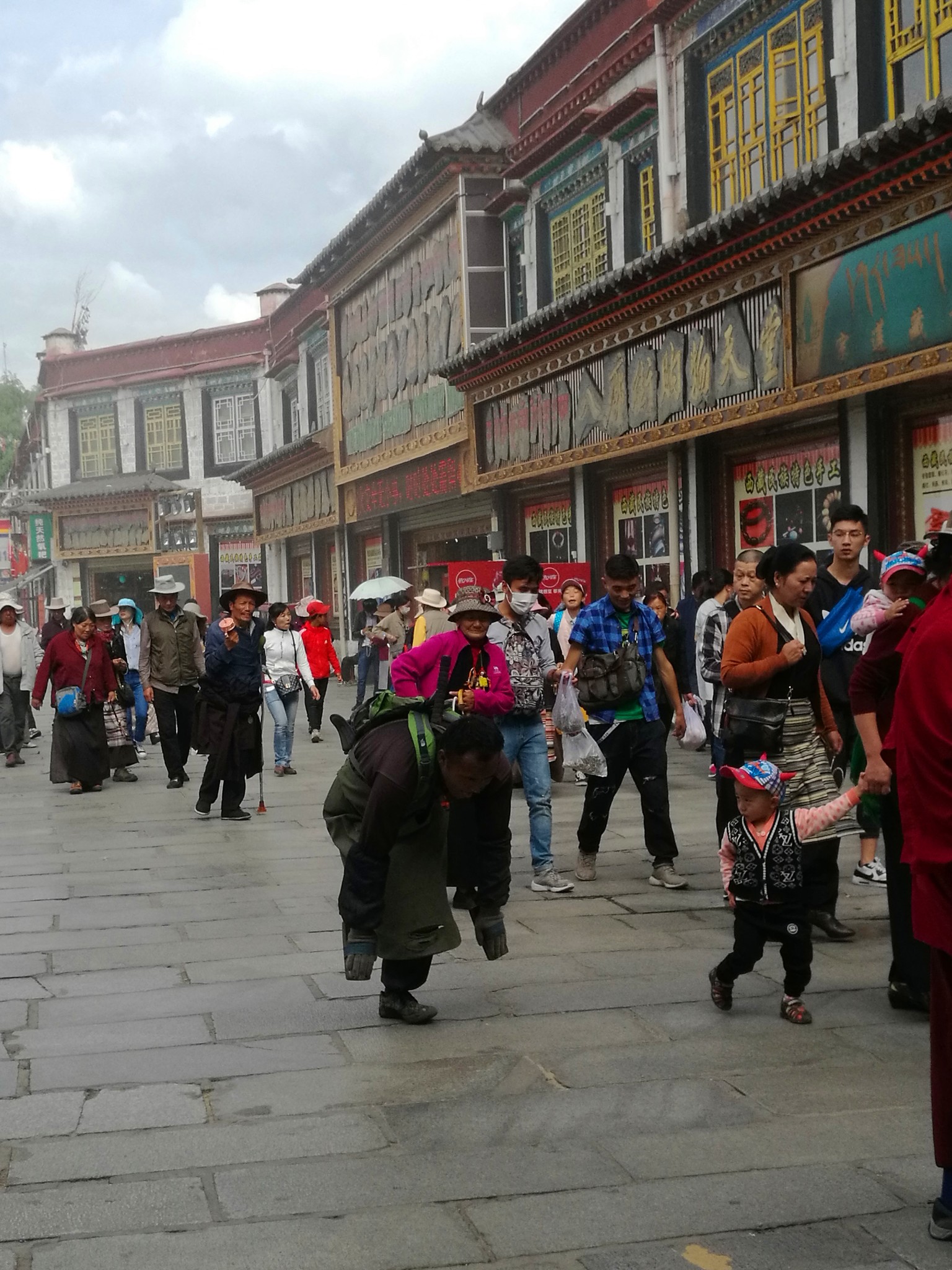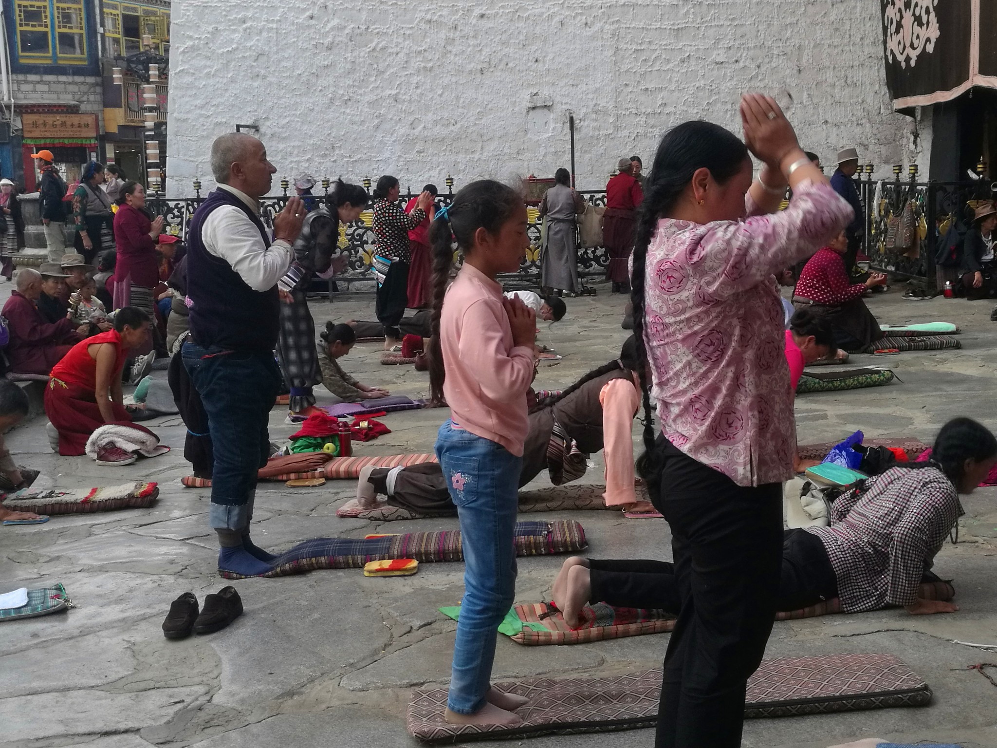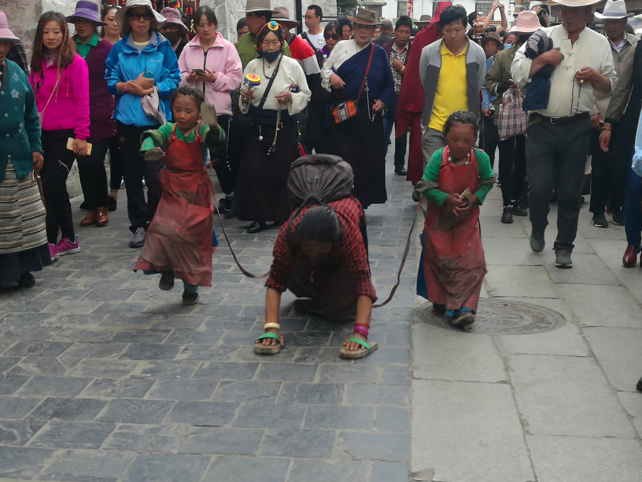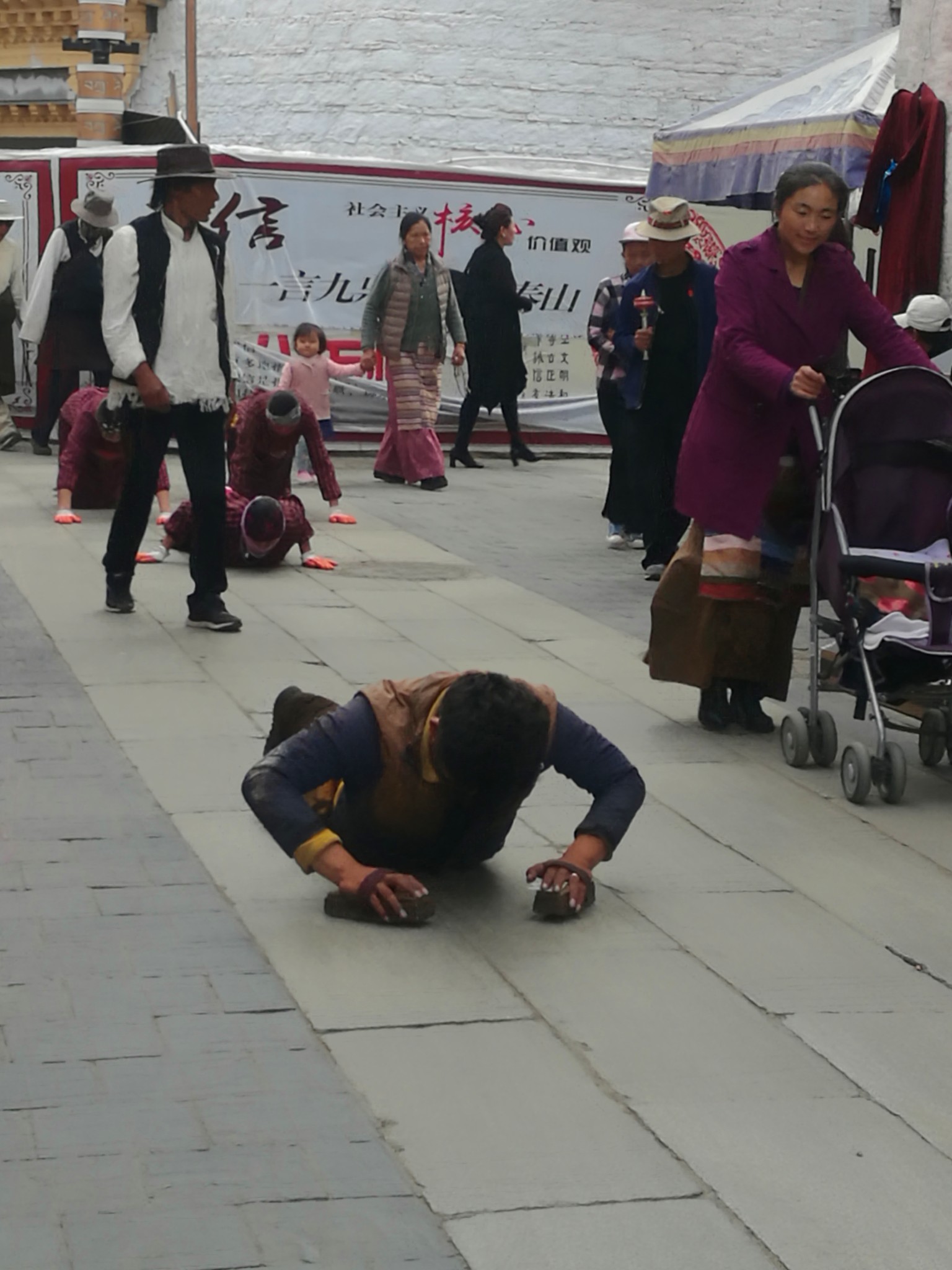据说:一年四季不论雨雪风霜、在大昭寺外都有磕长头的信众,他们来自藏区的名个地方,有青海的、甘肃的、四川的,当然也有很多是拉萨当地的