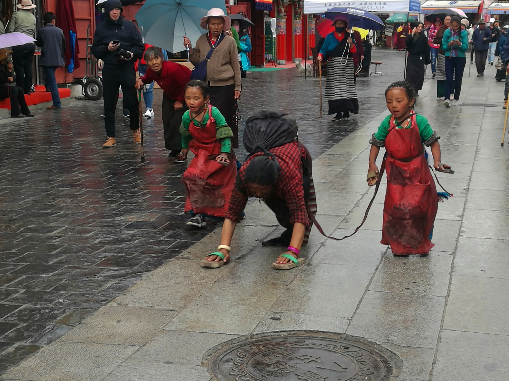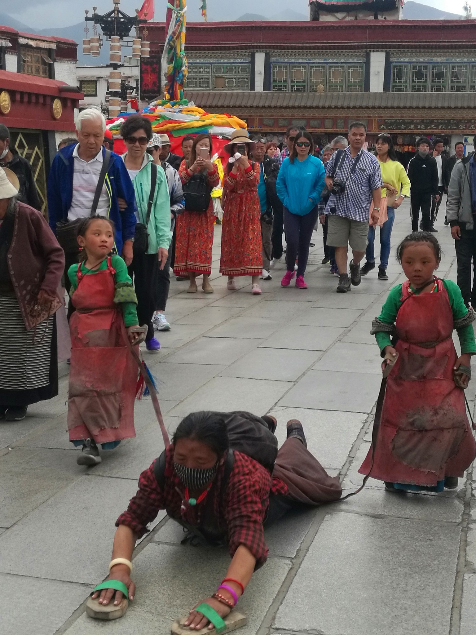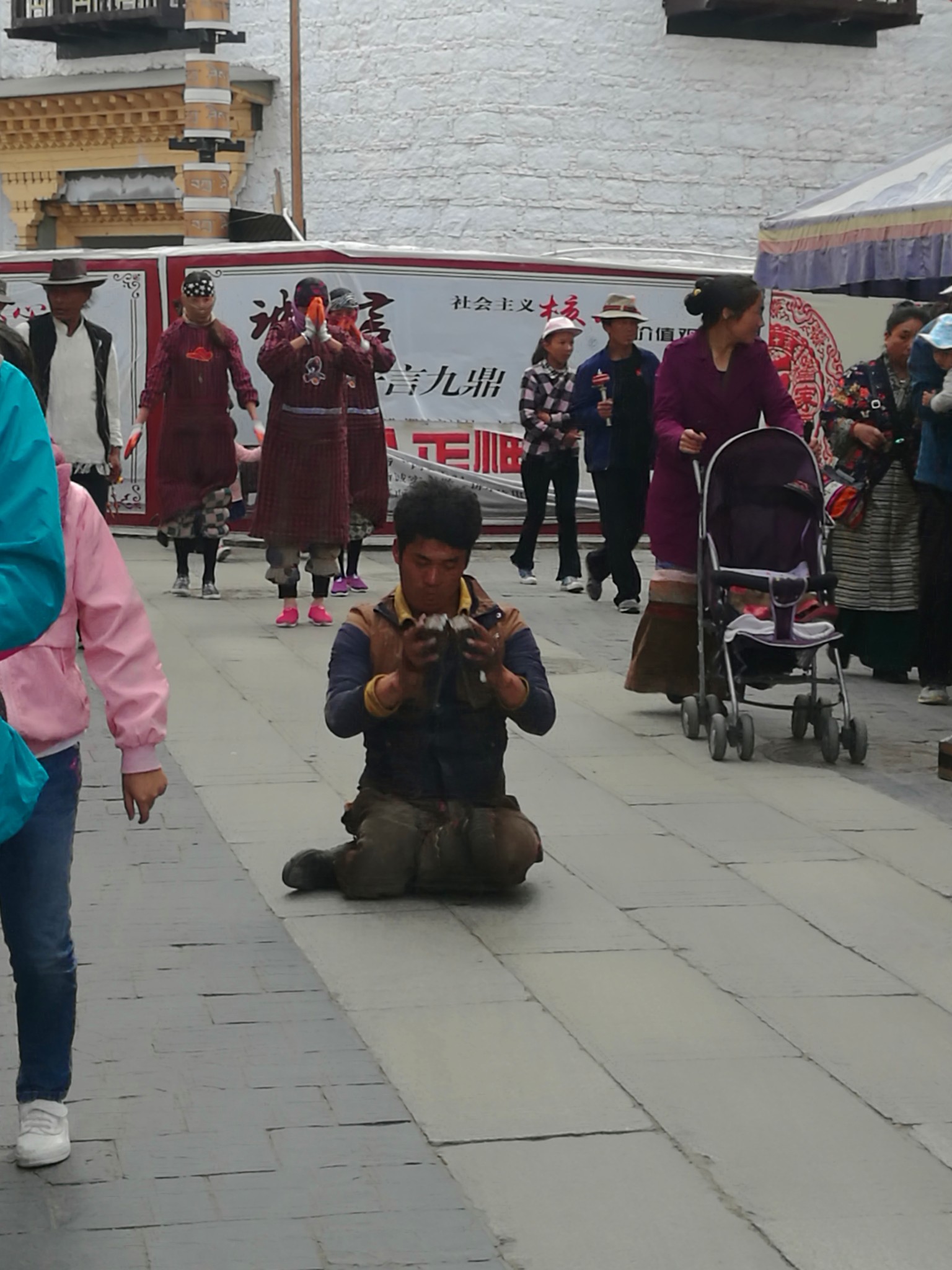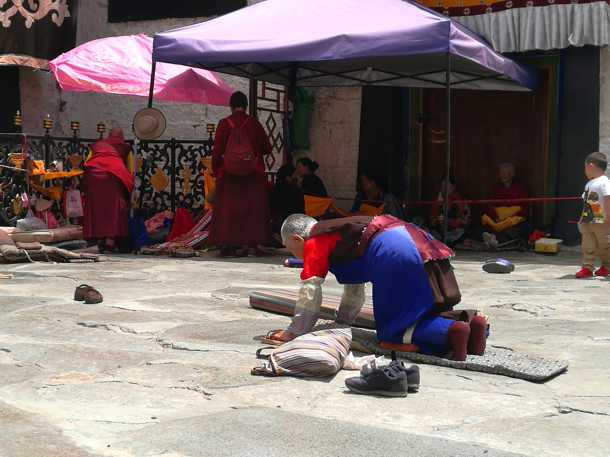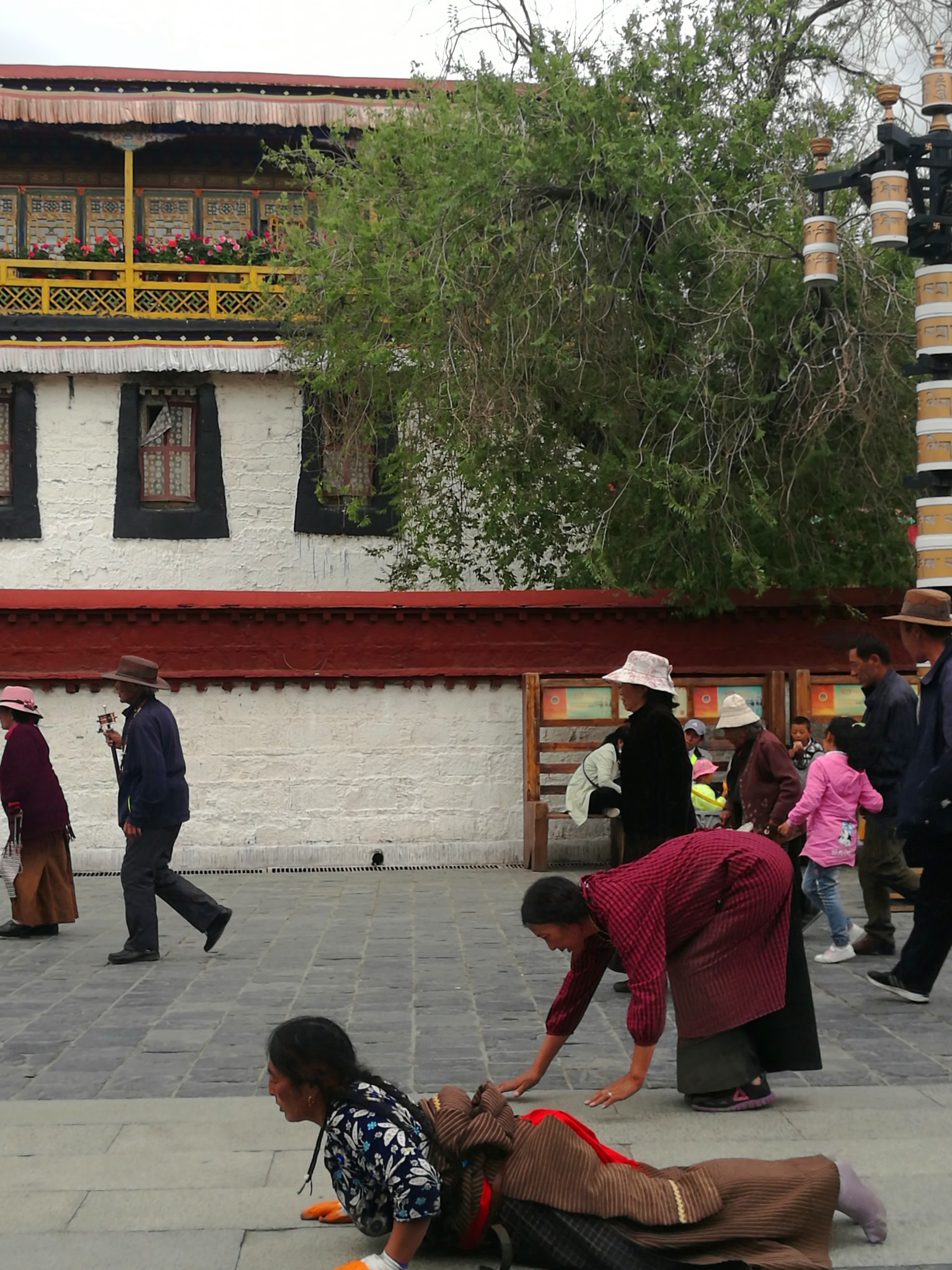 据说:一年四季不论雨雪风霜、在大昭寺外都有磕长头的信众,他们来自藏区的名个地方,有青海的、甘肃的、四川的,当然也有很多是拉萨当地的