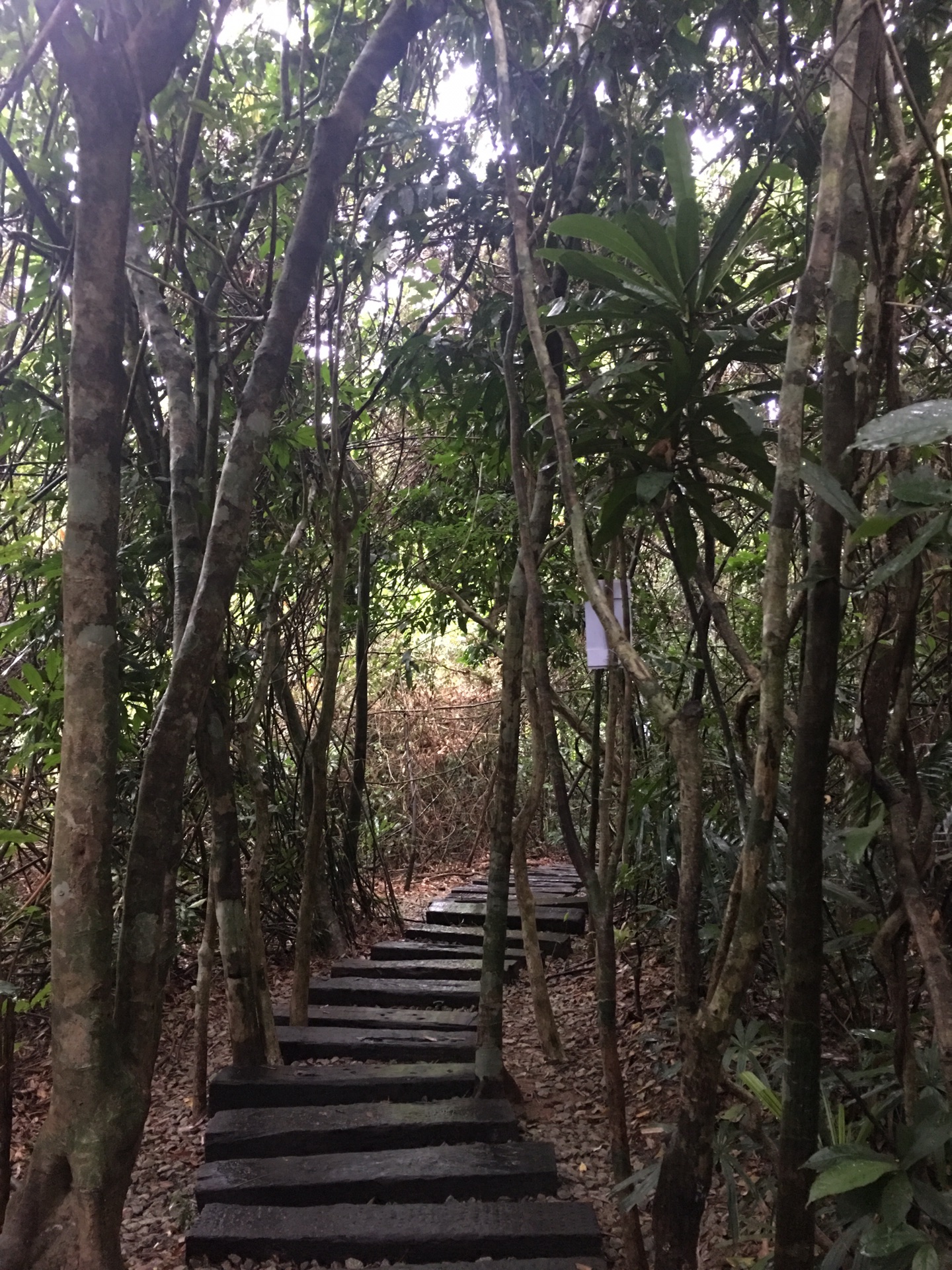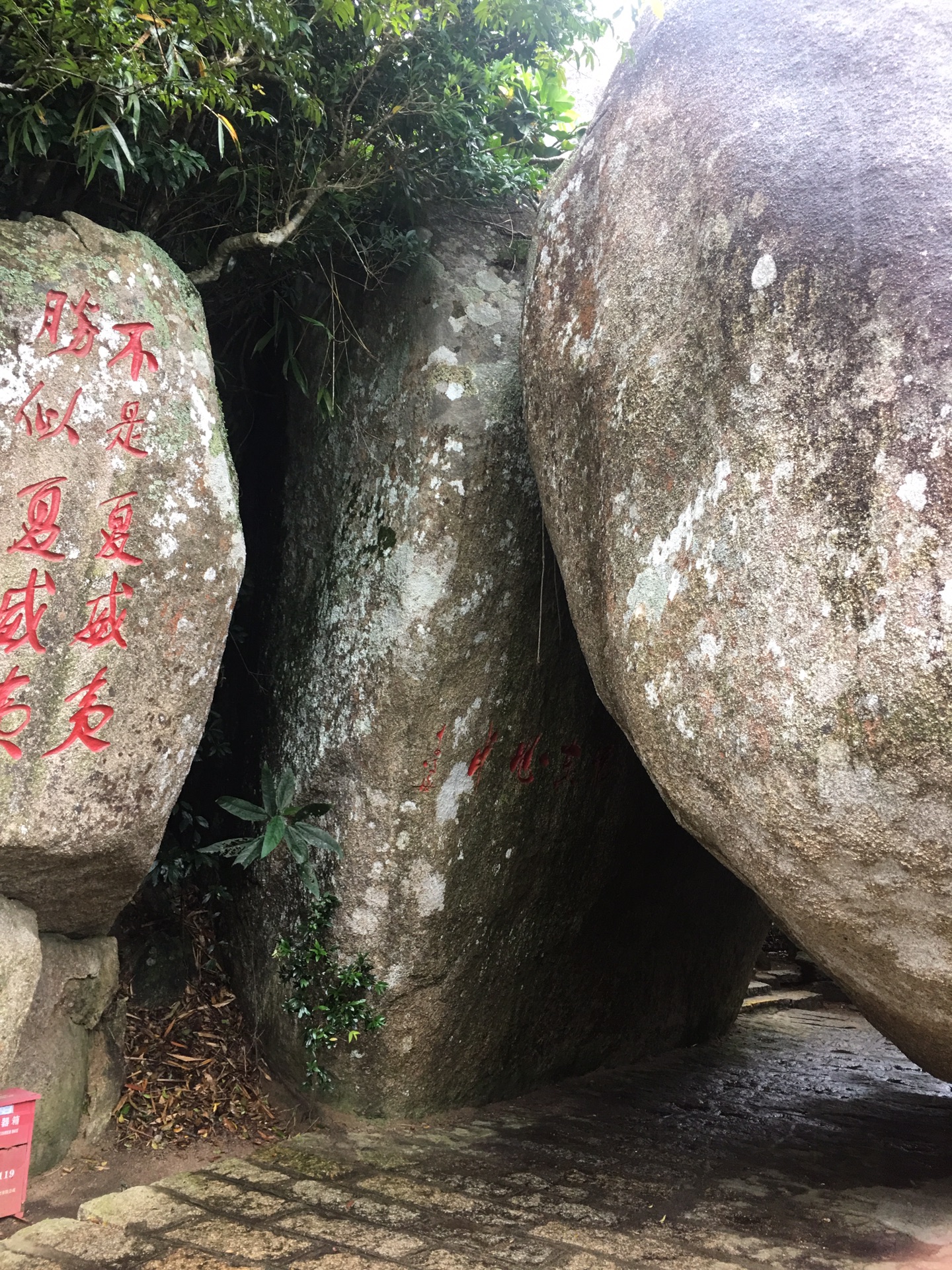 昨天早饭过后,我们坐车去了森林公园,进到公园里面,我们乘坐电车一路蜿蜿蜒蜒、盘盘曲曲、左摇右摆的坐到电车落脚点,在路上我们看着云雾缭绕的山峰,领略了热带雨林的景色,下车后大家跟随导游先生开始狂爬各种楼梯。导游第一个给大家介绍的就是【大佛石】两块椭圆形的大石头相对而立,旁边树立着一块写着“不是夏威夷胜似夏威夷”的石头。之后我们继续赶路,接着我们在一块可以观望景色的地方停了下来,眺望拍非诚勿扰的【鸟巢】和【小亭子】高耸入云的山峰上不仅长满了树,还建造了这么些个各有千秋的房子。然后我们又看了海中的“乌龟”。在路上我们只是看各种不同的花草植物和奇形怪状的树,但都离的远远的,不敢触摸,导游说它们很多都是有毒的,而且越是弯曲变形的树,它的汁液会见血封喉,怪吓人的。路上的野花你不要采,采了会要命。在导游带着大家喝茶时,我发现了树上有只小松鼠,它小小的爬的好快好快。大家都在品着茶,这的茶确实很特别,第一种茶的香味和云南的一种茶无论是香味还是口感都很类似,我喜欢那个味道,我看大家都喝的津津有味。后来喝了不同浓度的苦丁茶,这个苦丁茶和我们喝的苦丁茶一点都不一样,不是傻苦傻苦的,喝下去入口是苦的回味及舌尖的味蕾是甜的。最后品尝了什么花,我看就是洛神花,一样一样的