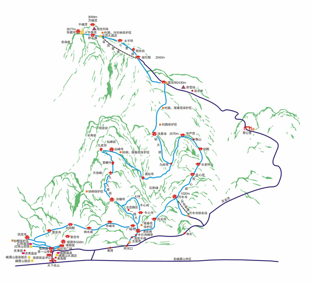 路线选得是九十九道拐那条,即五显岗-->清音阁-->一线天-->洪椿坪-->九十九道拐-->仙峰寺-->遇仙寺-->洗象池-->雷洞坪-->千佛顶