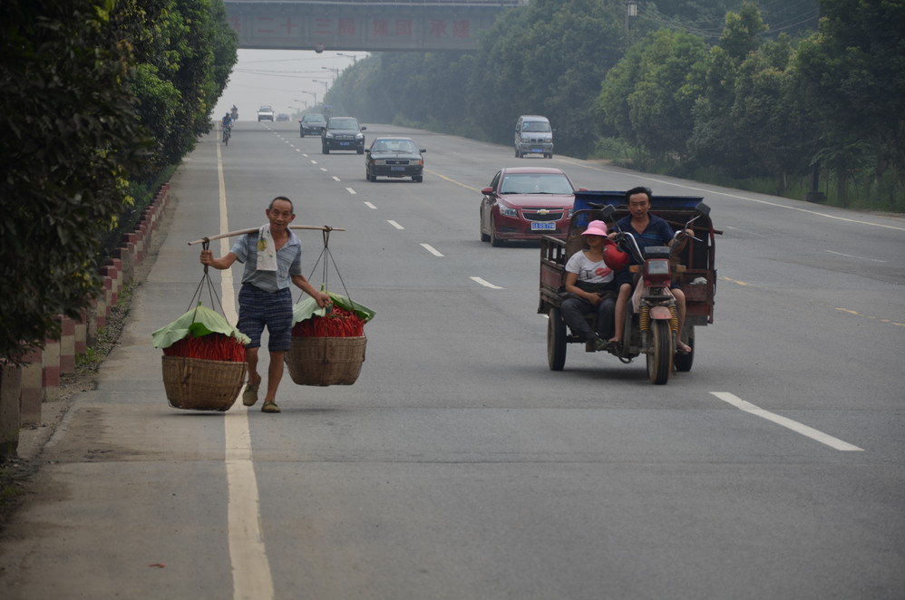 这就出发了。之前三环和绕城之间差点迷路,不过好的是遇见一家好吃的包子店,很有味道,只是慢得要命,一出来,就被抢光了;这张是差不多要到黄龙溪 了,一位老者挑着沉沉的红辣椒,脸上丝丝满意的微笑,抓的不好,没够着,嘿嘿,就那个意思了~~