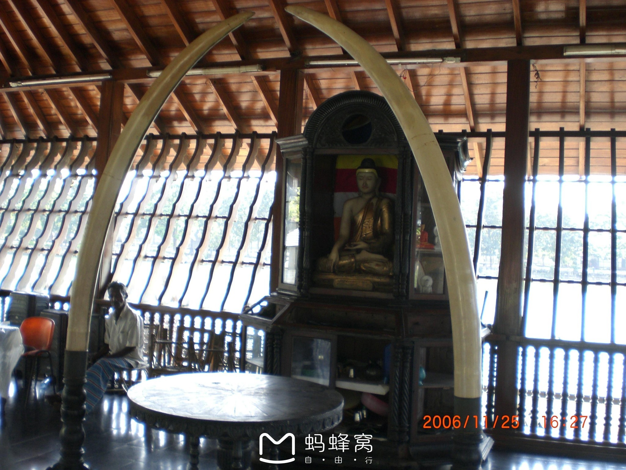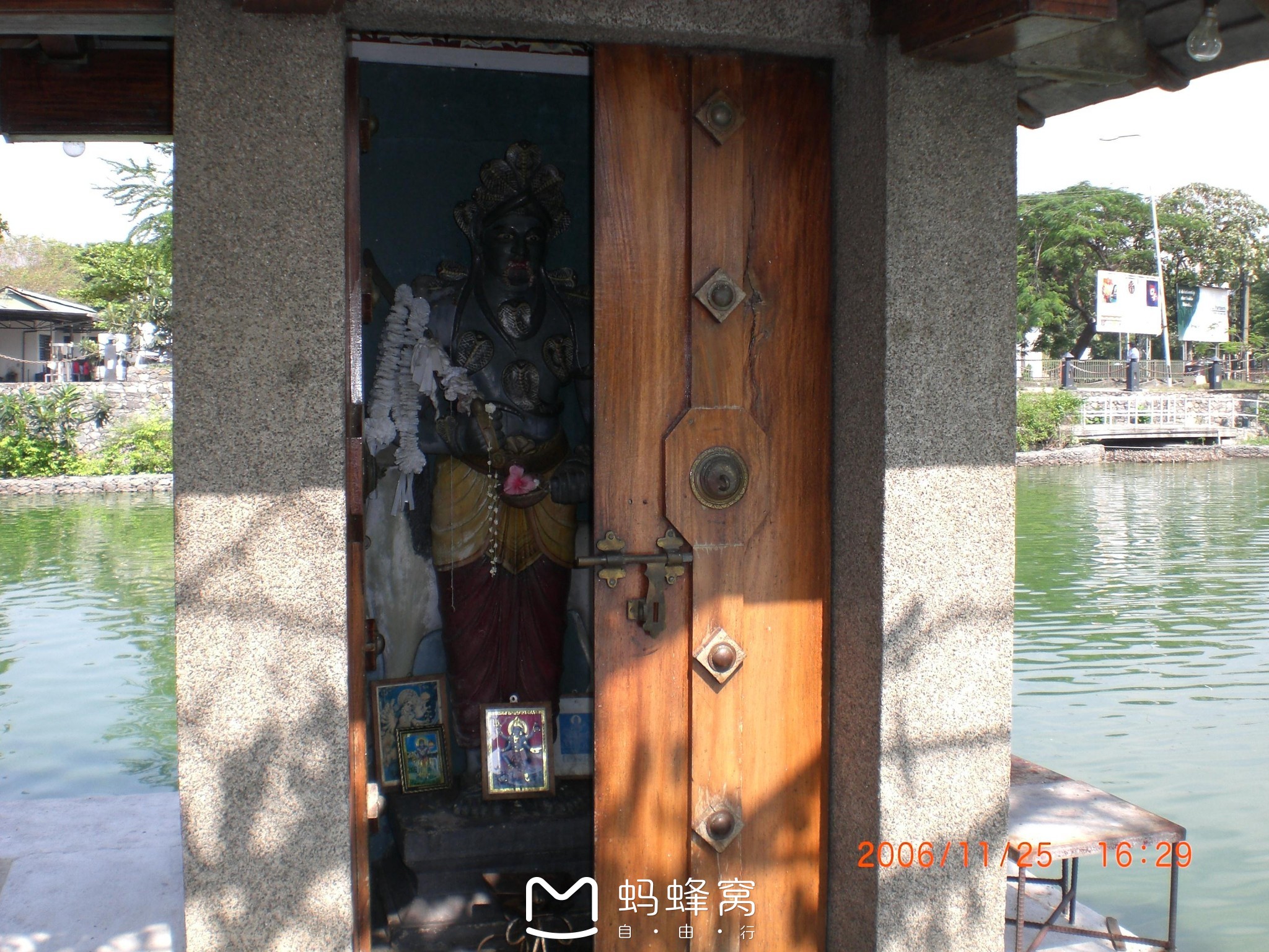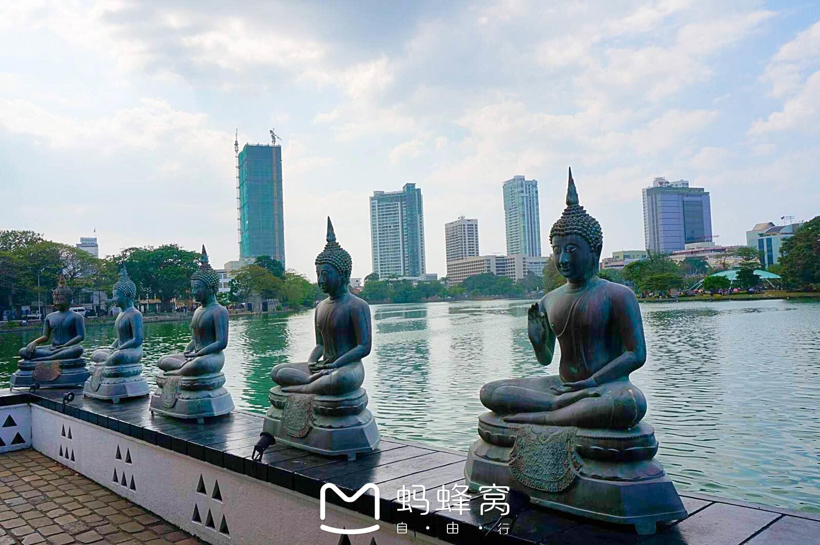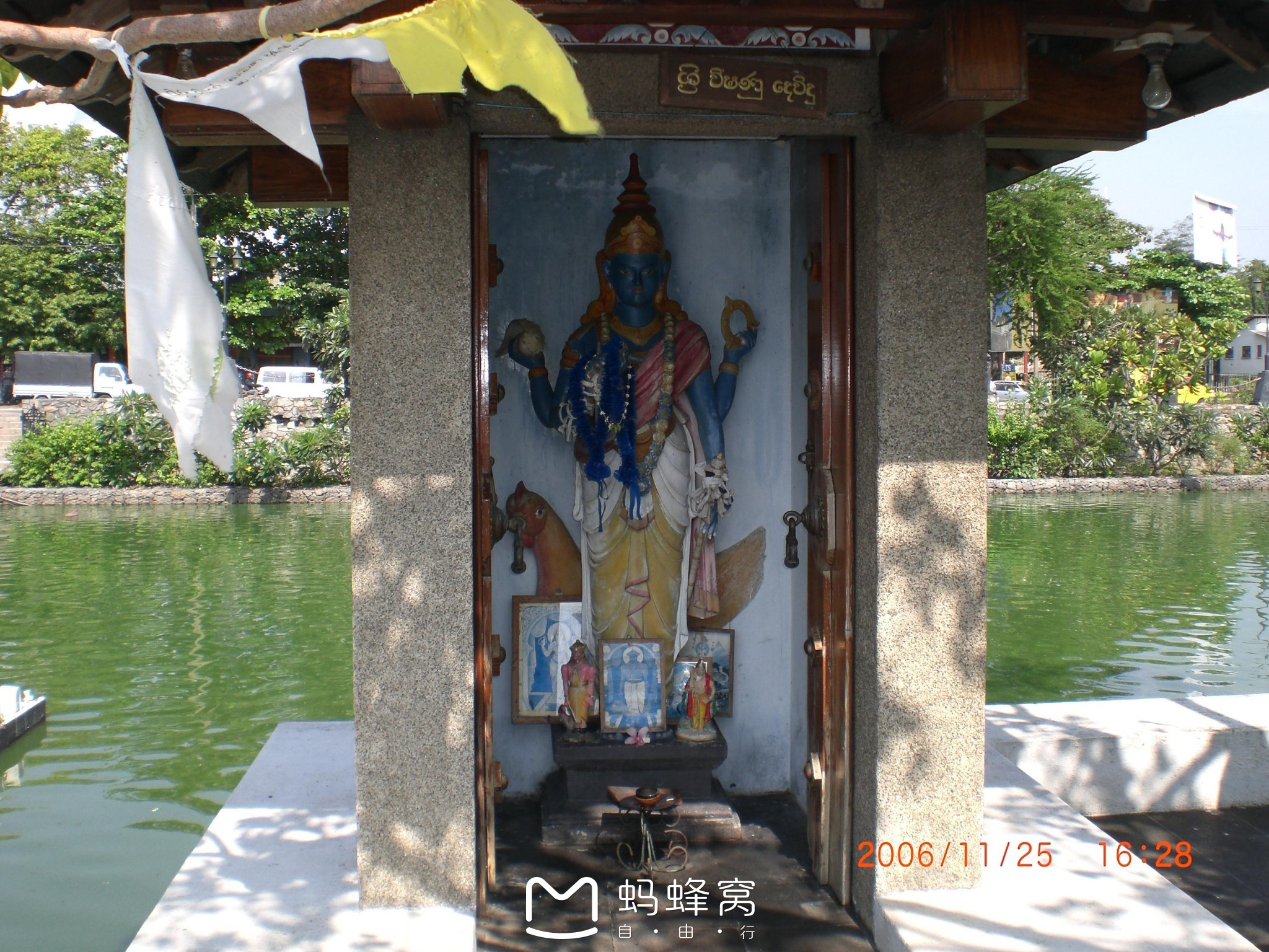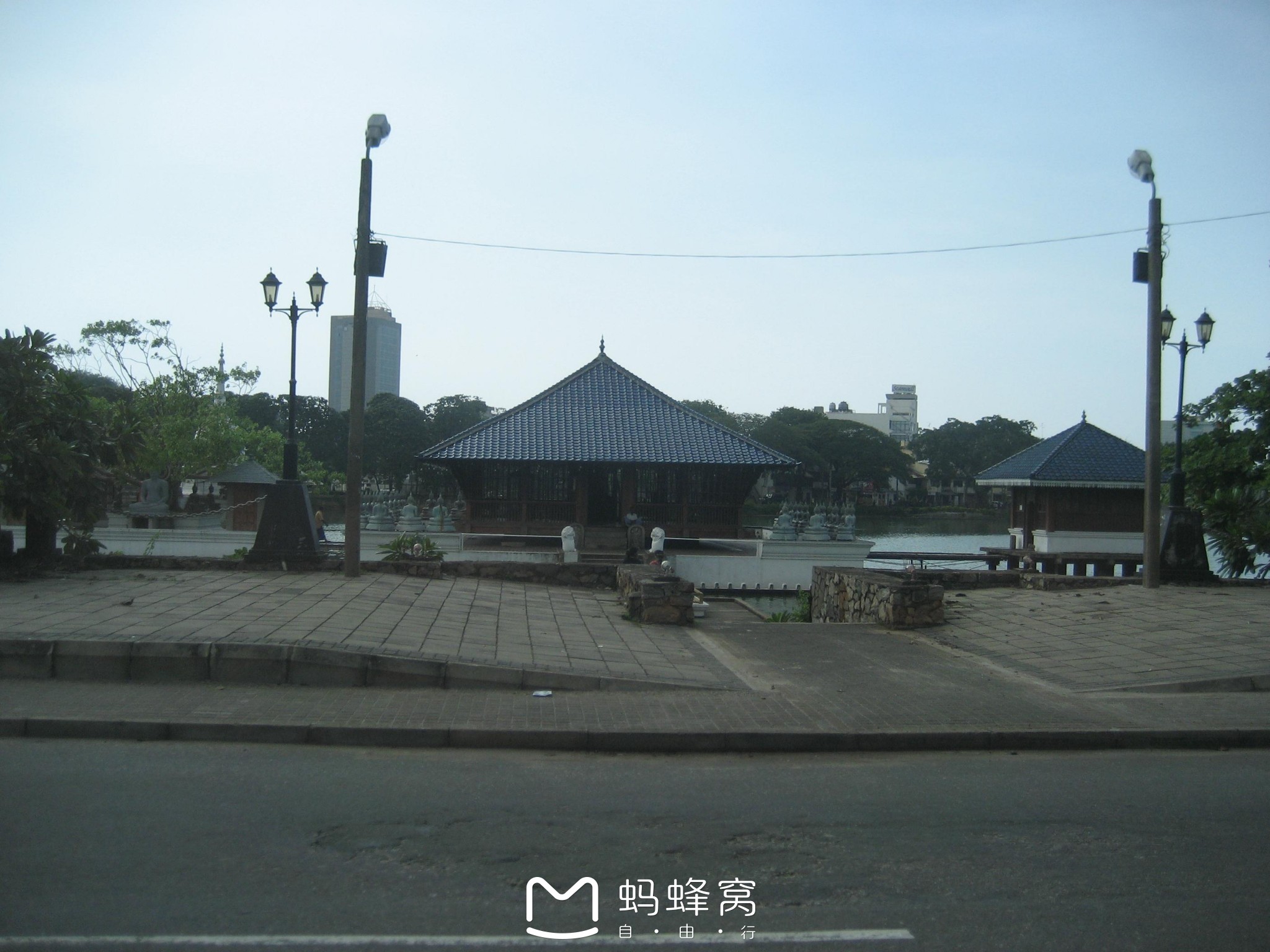 水中庙,是由20世纪知名建筑师杰弗里- 巴瓦(Geoffrey Bawa)设计的。由一座蓝顶木屋,一座白塔及周围的佛像,印度教神像组成。脱鞋进入蓝顶木屋,首先看到两根长长的象牙面对面的围成一个拱门形状,拱门后面就是主佛-----释迦牟尼佛像,四周地板上或木桌上摆放着石雕睡佛,佛头,和一些不知名的佛像。走出木屋,是几座专门供奉的神像,我感觉应该是印度教神像,有一个是象神迦尼萨(Ganesha),其他几个不认识,所以也不敢乱解释。四周水边的台阶上端坐着十几座各种坐姿的佛像,面朝木屋,背对湖面,煞是庄严。拐角处的一座白塔,造型美观,给整座庙宇增添几分神圣与庄严!贝拉湖和水中庙是科伦坡当地人最喜欢的休闲区之一。很多情侣拍婚纱照都在这儿取景呢!