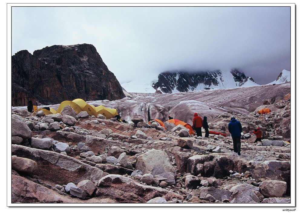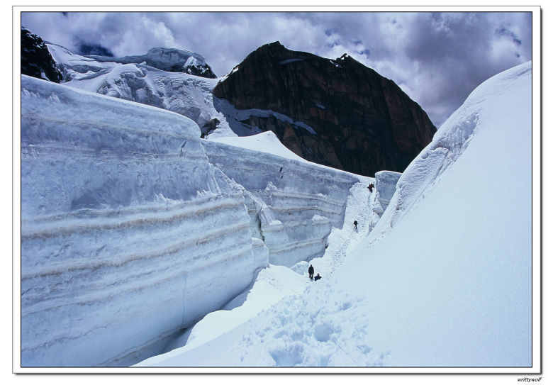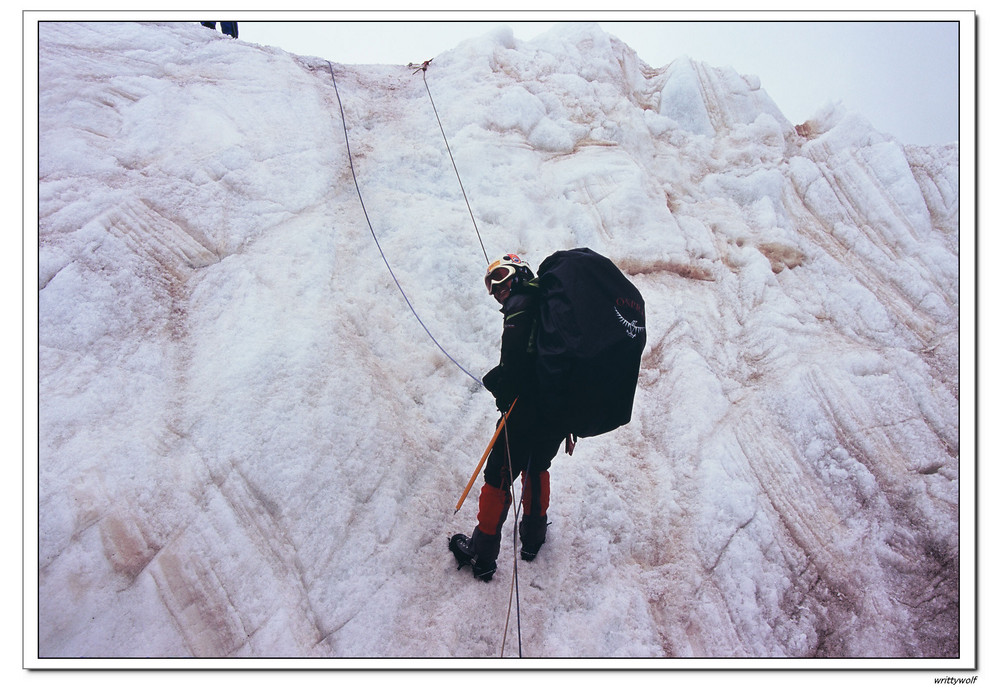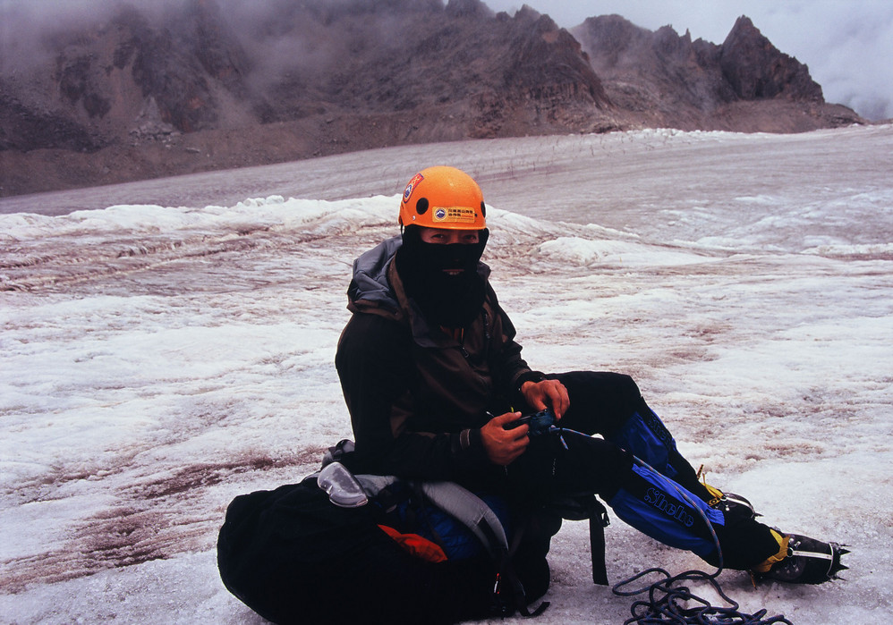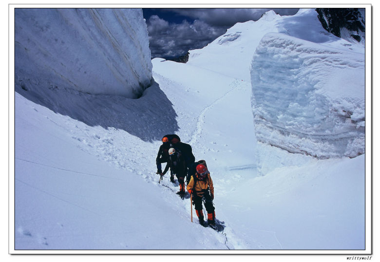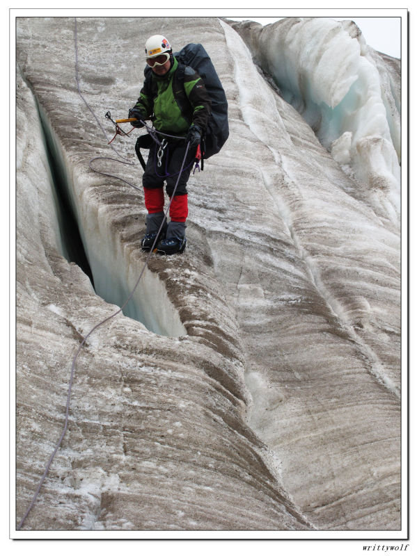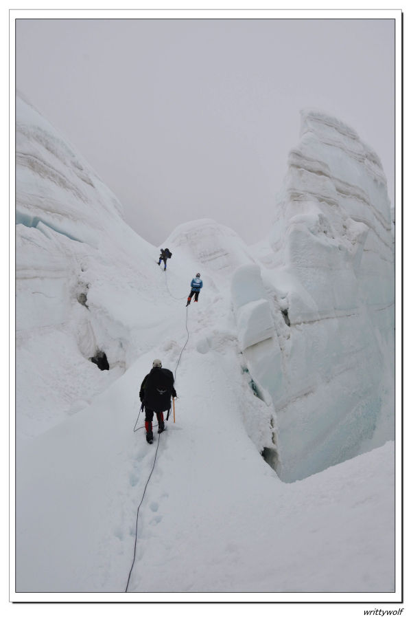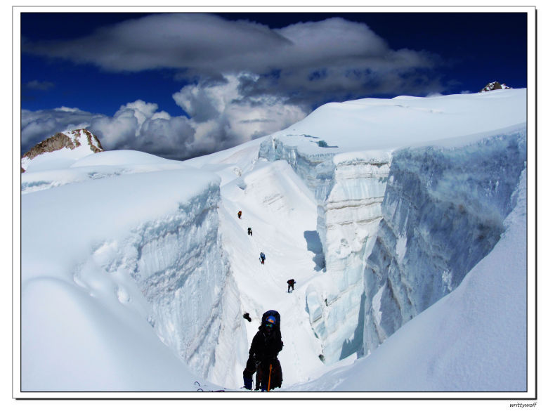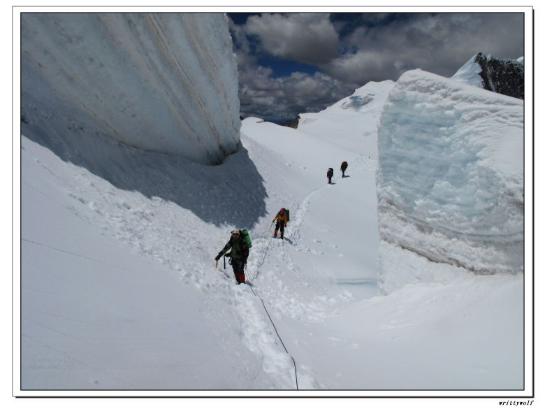 一夜小雨,醒来已经7点多了,今天要到C2,上升到5350米,不高,但是从今天起就要全身披挂在冰川上度过以后的时光了。一路在冰川上行,到处都是裂缝。