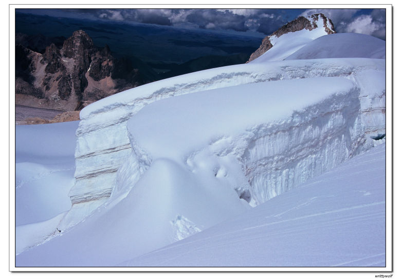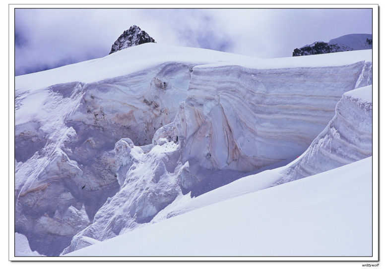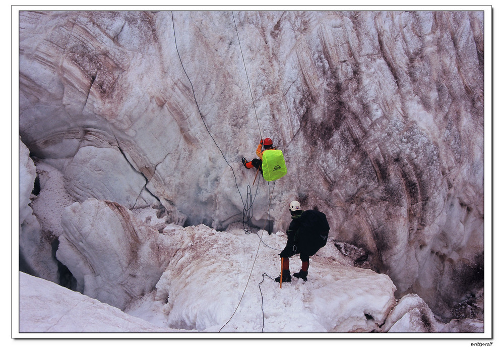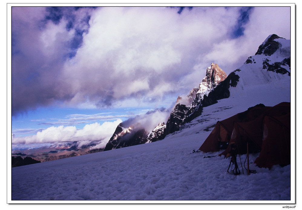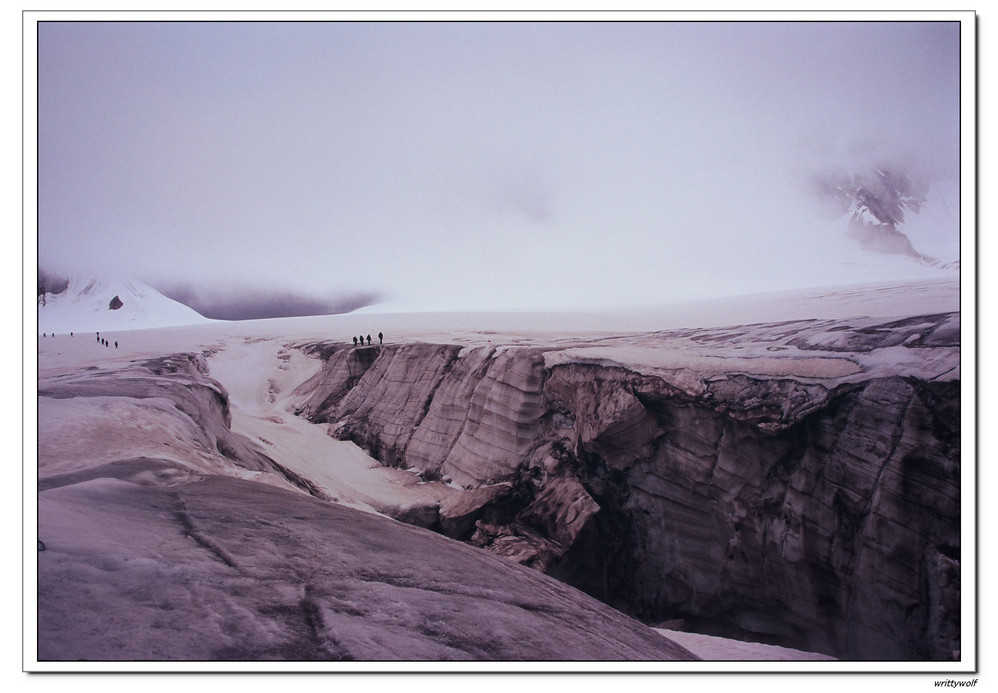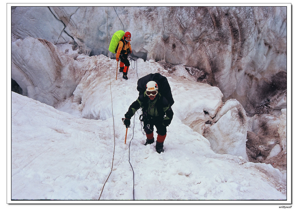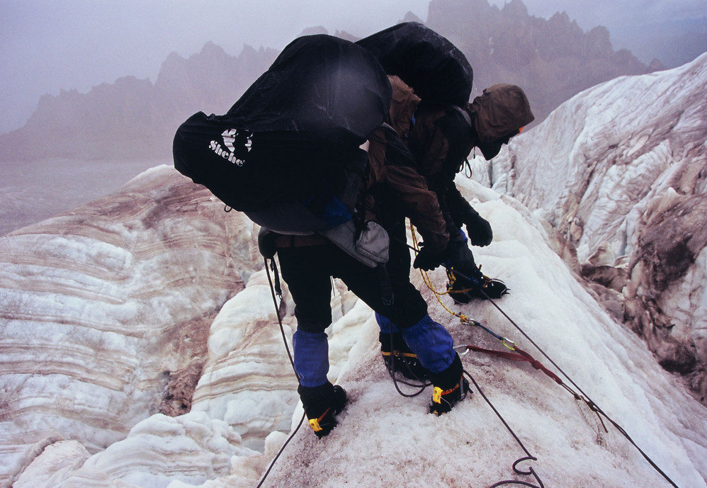 一夜小雨,醒来已经7点多了,今天要到C2,上升到5350米,不高,但是从今天起就要全身披挂在冰川上度过以后的时光了。一路在冰川上行,到处都是裂缝。