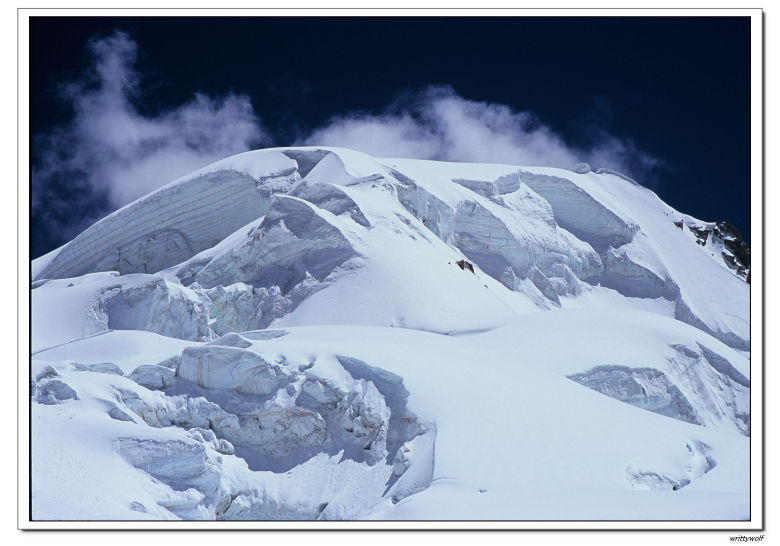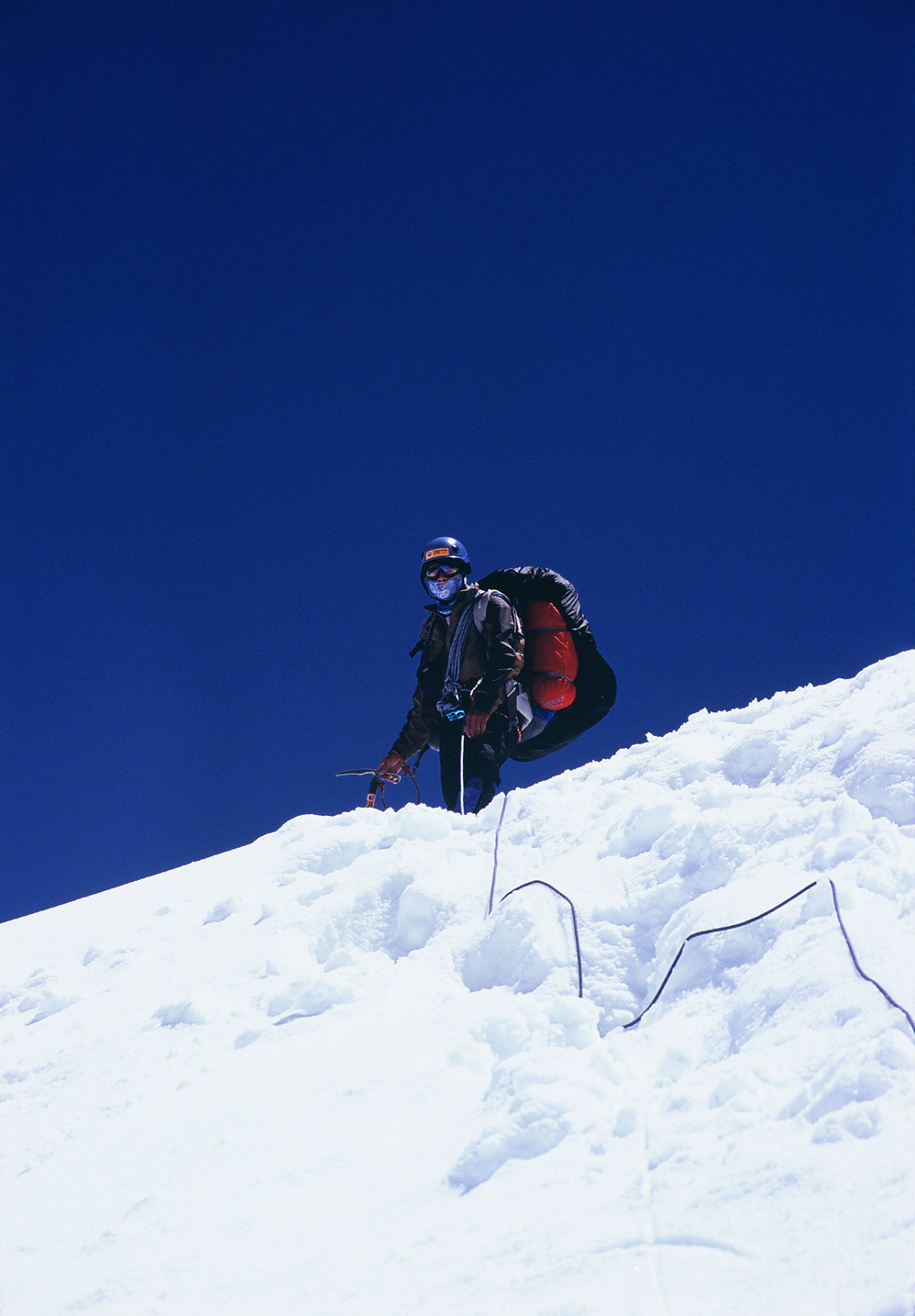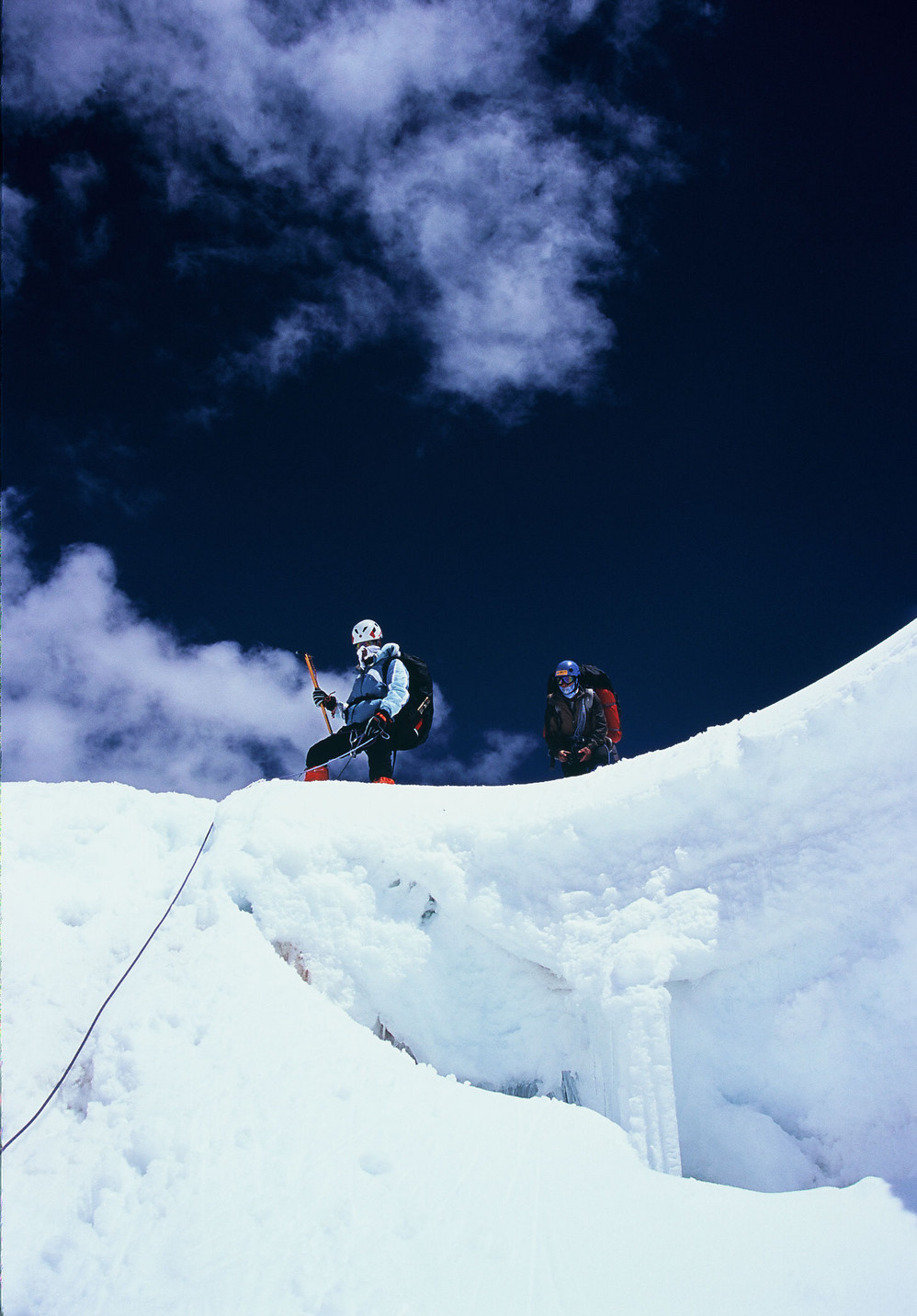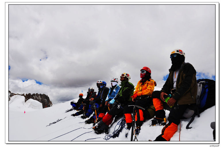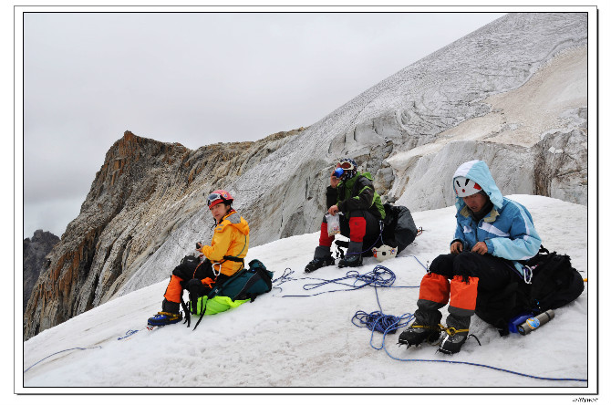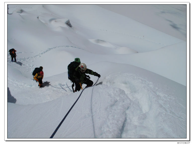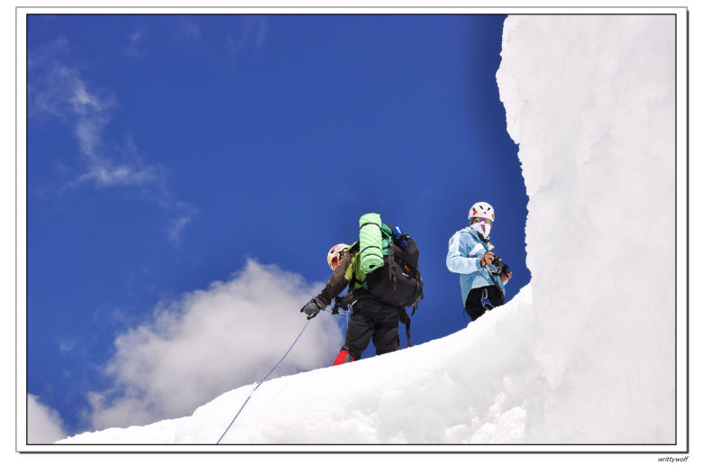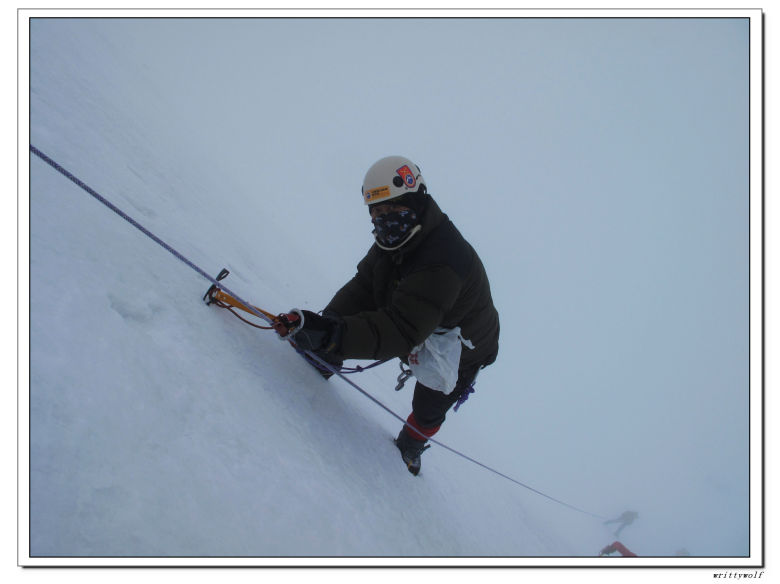 登顶这天天气不好,风极大,80度的冰壁有70多米,还有个20多米的刃脊横切才能到达6168米的顶峰。