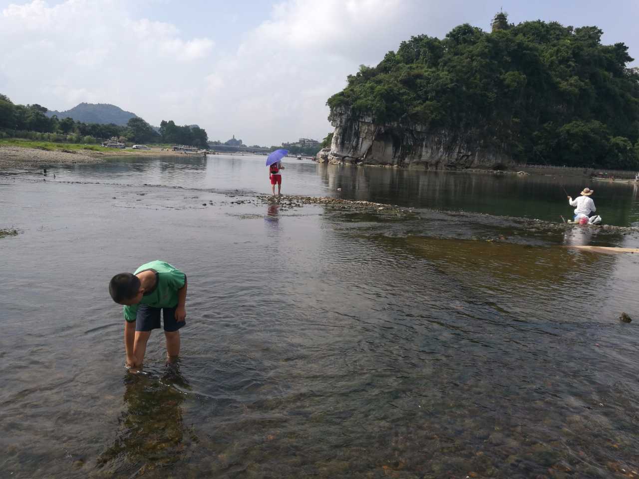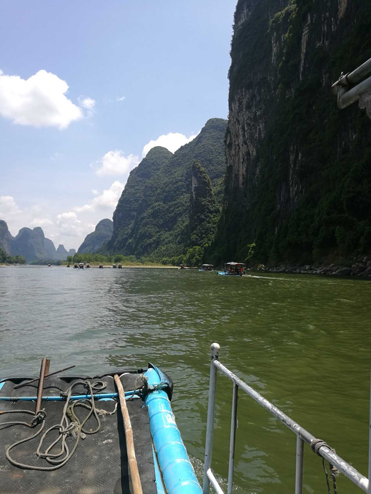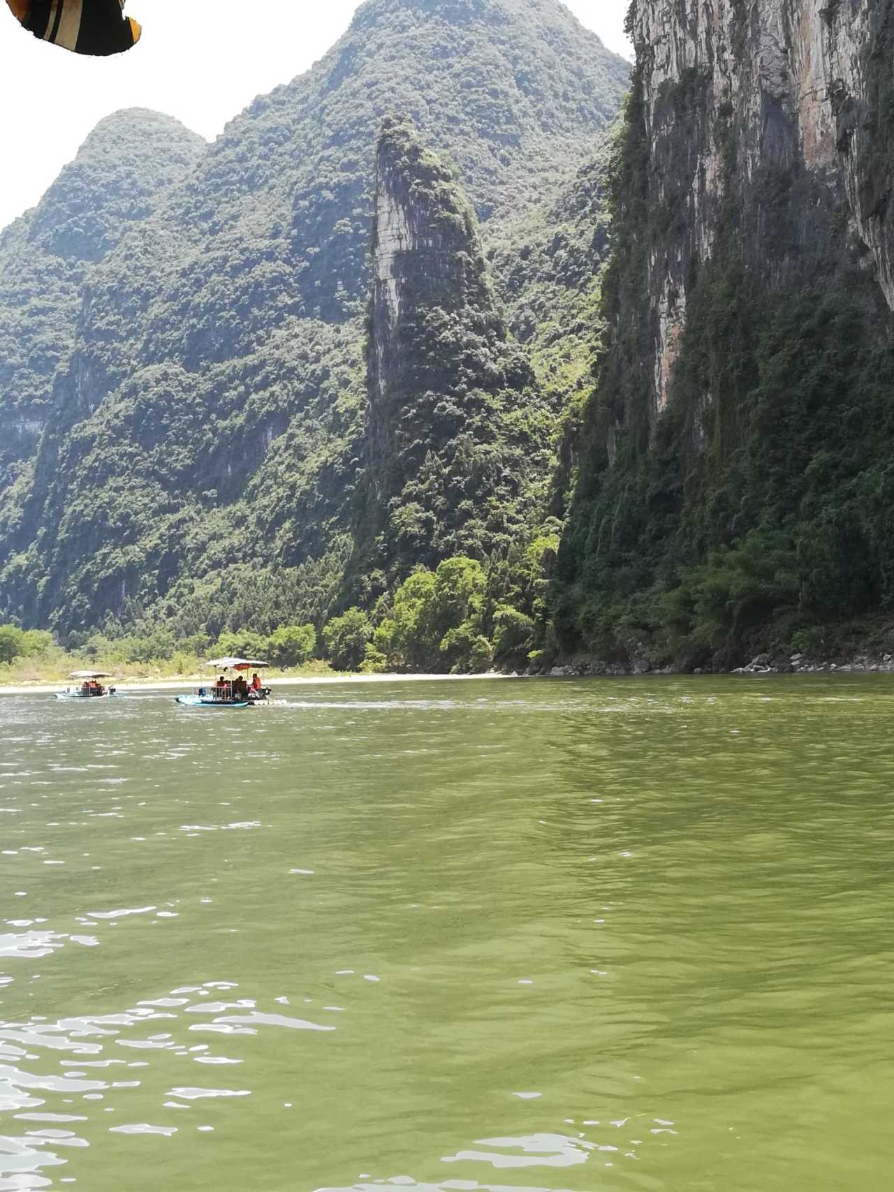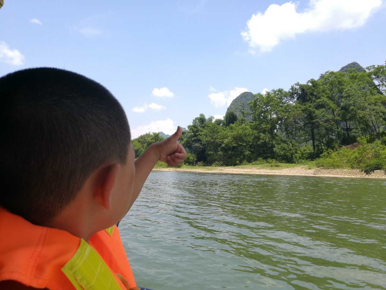 在这段竹筏之旅上,《桂林山水》那篇课文中的句子一点点的从回忆中冒出来,山确实是奇,秀,险,水确实静,绿,只是清实在是让瑞同学有些失望,只能再次和他普及一下保护环境的重要性,按理说写课文的那个年代水应该清得能看清水底的沙石吧。