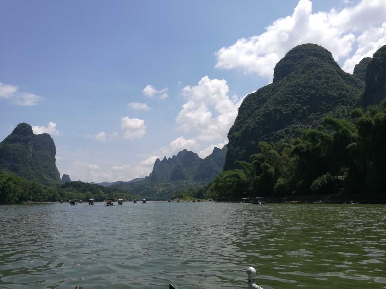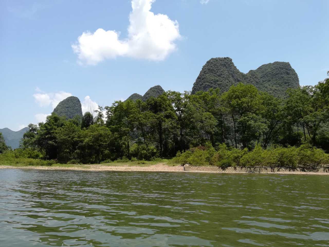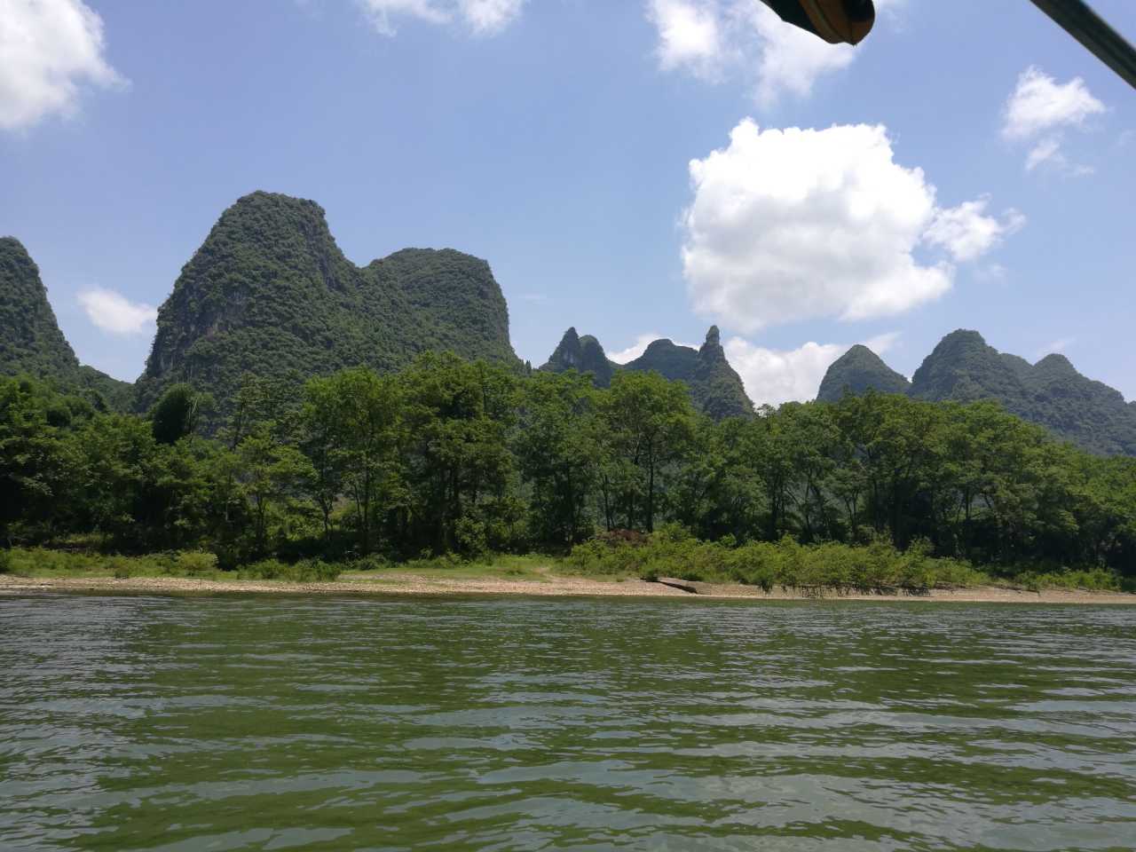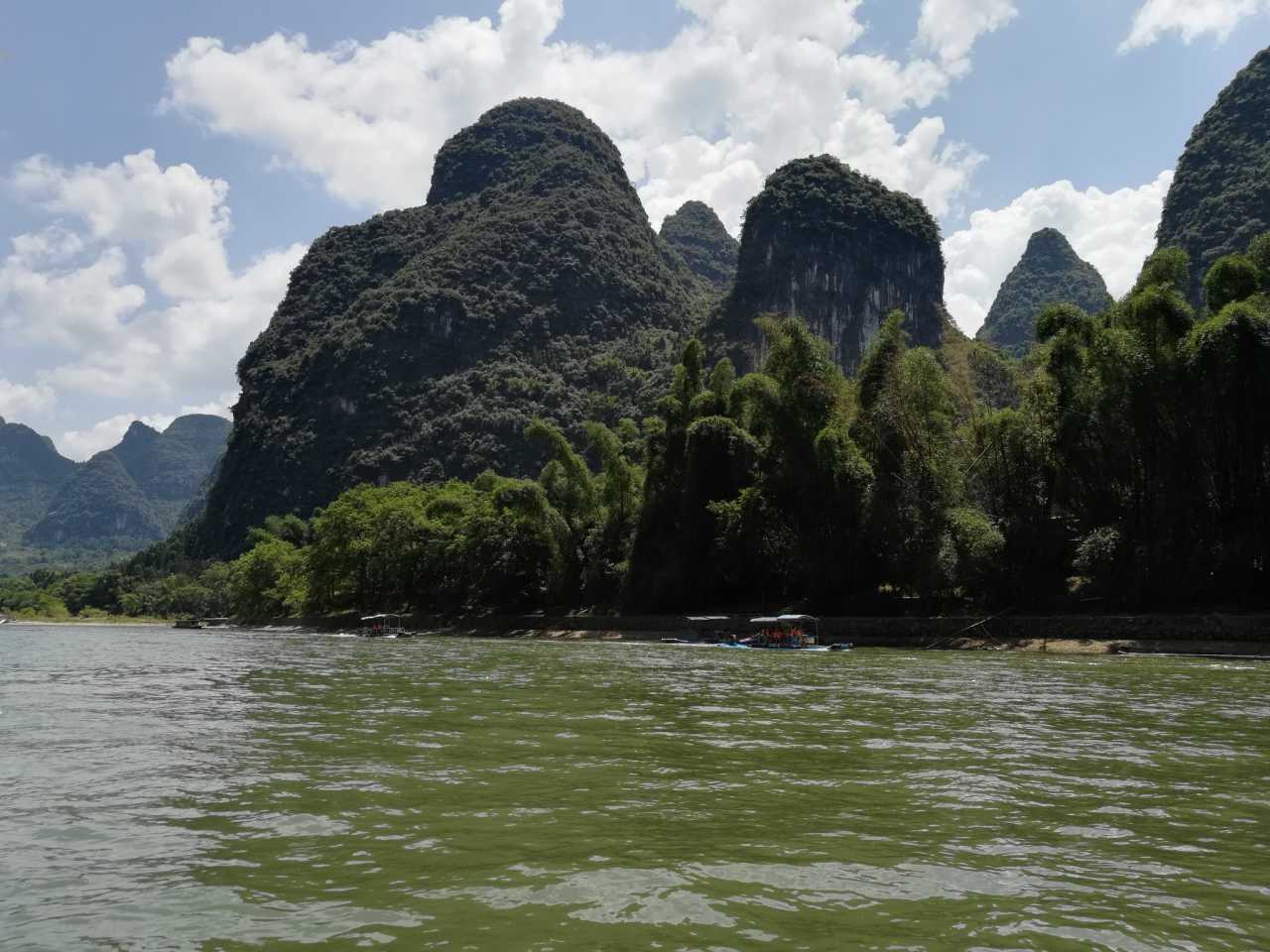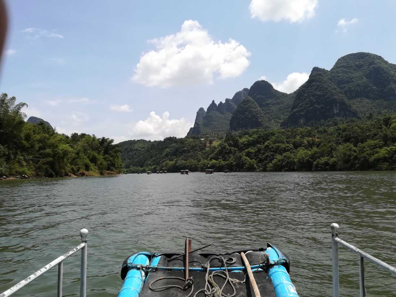 在这段竹筏之旅上,《桂林山水》那篇课文中的句子一点点的从回忆中冒出来,山确实是奇,秀,险,水确实静,绿,只是清实在是让瑞同学有些失望,只能再次和他普及一下保护环境的重要性,按理说写课文的那个年代水应该清得能看清水底的沙石吧。
