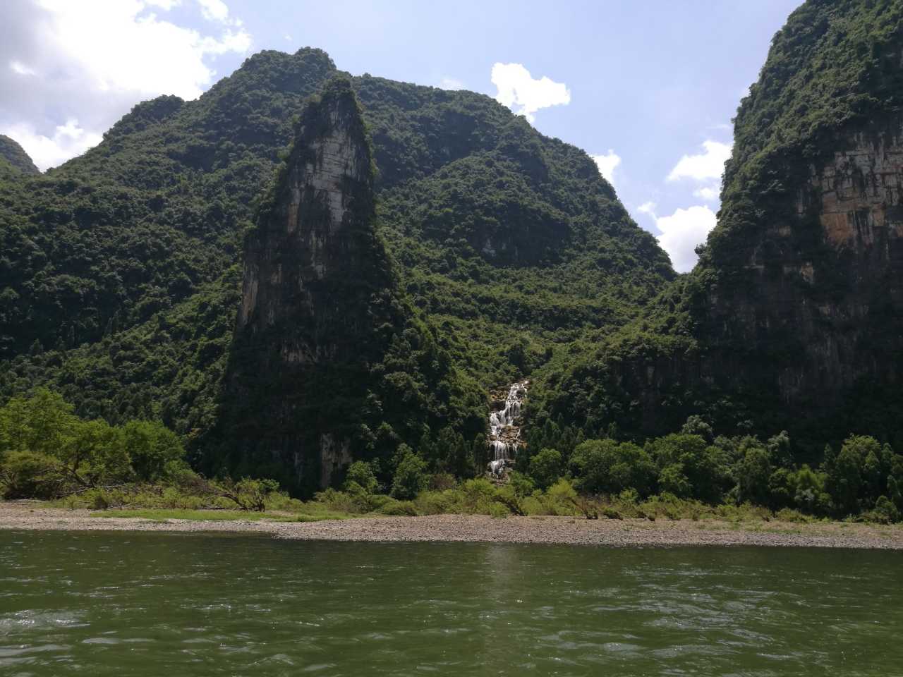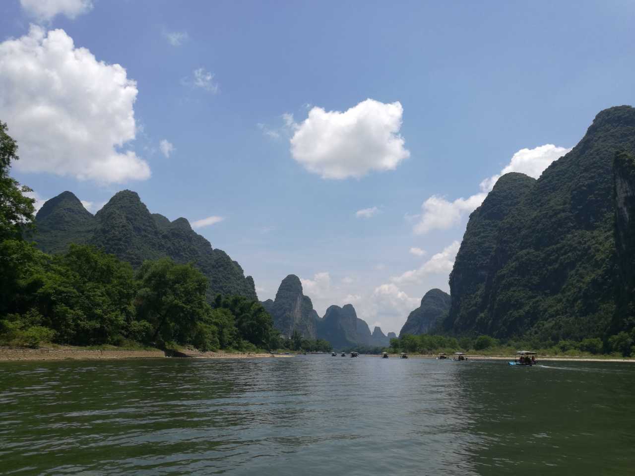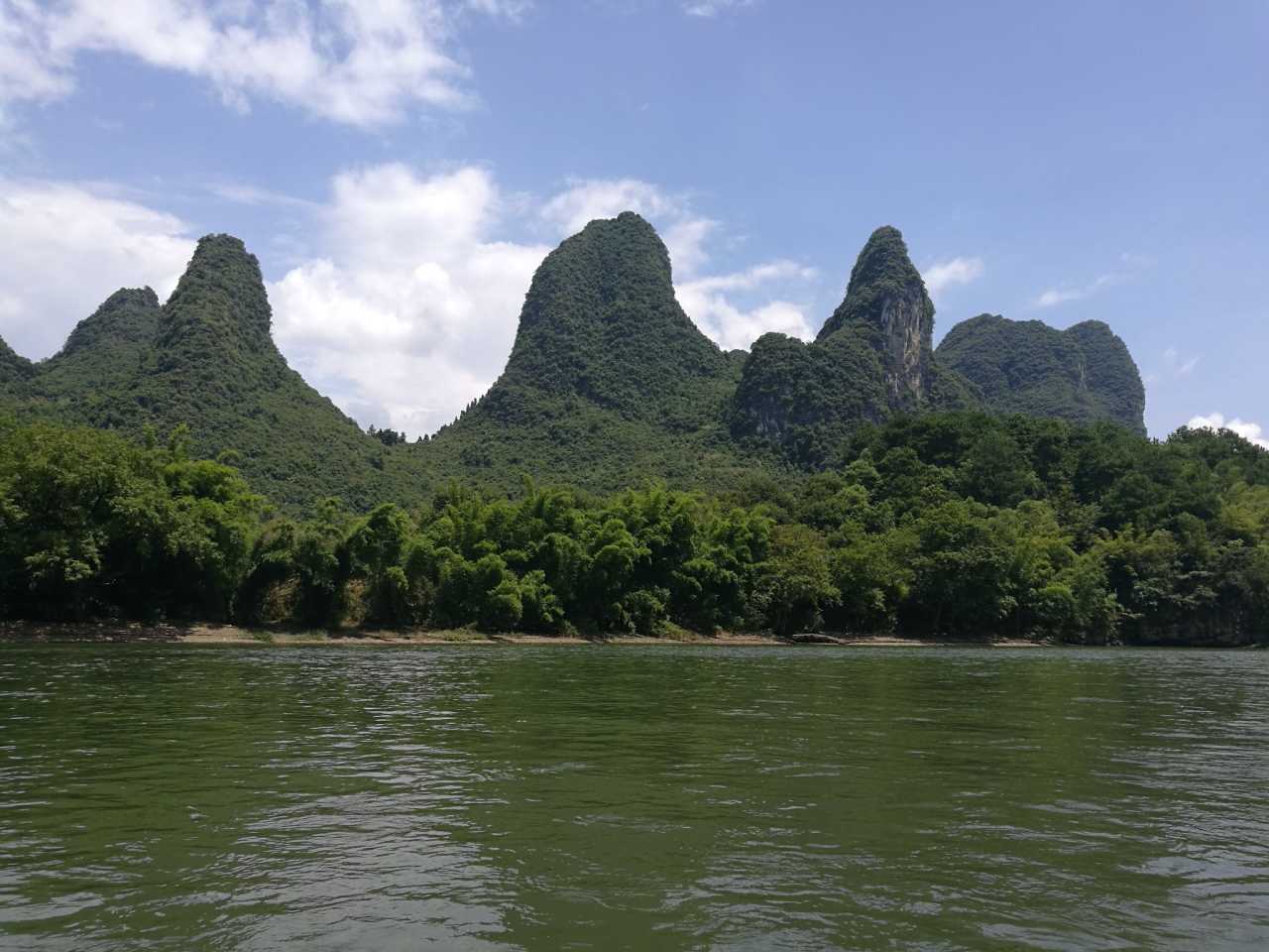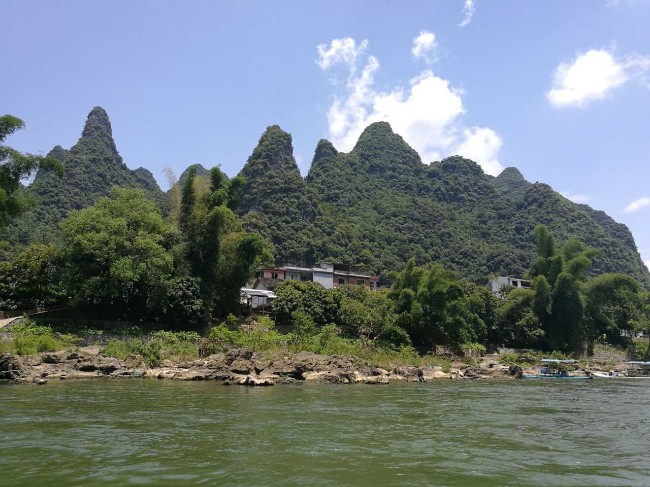 在这段竹筏之旅上,《桂林山水》那篇课文中的句子一点点的从回忆中冒出来,山确实是奇,秀,险,水确实静,绿,只是清实在是让瑞同学有些失望,只能再次和他普及一下保护环境的重要性,按理说写课文的那个年代水应该清得能看清水底的沙石吧。