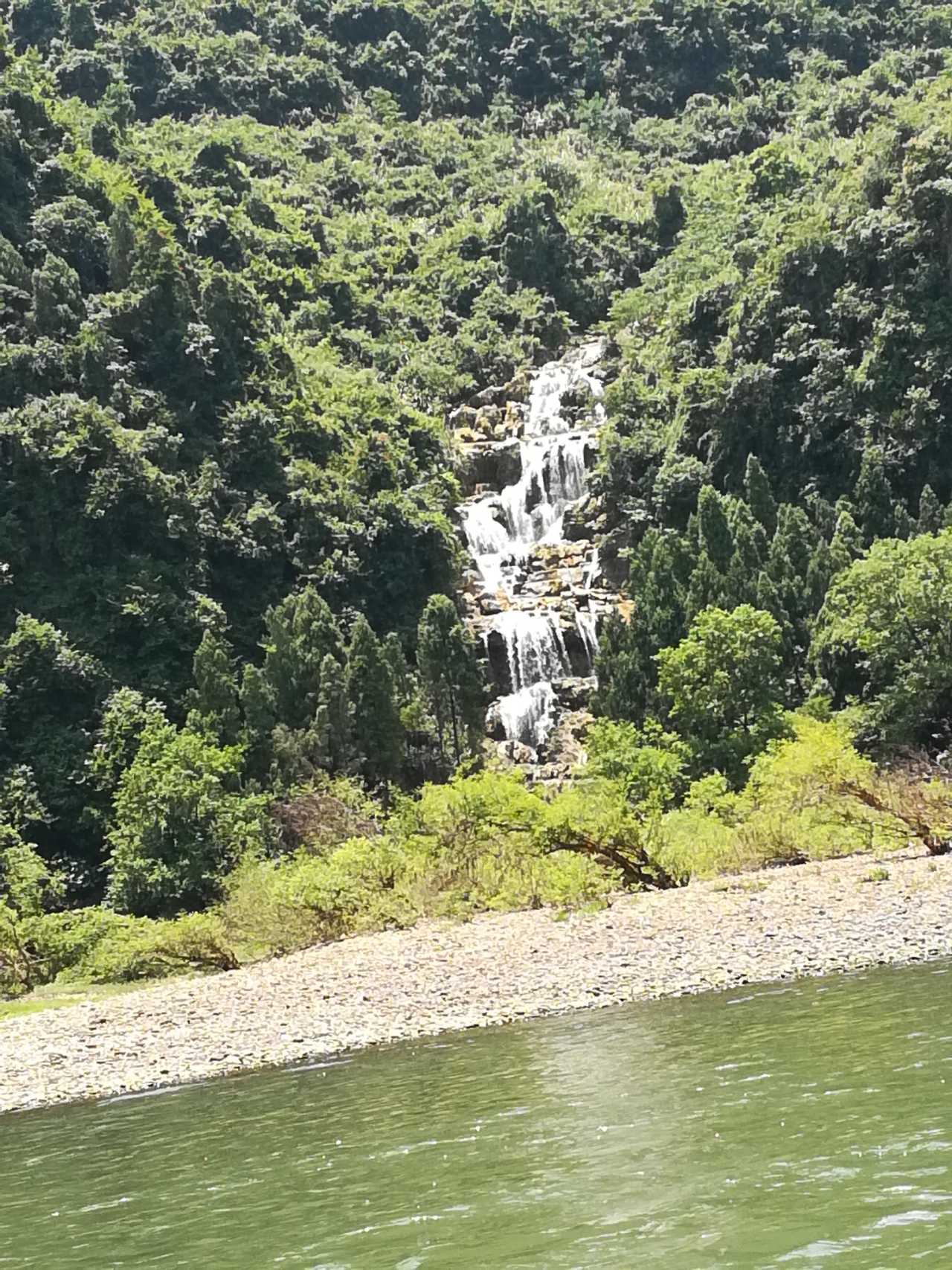 紧赶慢赶,正好在13.30分到达杨堤码头,接待人正在检票,我们3个交了一个人的空位费,包船上了竹筏,赶上的船工很和善,说好给20讲解费以后开的很慢,还沿路给瑞同学讲解旁边的山都像什么,他不说不觉得,说了以后就会越看越像。