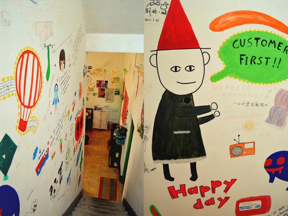 方糖 的楼梯 画了各种画 旅客只要有自信 都可以问店主要画笔 在墙壁上涂鸦