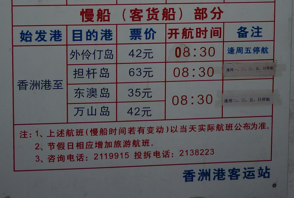 就是搭这艘船出发,因为旅客很少,一个星期只有三艘船到达,而且如果风浪大一点,船就会停航,所以在出发之前先打电话咨询香洲码头那边的情况为妙。