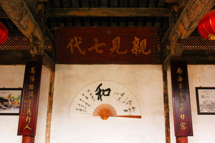 中间墙上有民国二年匾:親见七代。柱上楹联:南海岸来一瓶甘露,高阳桥渡千载行人。