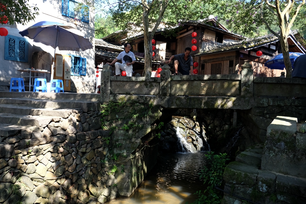 上百年树龄的金桂、紫荆在炎炎夏日正是枝繁叶茂时,常言道“大树底下好乘凉”,我见当地不少村民也都选择来此纳凉避暑了。桥下流水带来山风,头顶金桂散发清香,人们在这里话家常,真是好自在啊!这里还有一家传统手工的百年豆花作坊,食客们可以根据自己的喜好加入、糖、酱油、果脯等佐料,我尝了一碗,味道非常不错,口感嫩滑且有浓郁的豆香,价钱也很便宜,您若是来到桂峰村,可别忘了来尝尝。