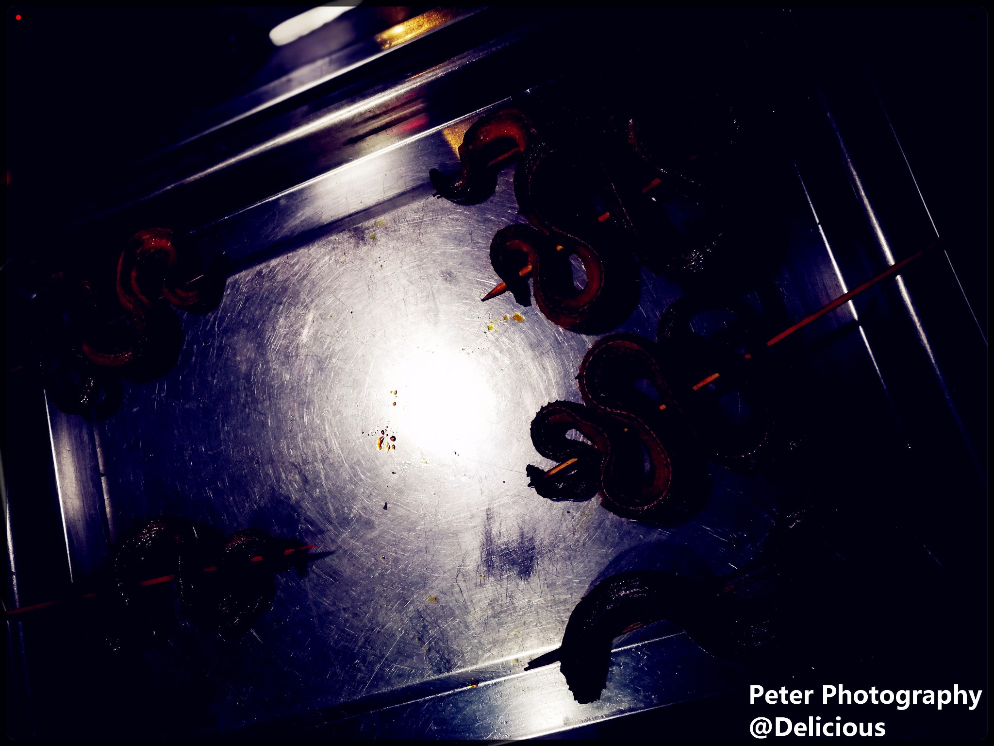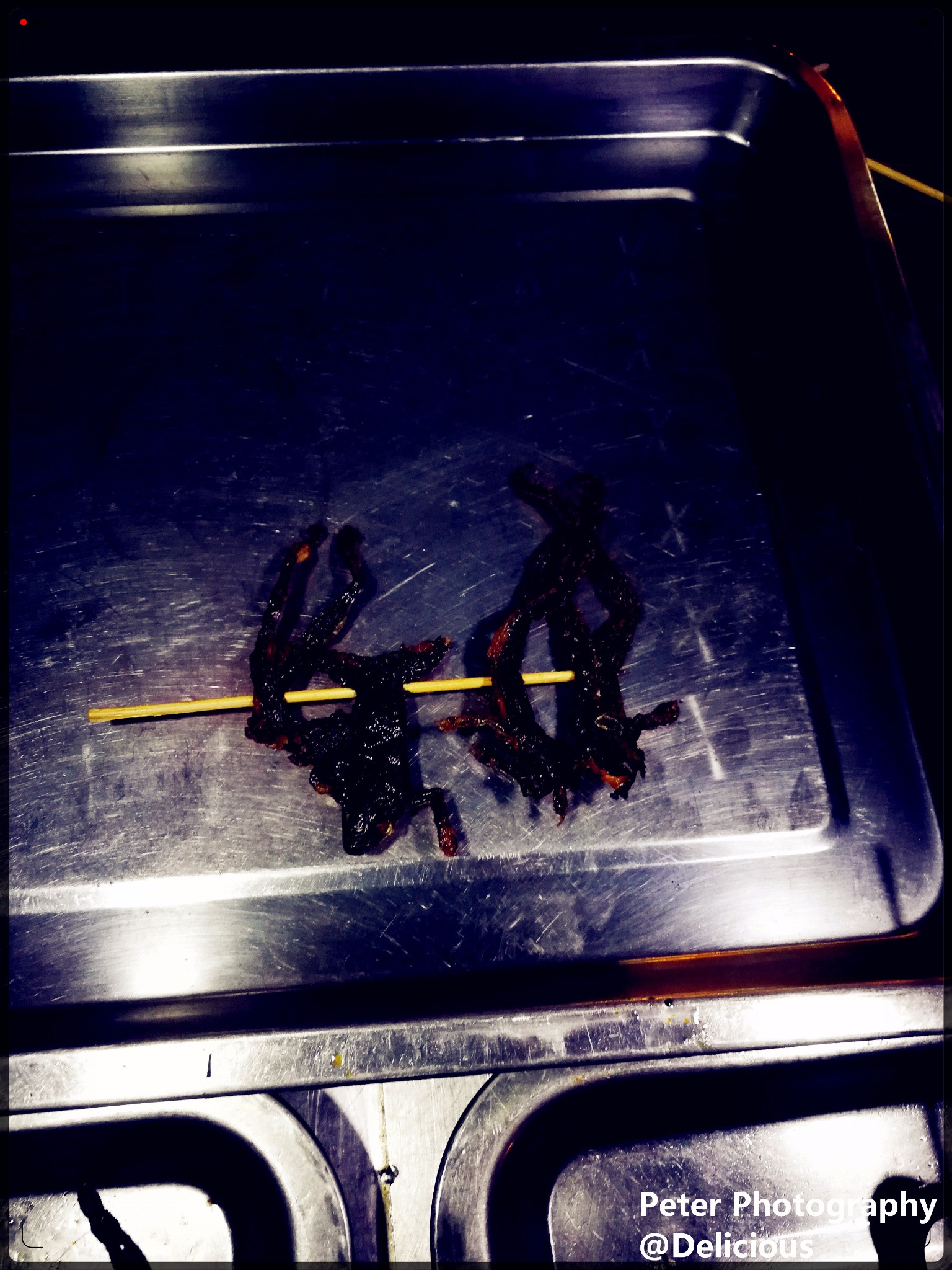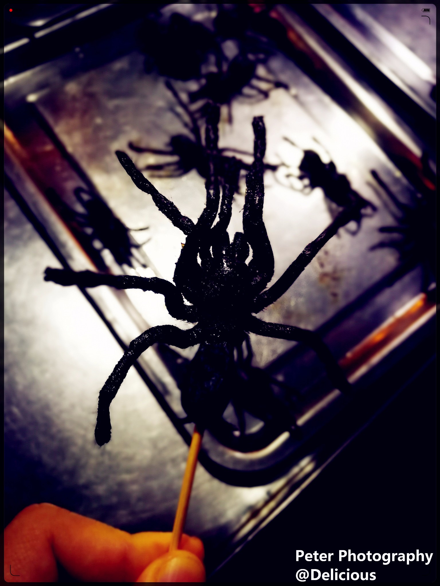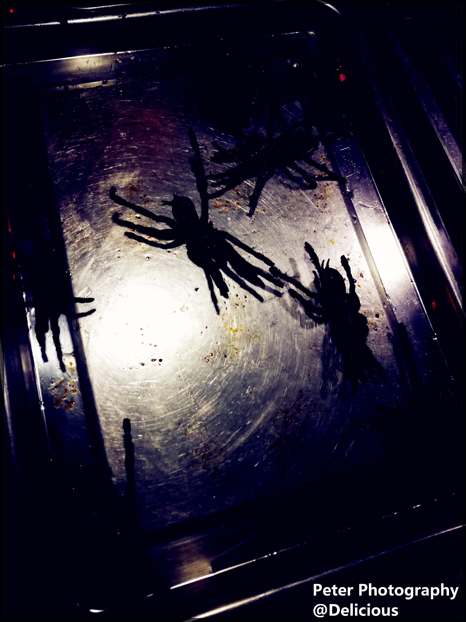 在纠结了好久并鼓足了勇气之后,我点了一只炸蜘蛛,据说这个蜘蛛是狼蛛,有毒,不过在捉住之后毒牙就给拔掉了,可以放心吃。味道怎么说呢,鸡肉味嘎嘣脆,蛋白质的含量很高,吃一只的感觉就和吃了一只汉堡差不多,那叫一个饱。