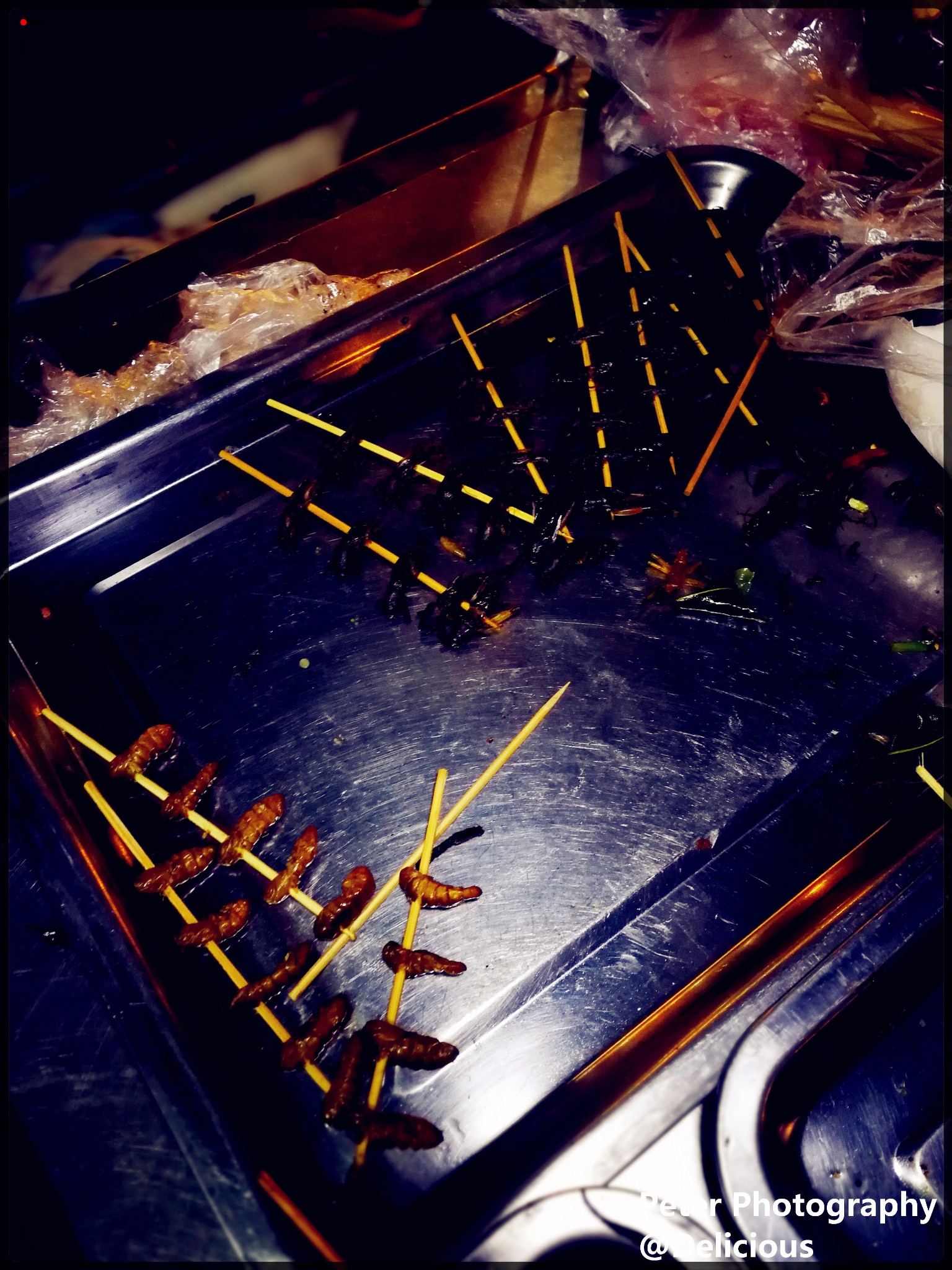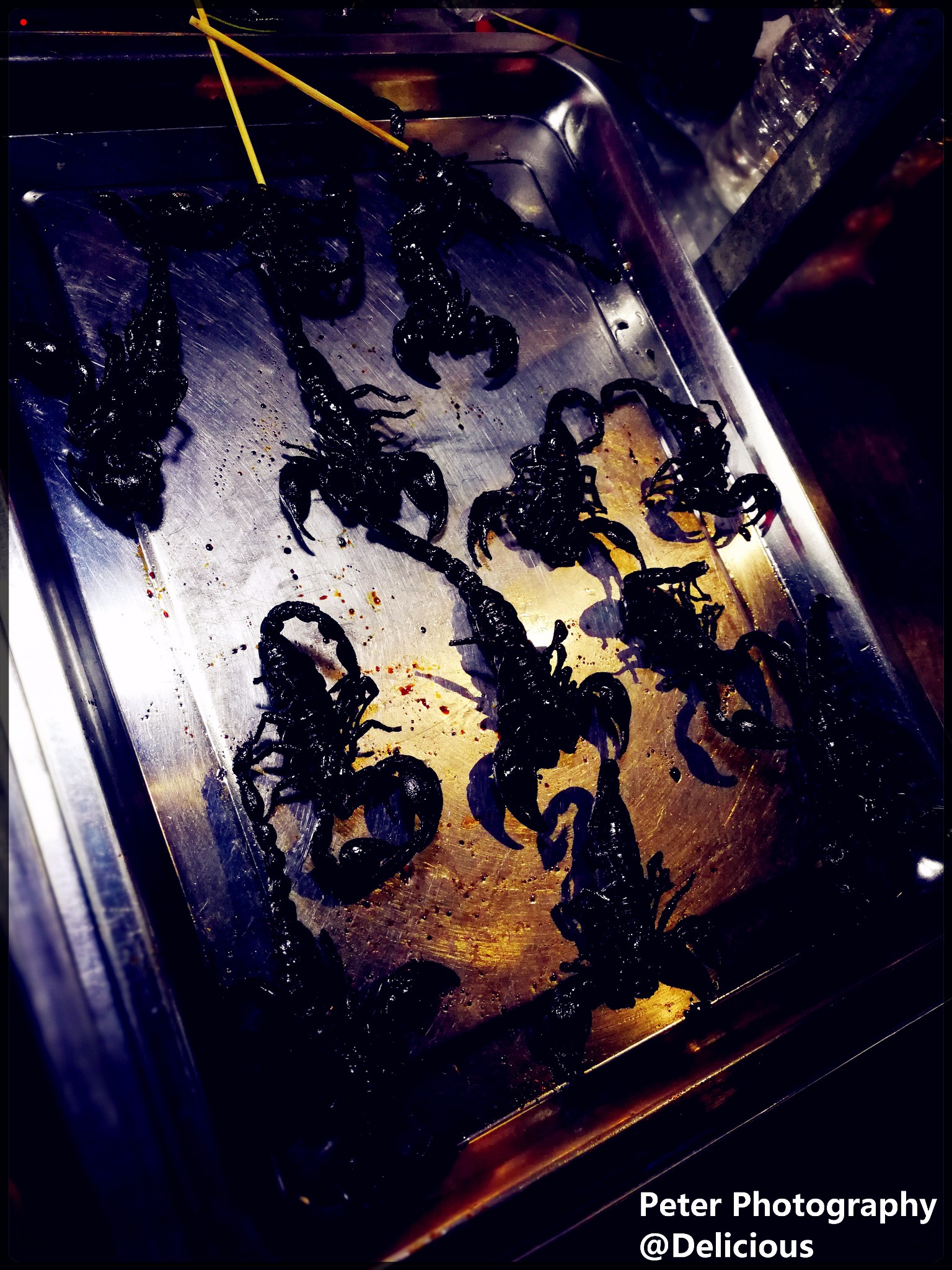 在金边和暹粒的夜市里可以找到不少卖炸昆虫的摊位。昆虫的品种不少,有蜘蛛、蛇、蝎子、水蟑螂、蚕蛹和蟾蜍(貌似差个蜈蚣就可以集齐五毒了),一般来说,只要买东西的话就可以拍照,不买的话是不让你拍照的。