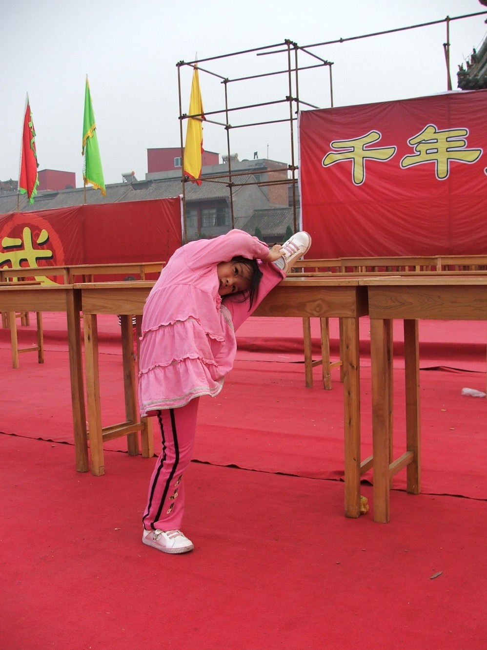 看到哥哥姐姐练功, 她也忍不住练起来.