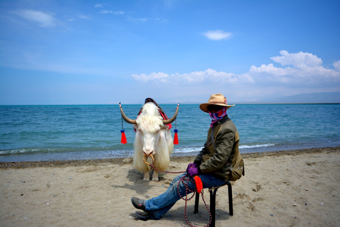 还是白色的牦牛漂亮! 它是中国青藏高原型牦牛中的一个珍贵而特异的地方良种。旁边的这位大叔是当地的牧民,这只白牦牛是她供游客来骑坐拍照的。