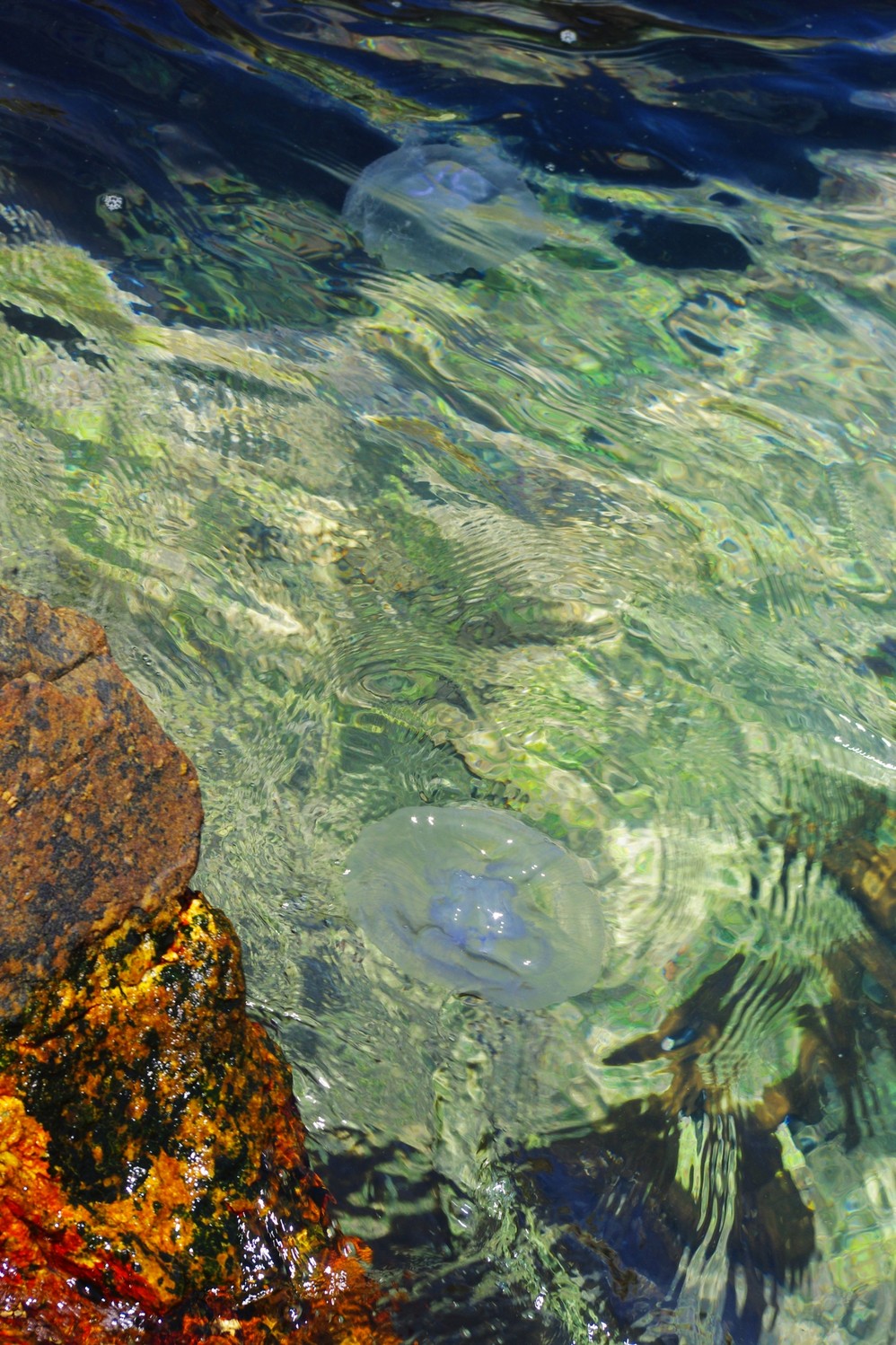 第一次看见水母,原来是这样的,据说会蜇人,没敢用手去碰。它在水中的样子很优雅,非常美,透明的身躯就像果冻一样,呵呵