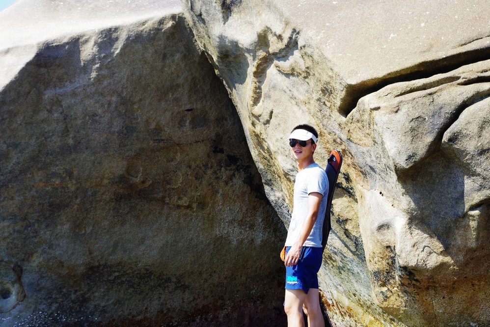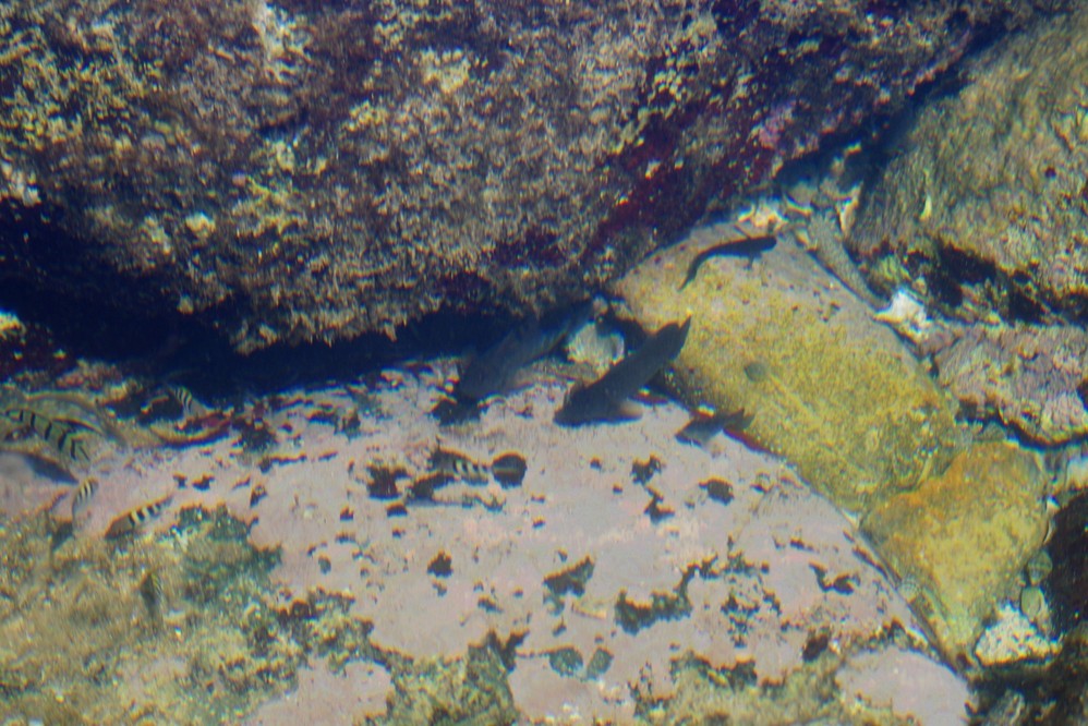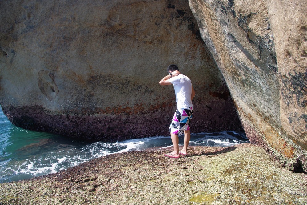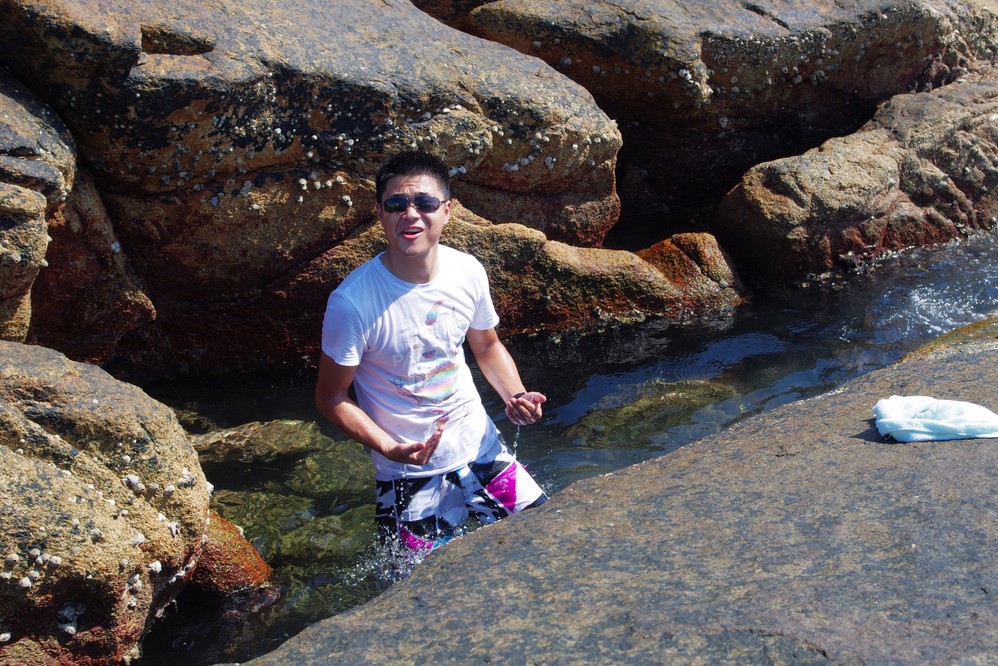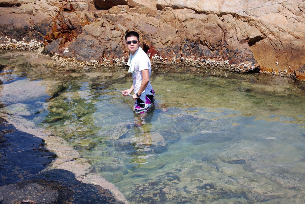 石头与石头之间有很多积水,在退潮的时候就形成了一个个封闭的小水坑,同时留下了很多贪嘴的小鱼小虾,人一靠近立马就钻进石头缝里了,然后鬼头鬼脑的等你走开了,又悄悄出来!