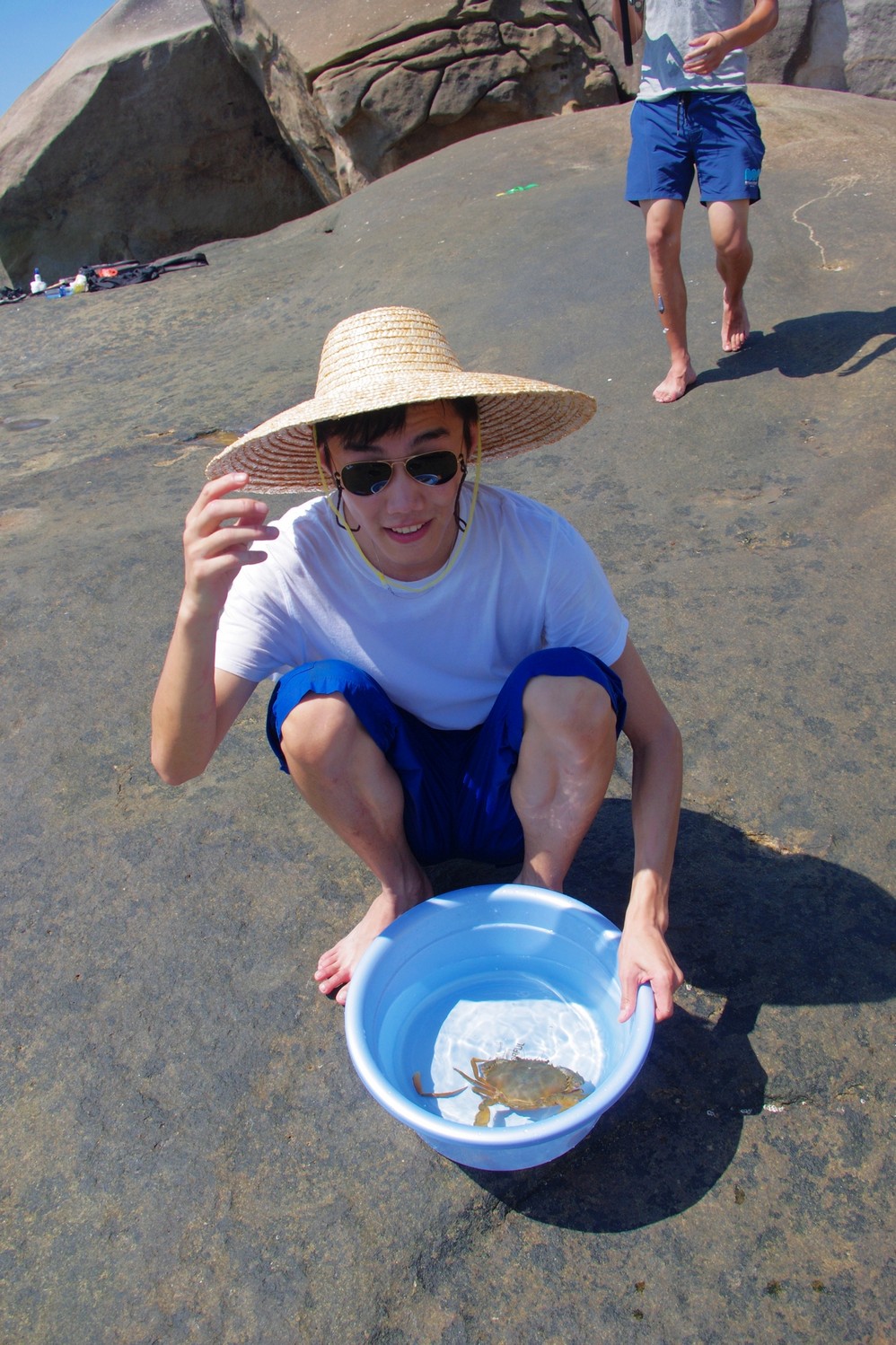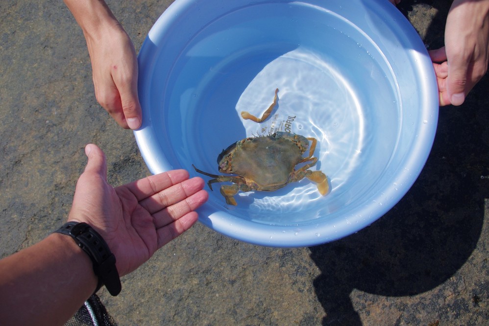 瞧,还是有只螃蟹被我们钓上来了,很大个,有一个半手掌那么大,今天晚上刚下锅煮了,很大一块蟹黄。哈哈