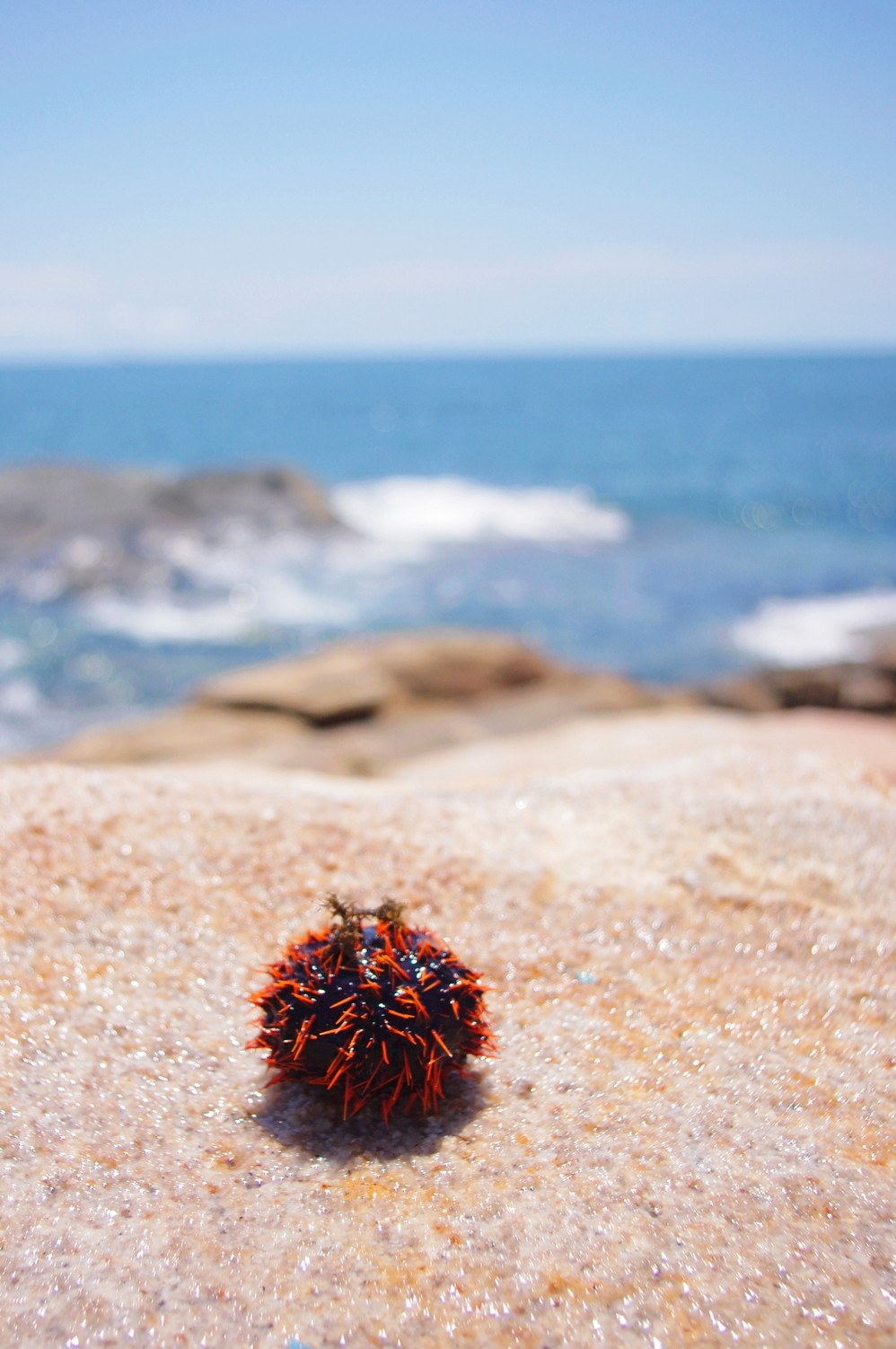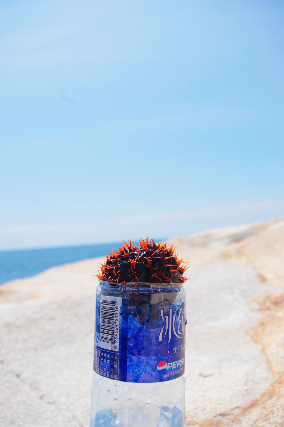 捉到一个这个东西,应该是海胆吧,不过海胆好像是黑色的吧!不太确定,这只很大,我把他放在瓶口的时候还在不停的蠕动,橘黄色的刺看起来很扎!