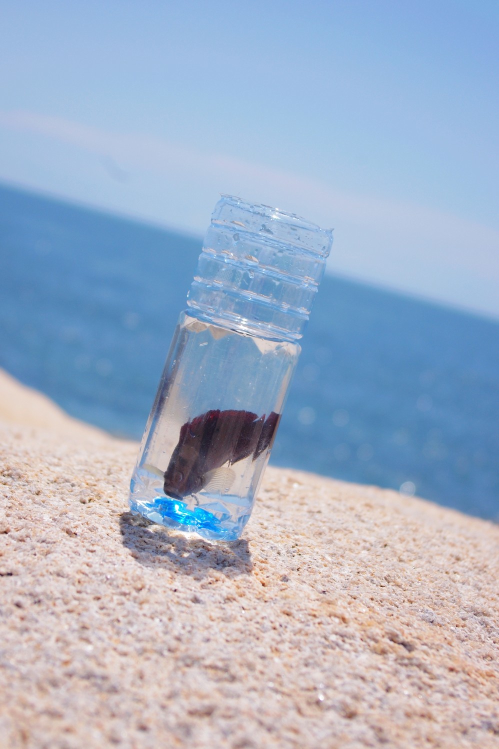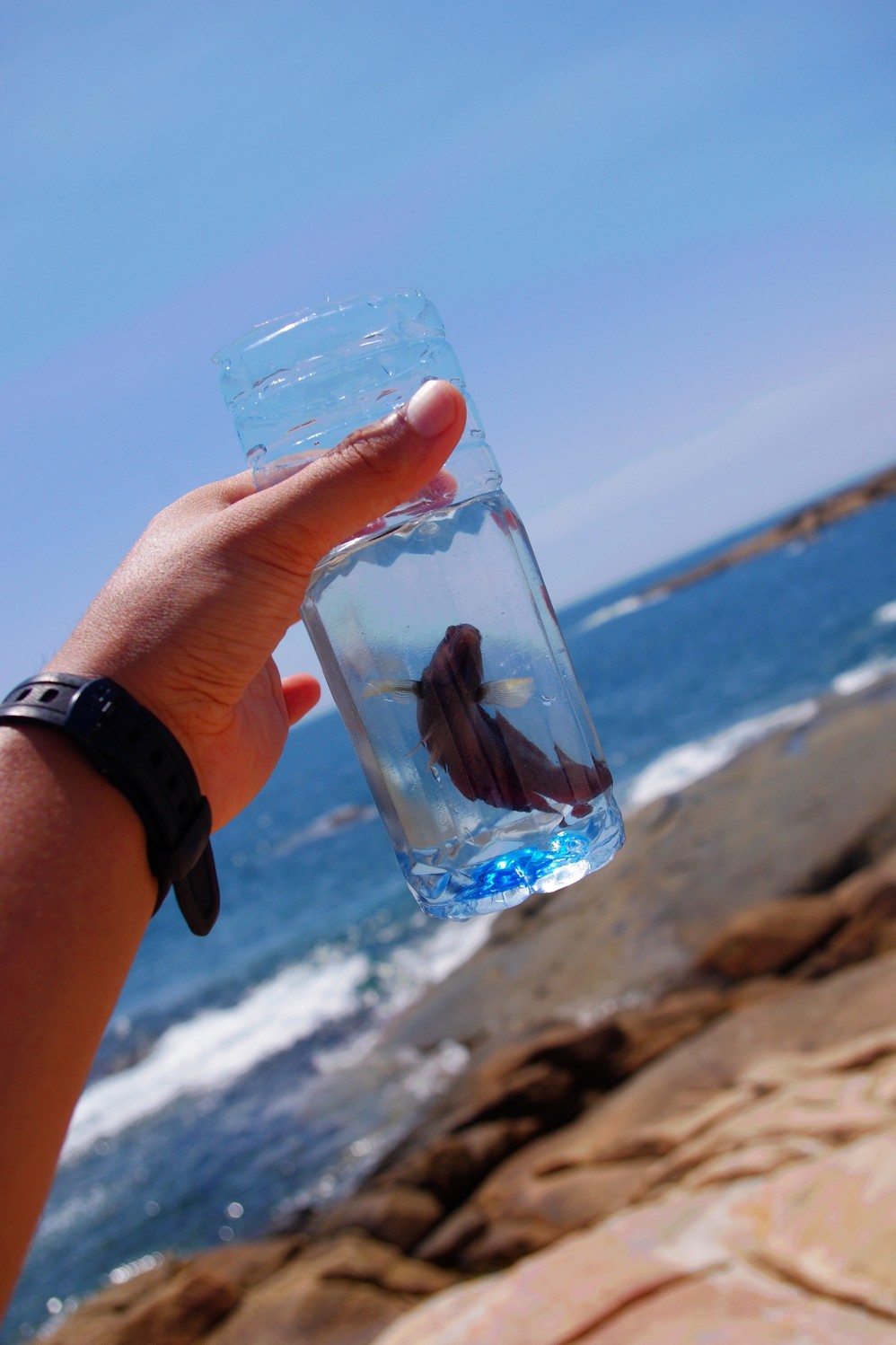 这只鱼在里面起初很挣扎,后来慢慢的就老实了!身处一只小瓶水里 ,身后却是茫茫的大海,它是不是也觉得倘若一瓢足矣,又何须那若水三千呢!身处繁华都市的我们或许真得像这只小鱼一样淡定一点!