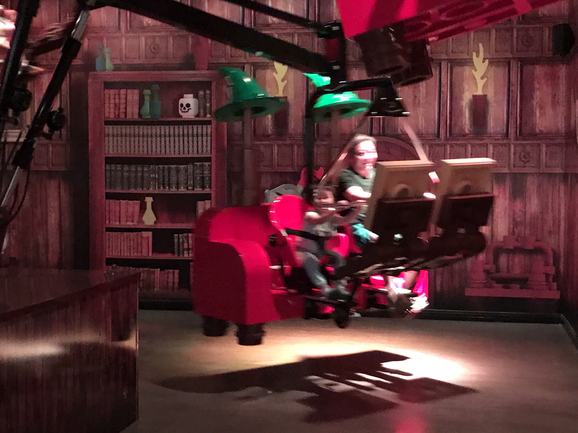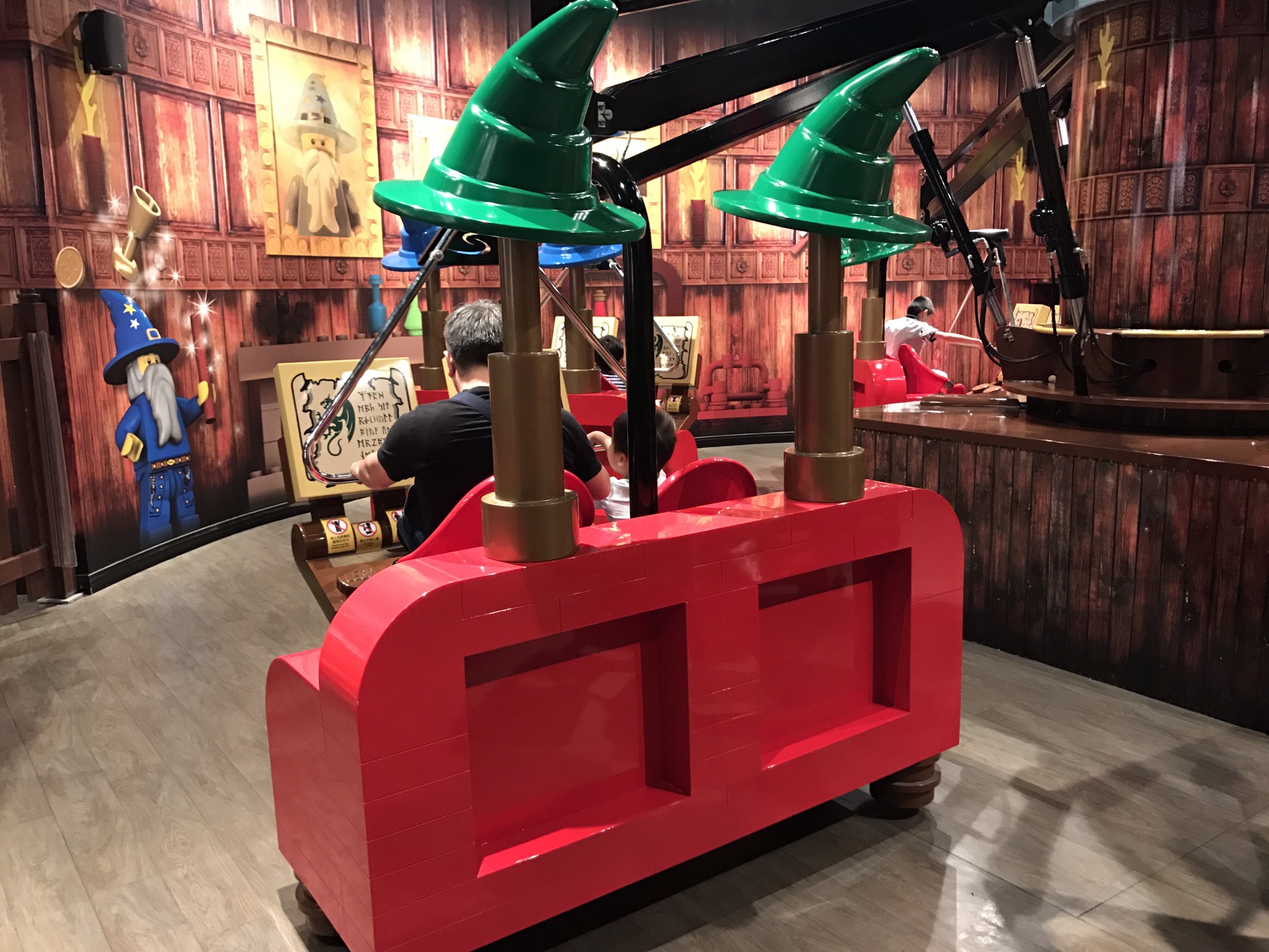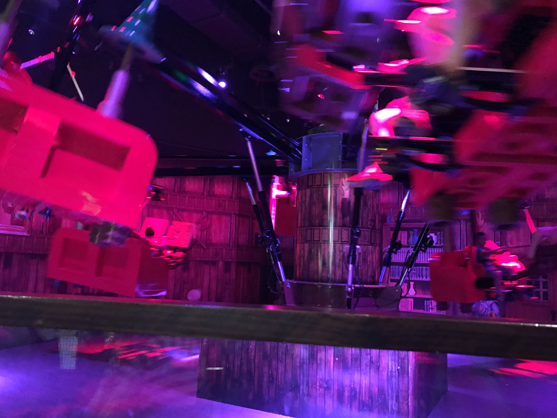 另一个好玩儿的是魔法转盘,类似小飞象,但是升高降落是靠脚下踩的,我这么小哪里踩得到呢,只好身边爸爸用力就高点他懒惰就低点。还是很好玩的,晚上人不多坐了两次。不过这个排队很慢的,看看人不多但一次只能放六七个大人,有些大小朋友是一人两个座位的。
