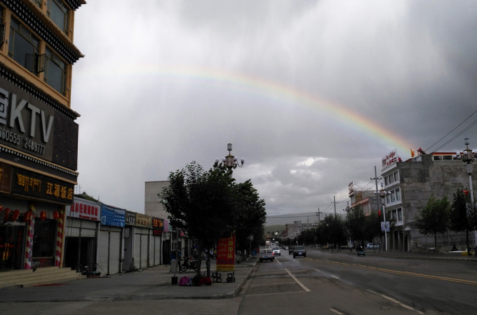 阿坝天黑的晚,我们安排好后,大约6点半出来吃饭,居然在街上看到了彩虹。
