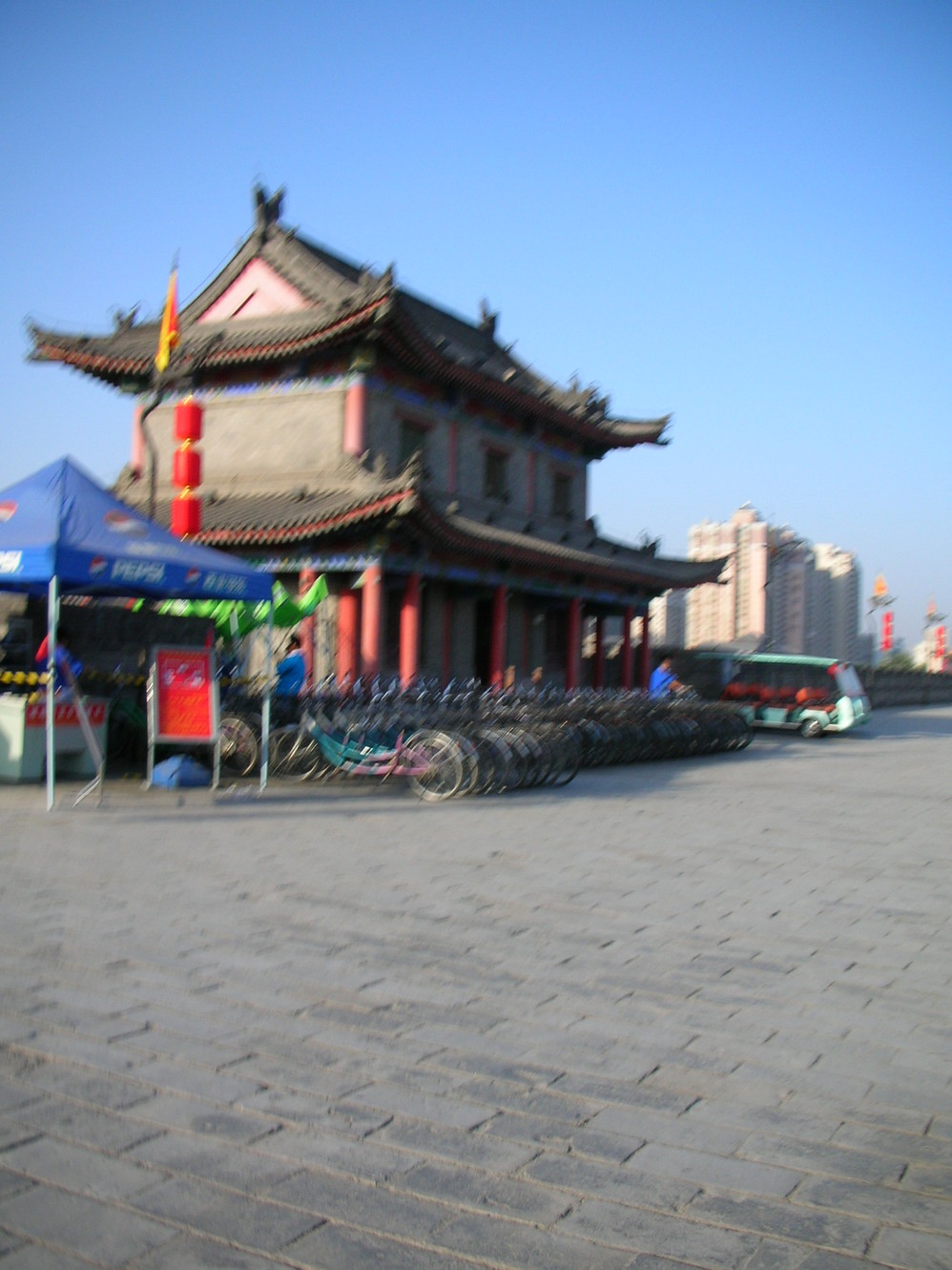 待出租的自行车, 城楼上感觉还不错,最好在夕阳西下的时候骑自行车骑一圈,14公里要骑2个小时,下午太热,六点钟以后最好。电瓶车要70分钟;50一人;10人满了走.