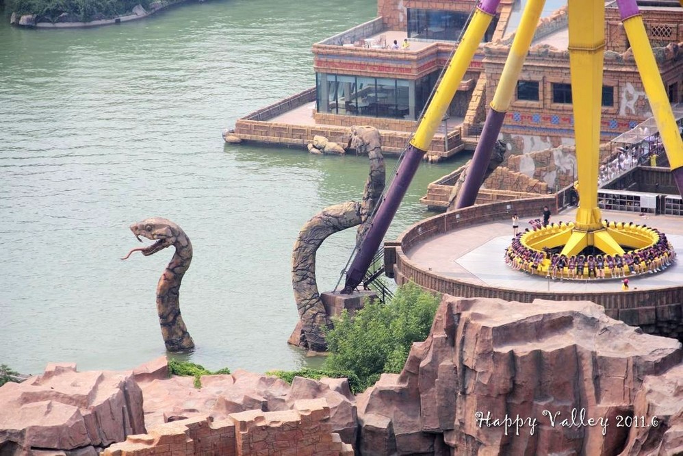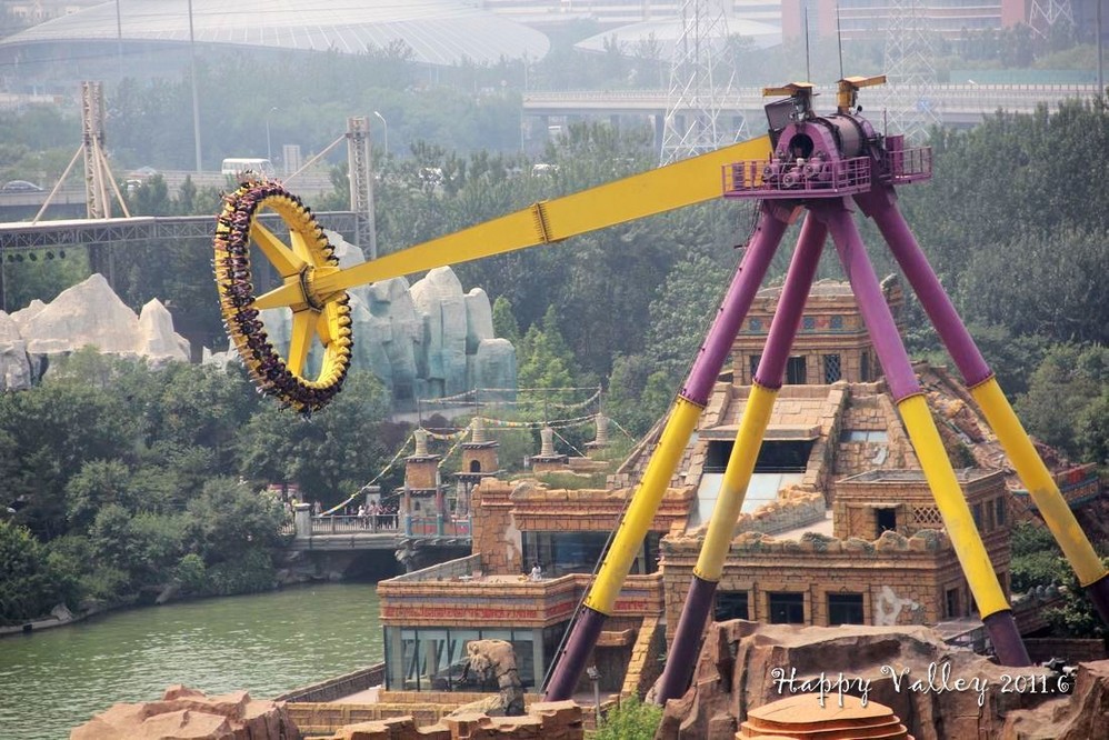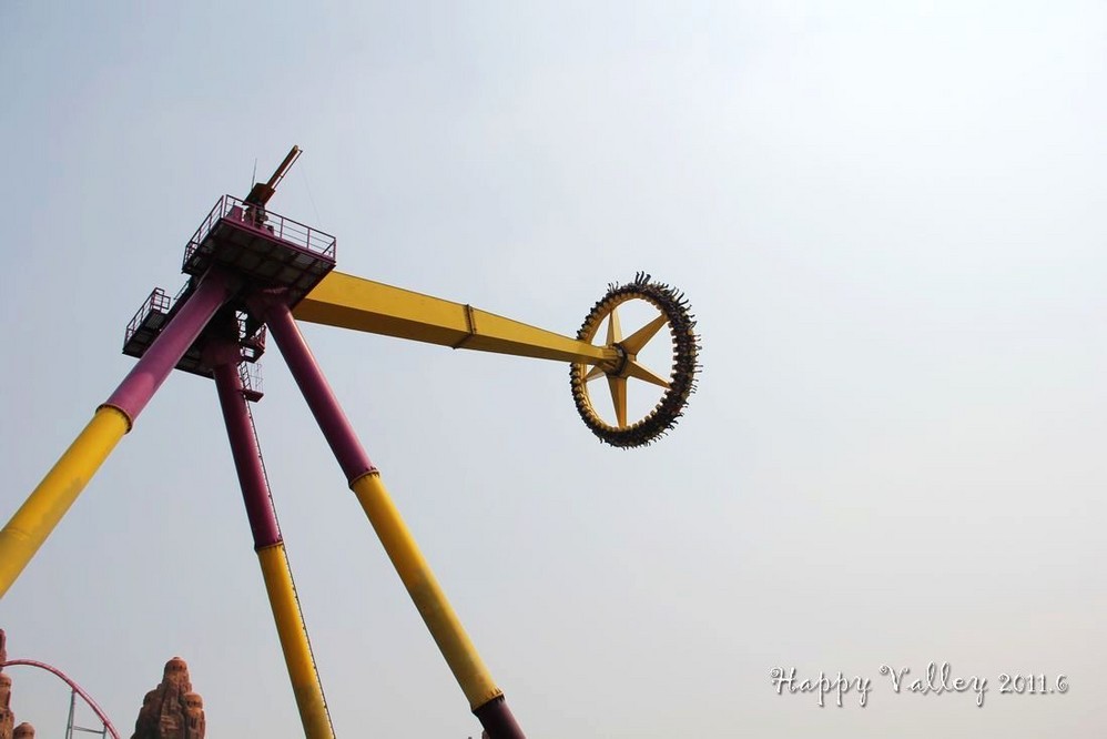 “太阳神车”位于玛雅王国的太阳金字塔神庙与太阳广场之间,是亚洲 最大的大摆锤。走进乘仓,跟这个120吨的庞然大物一起疯狂吧。一台齿轮电机驱使神车自身旋转。同时,6台大功率的异步驱动电机同时启动,为我们创造4.3G的加速度,瞬时飞跃至15层楼高的高空。我有幸体验到了这一天地之间独有的惊心动魄。不过听说现在的速度比刚开始的时候还调慢了不少呢。