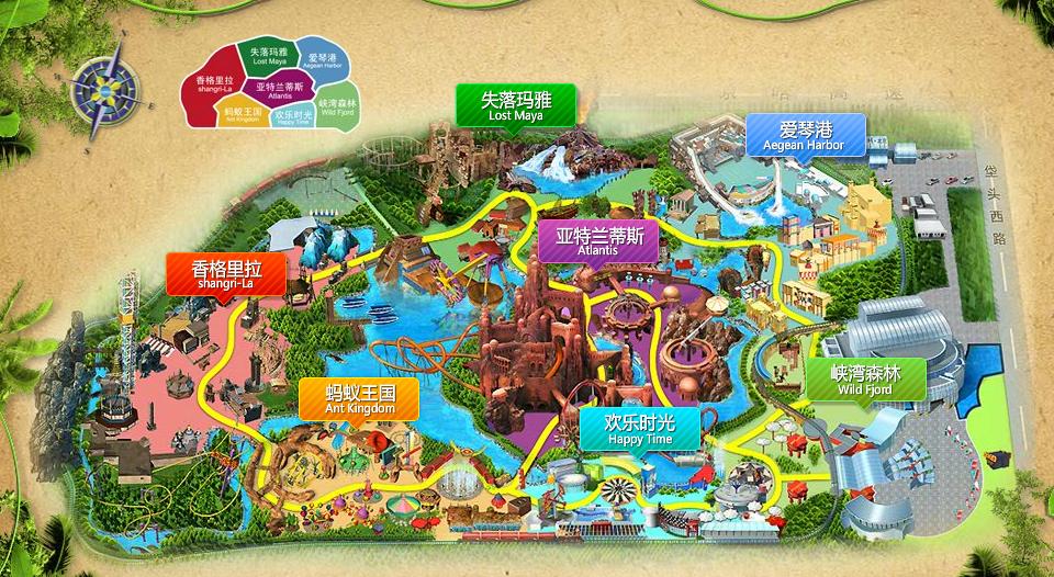 公园内分别由峡湾森林、亚特兰蒂斯、失落玛雅、爱琴港 、香格里拉 、蚂蚁王国和欢乐时光七个主题区组成。年轻人可以尽情领略水晶神翼、太阳神车等世界六大顶级娱乐设备的超炫体验,充分感受香格里拉 《金面王朝》带来的浪漫与神秘。还有国内最高的发射过山车“极速飞车”。老年人可以沿着爱琴港湾、玛雅小镇的足迹,登上舒缓的亚特兰蒂斯聚能飞船,寻找历史的遗迹,梳理文明的脉络,感受各大主题分区梦幻般的人文魅力。儿童可以走进蚂蚁王国,鲜活了解社会、自然与生态的种种知识,在参与体验中领悟加速度、失重感,感受植被的多样性,艺术的趣味性,还有色彩、自然、音乐和运动。