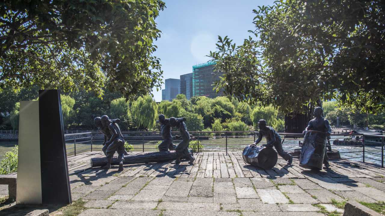 沿着运河岸边可以继续向上游走一段,运河上依然可以看到来回繁忙的货船,旁边的几尊雕塑作品和老旧起重机,试图还原当年运河码头繁忙的船运景象。