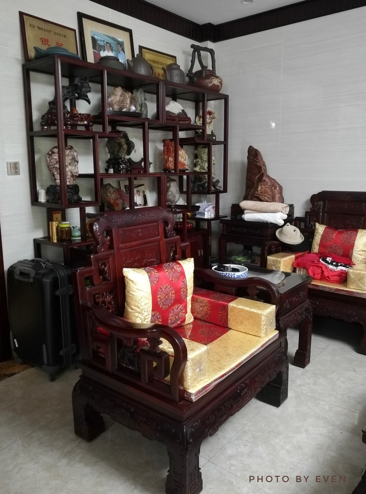 可别小看了这里的茶楼,虽说是私房营业,但家里的布置却不马虎,且不去研究是真是假,但就这满满当当的中式摆饰与环境融为一体。老板也很随意,随你进进出出到处参观,直到开饭时,喊了一声。然后就这用餐的房间让我们一群人像无头苍蝇一样上下找了几遍,最后才发现原来房子内还有个隐蔽夹层。农家菜的量毋庸置疑,味道么实话讲没有惊艳之处,就当吃个家常便饭即可。
