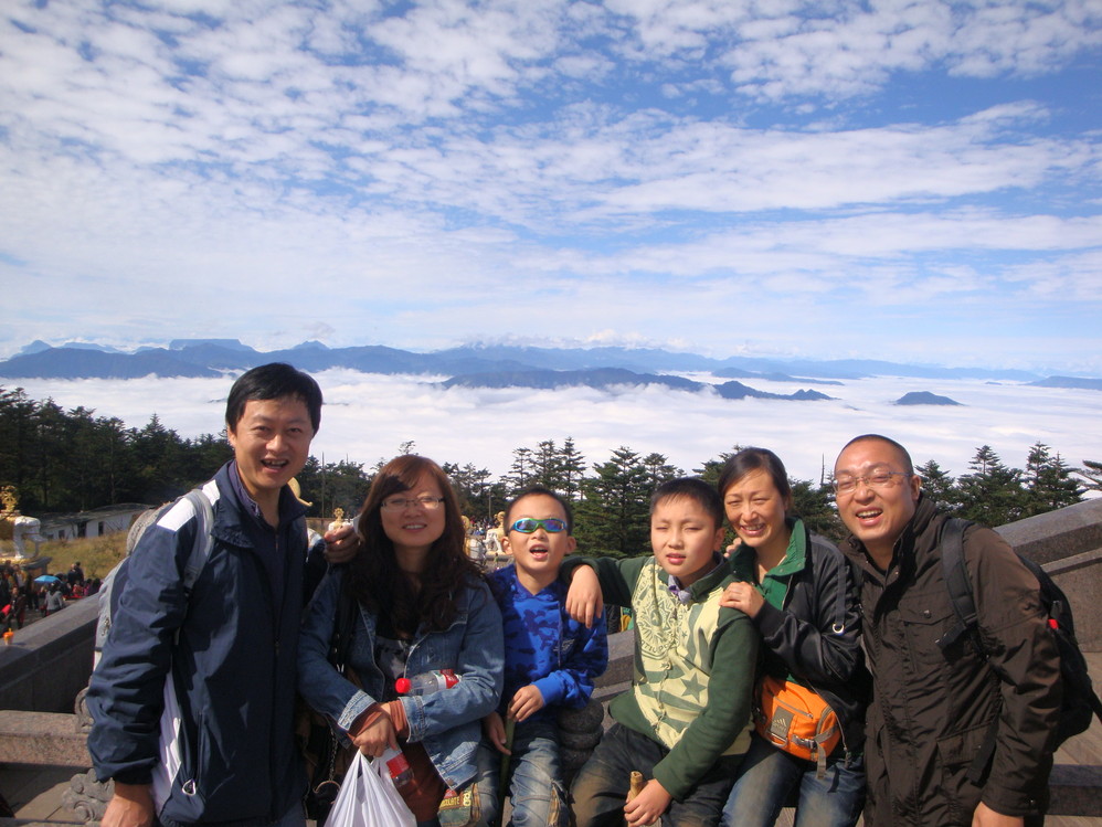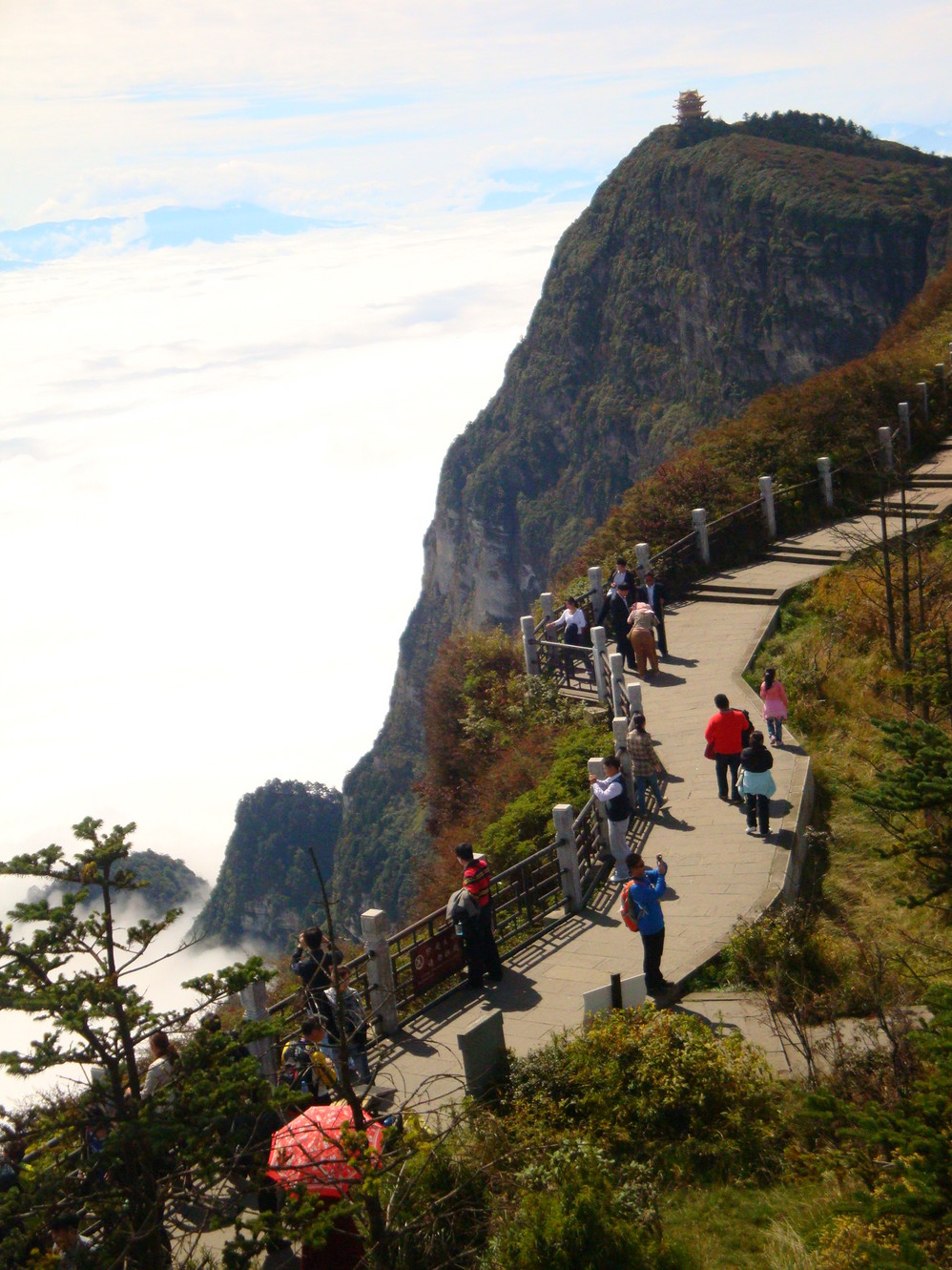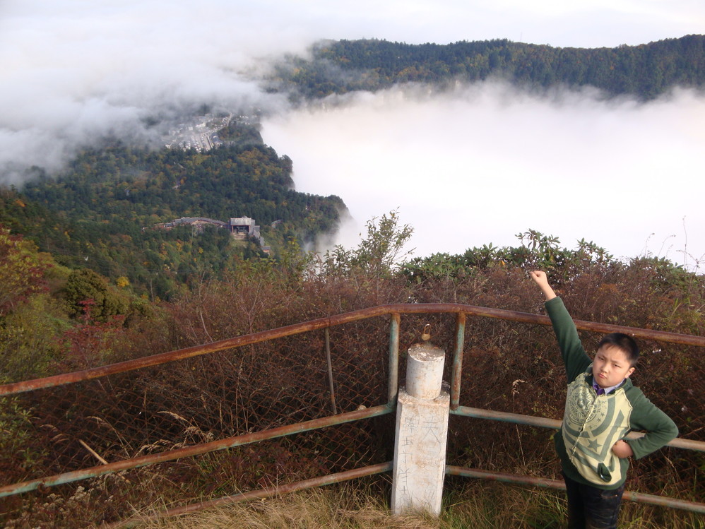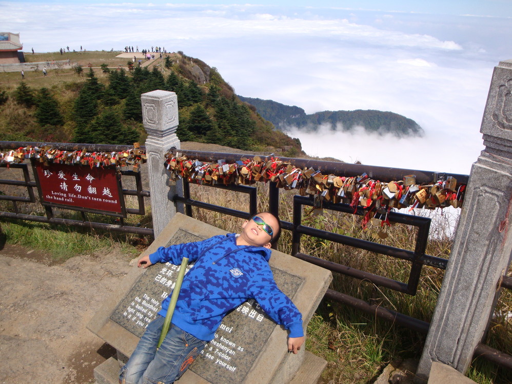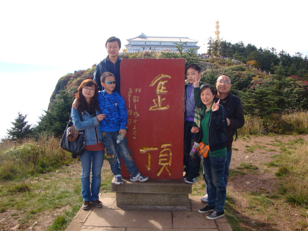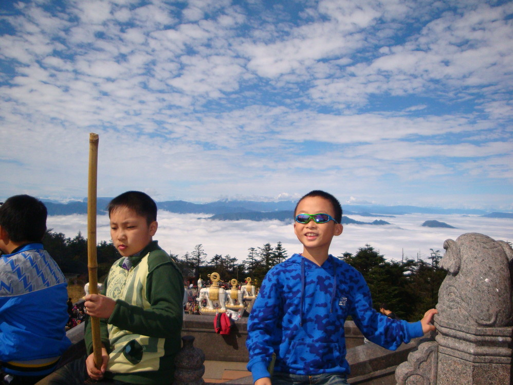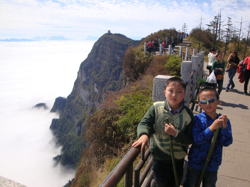 国庆“七天乐”没有安排外出节目,只在附近活动一下。偶尔和铁哥们一家谈起10月5日带孩子上金顶,因两孩子没有上过顶。4日还担心如5日下雨就取消活动。4日晚还在飘着小雨,5日7点起床时,地面部分已干了。于是,匆忙吃过早餐,迅速坐着联系好的面包车,8点钟准时从家里出发了。两个孩子很兴奋,一路上借着弯道夸张的倒来倒去和吼叫着。师傅开车开得快,开得好,老婆在到达零公里前就吐了两次。不过,吐了好像还好受多了。汽车爬到零公里时,我们已经隐约的感觉出今天山上的天气很不一般的好。过了零公里往上走的时候,沿路已经很多次的感受阳光普照。连续多天的小雨清洗天空,一切特别的清晰,久违的峨眉山美景呈现在眼前。都5日了,一路上汽车和游客一个也不见少,呈拥挤状态。
