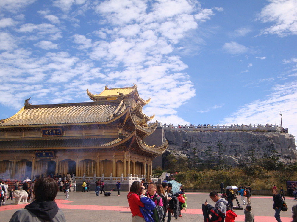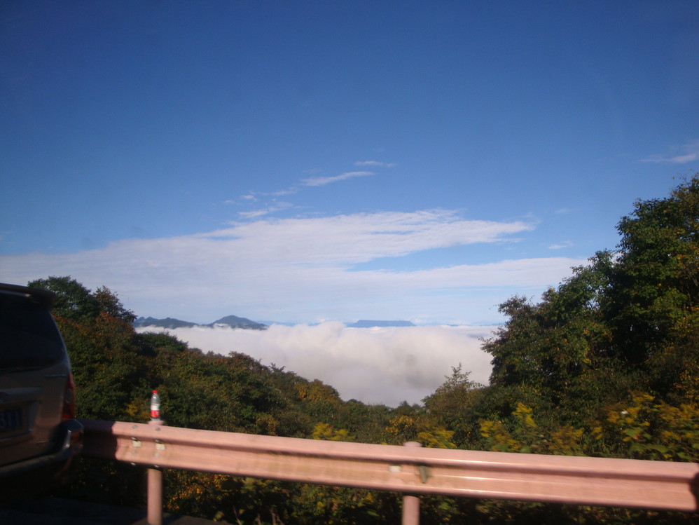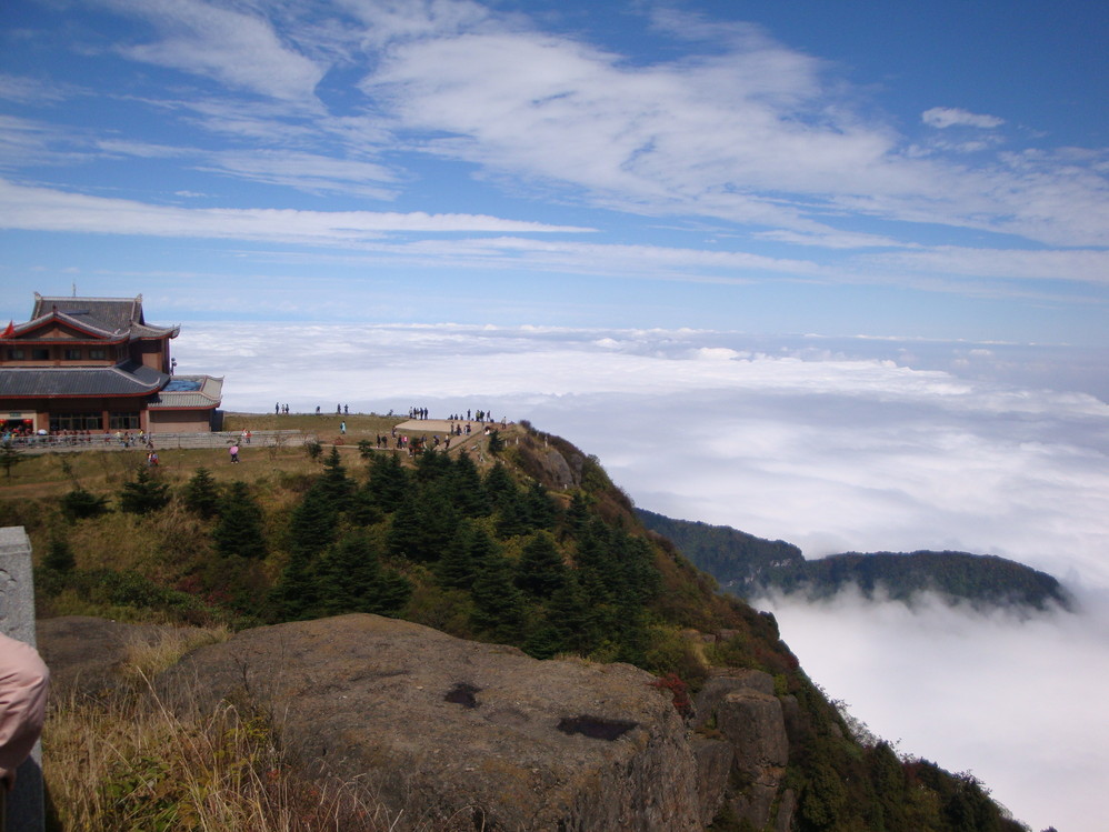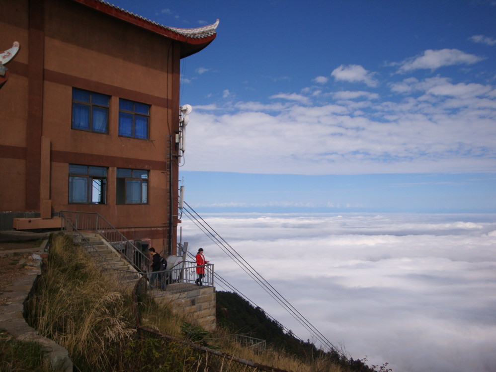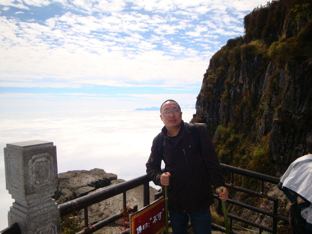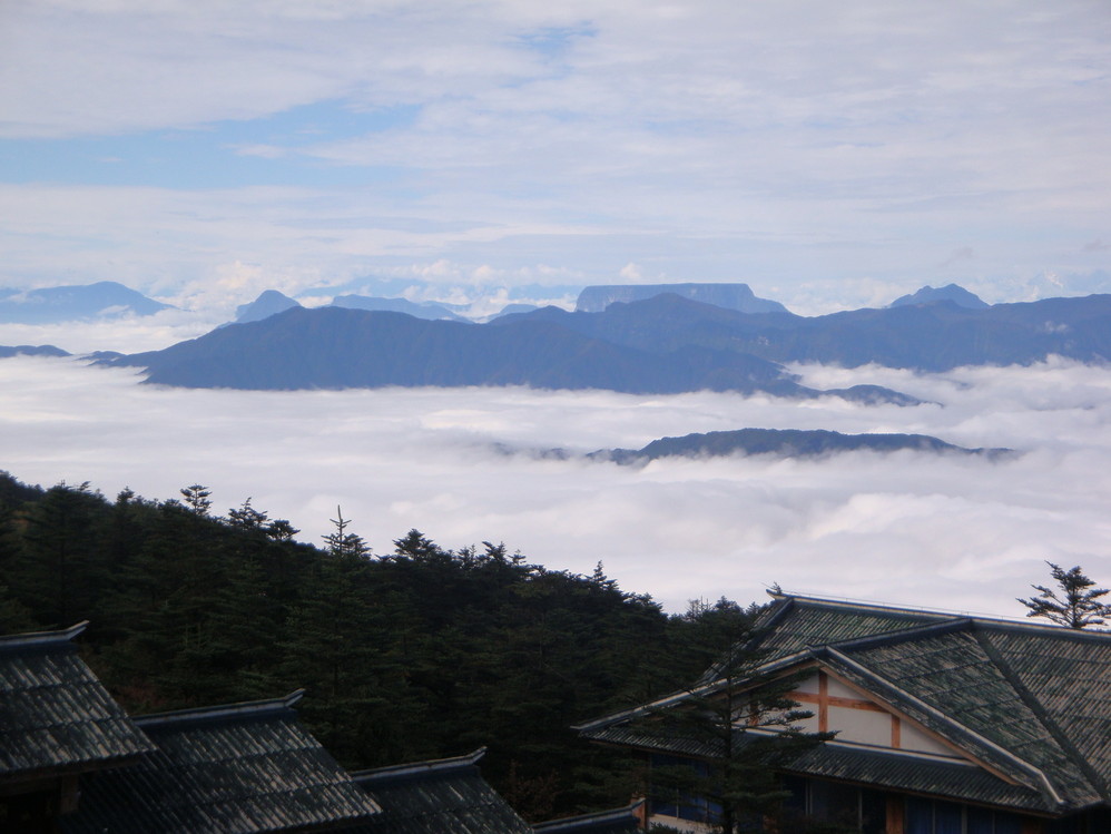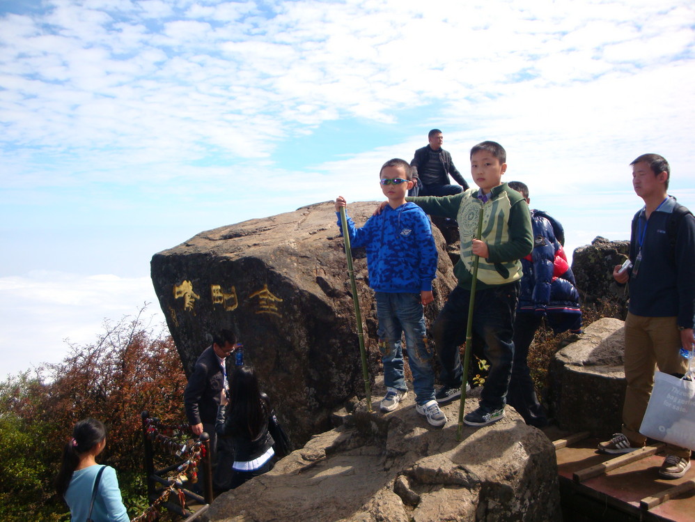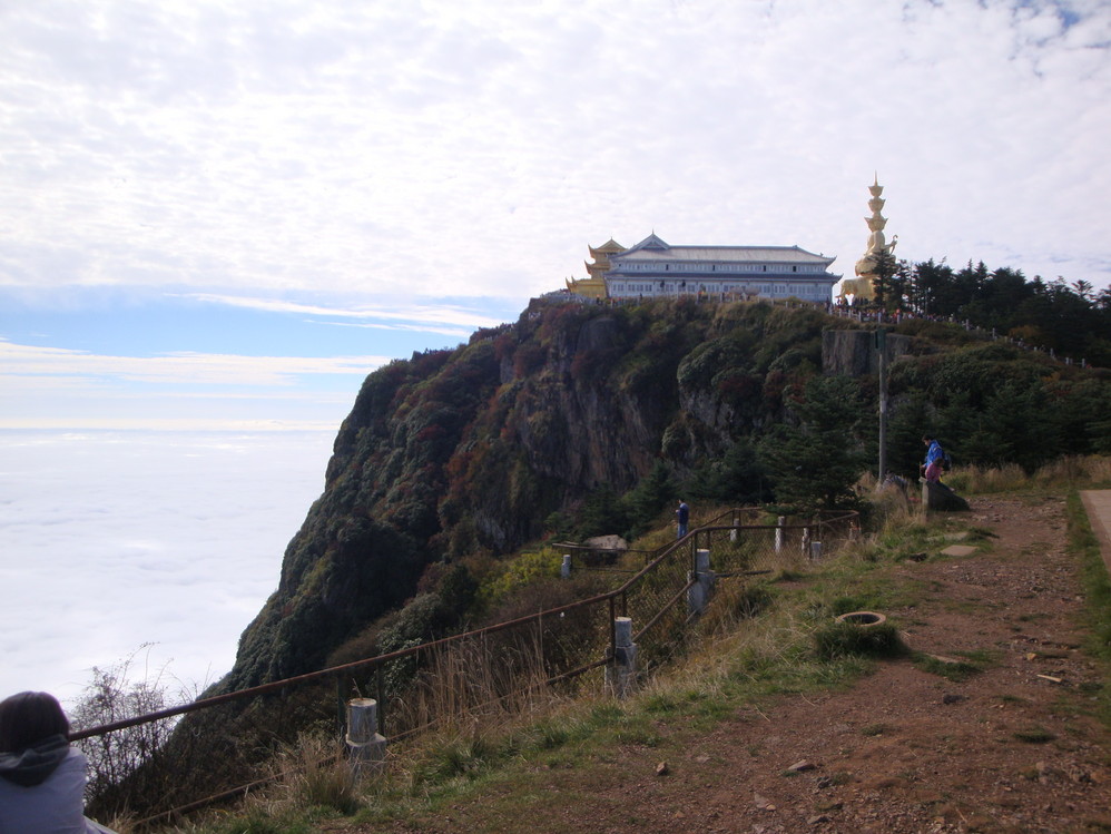 国庆“七天乐”没有安排外出节目,只在附近活动一下。偶尔和铁哥们一家谈起10月5日带孩子上金顶,因两孩子没有上过顶。4日还担心如5日下雨就取消活动。4日晚还在飘着小雨,5日7点起床时,地面部分已干了。于是,匆忙吃过早餐,迅速坐着联系好的面包车,8点钟准时从家里出发了。两个孩子很兴奋,一路上借着弯道夸张的倒来倒去和吼叫着。师傅开车开得快,开得好,老婆在到达零公里前就吐了两次。不过,吐了好像还好受多了。汽车爬到零公里时,我们已经隐约的感觉出今天山上的天气很不一般的好。过了零公里往上走的时候,沿路已经很多次的感受阳光普照。连续多天的小雨清洗天空,一切特别的清晰,久违的峨眉山美景呈现在眼前。都5日了,一路上汽车和游客一个也不见少,呈拥挤状态。