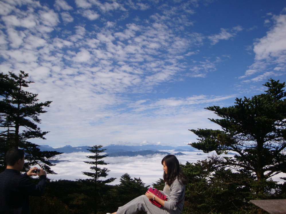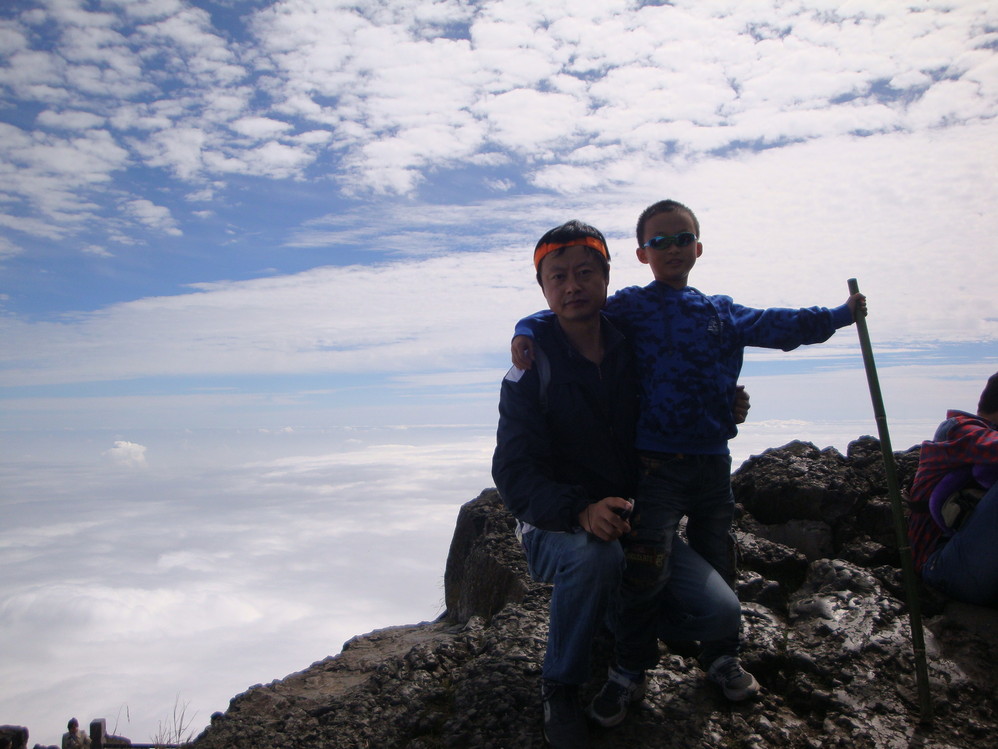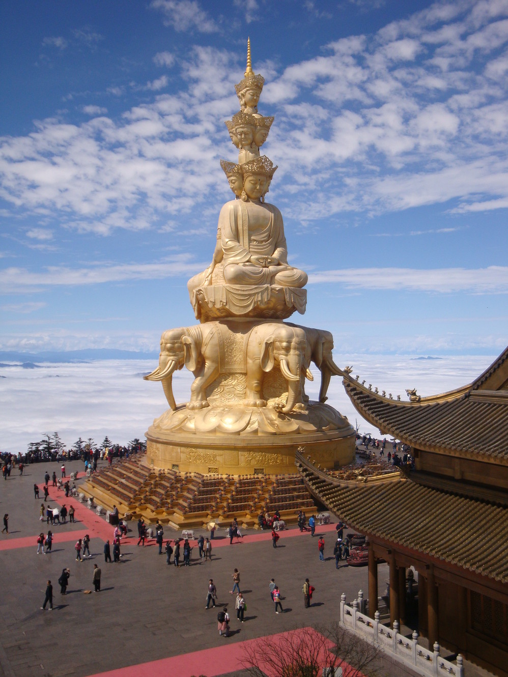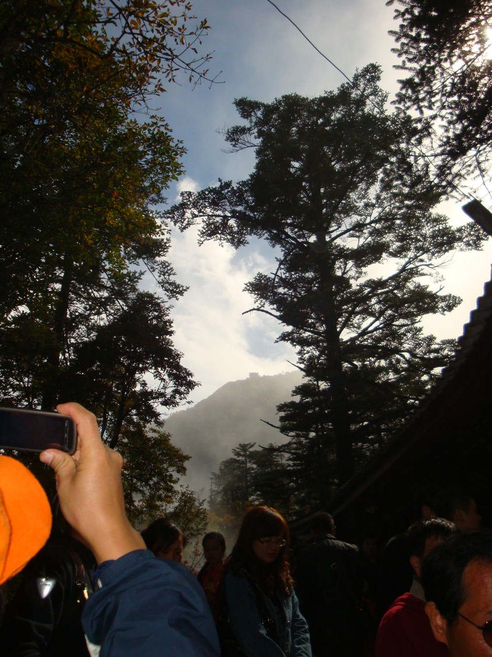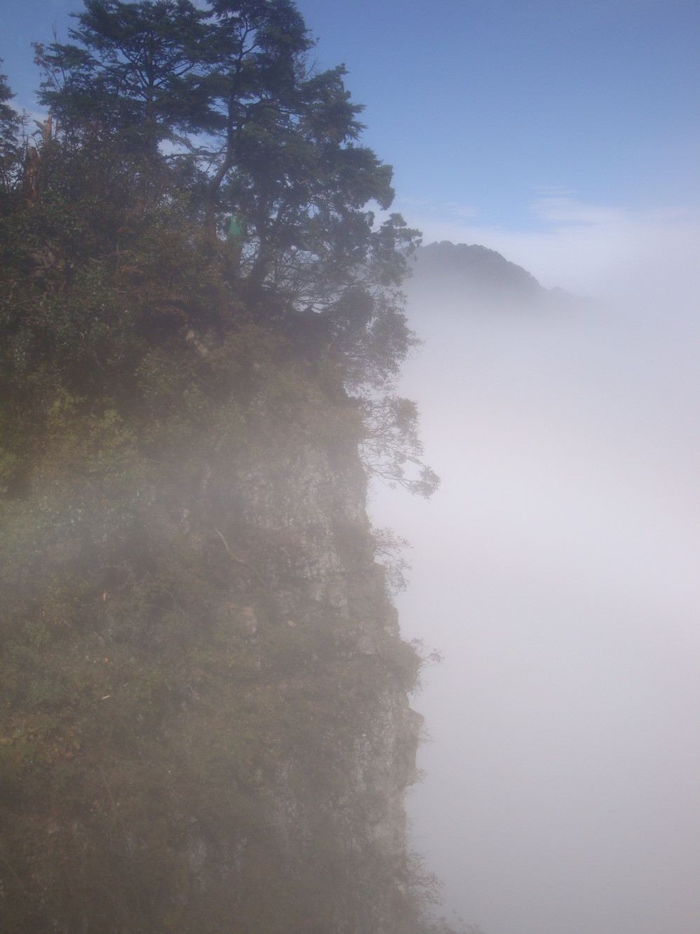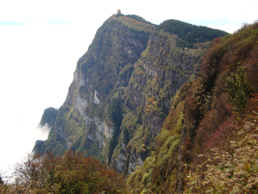 国庆“七天乐”没有安排外出节目,只在附近活动一下。偶尔和铁哥们一家谈起10月5日带孩子上金顶,因两孩子没有上过顶。4日还担心如5日下雨就取消活动。4日晚还在飘着小雨,5日7点起床时,地面部分已干了。于是,匆忙吃过早餐,迅速坐着联系好的面包车,8点钟准时从家里出发了。两个孩子很兴奋,一路上借着弯道夸张的倒来倒去和吼叫着。师傅开车开得快,开得好,老婆在到达零公里前就吐了两次。不过,吐了好像还好受多了。汽车爬到零公里时,我们已经隐约的感觉出今天山上的天气很不一般的好。过了零公里往上走的时候,沿路已经很多次的感受阳光普照。连续多天的小雨清洗天空,一切特别的清晰,久违的峨眉山美景呈现在眼前。都5日了,一路上汽车和游客一个也不见少,呈拥挤状态。