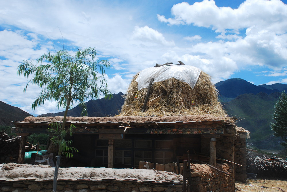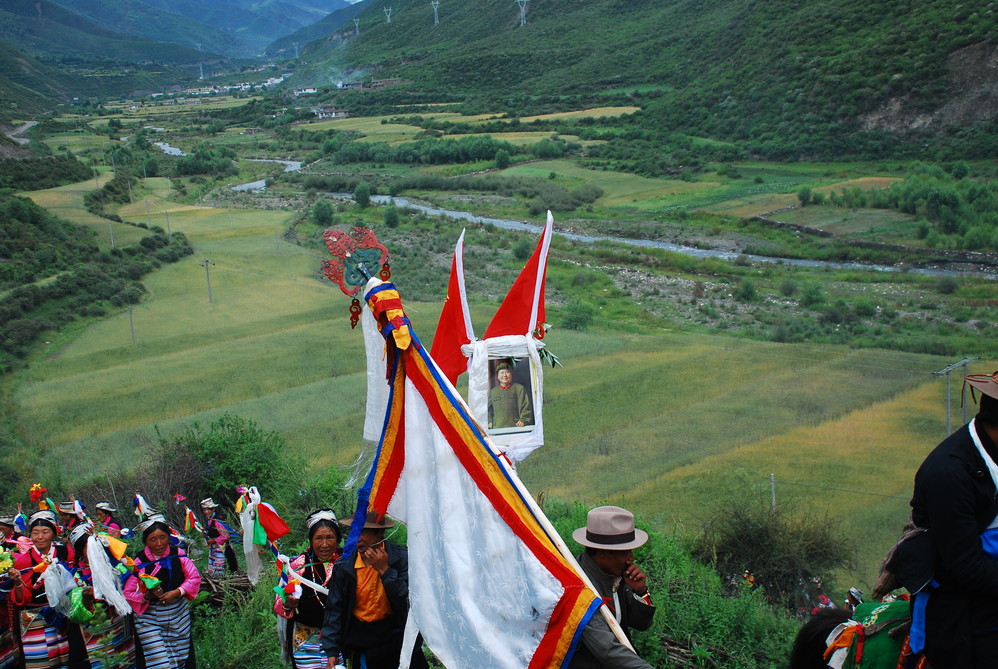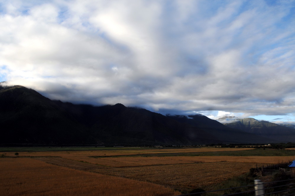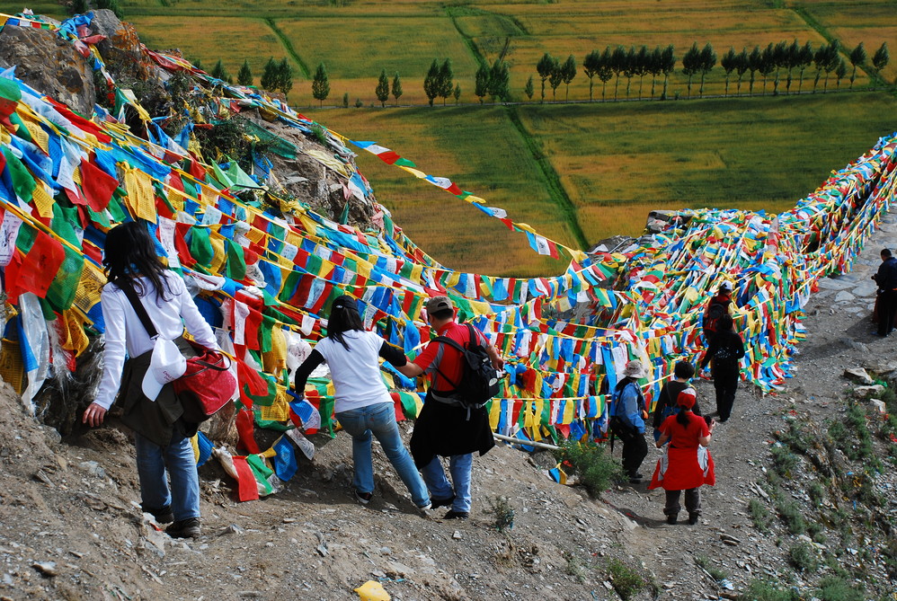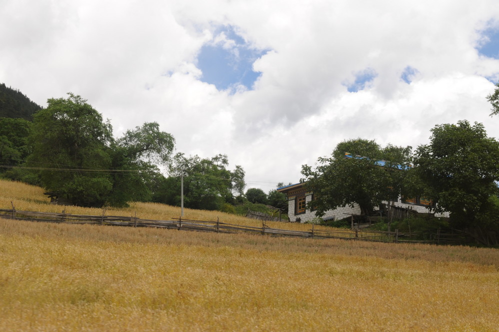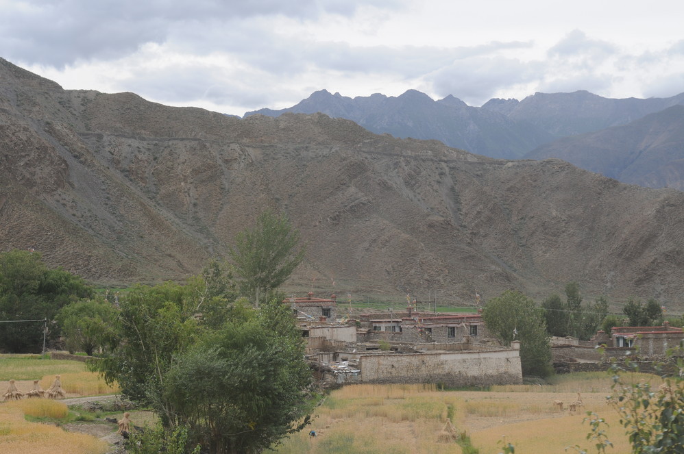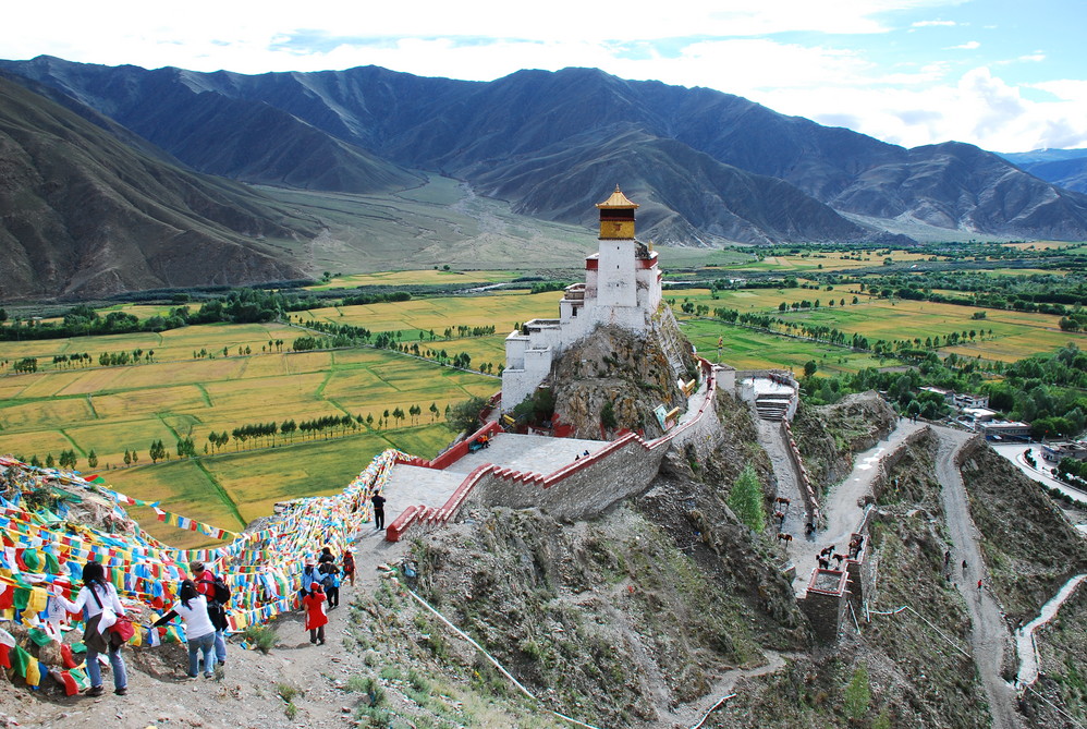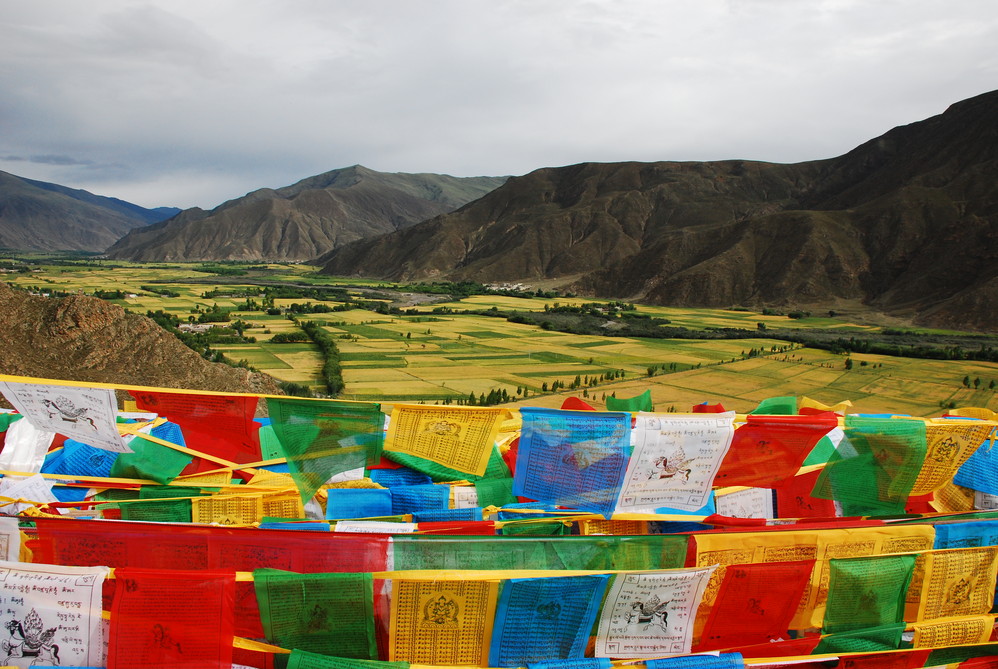 雍布拉康上的经幡,在经幡庇护下丰收的田地